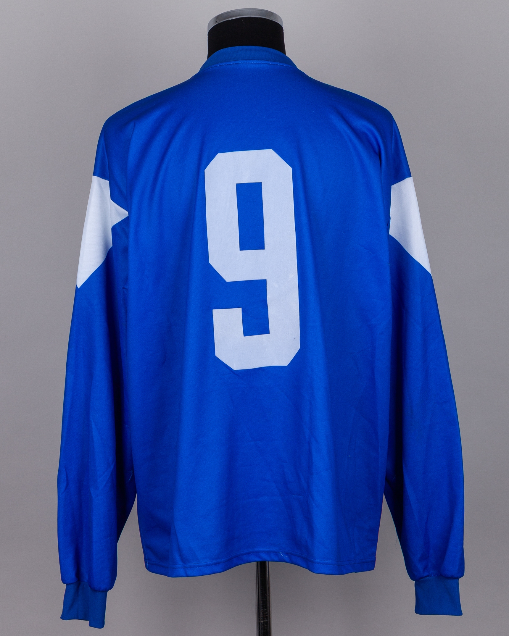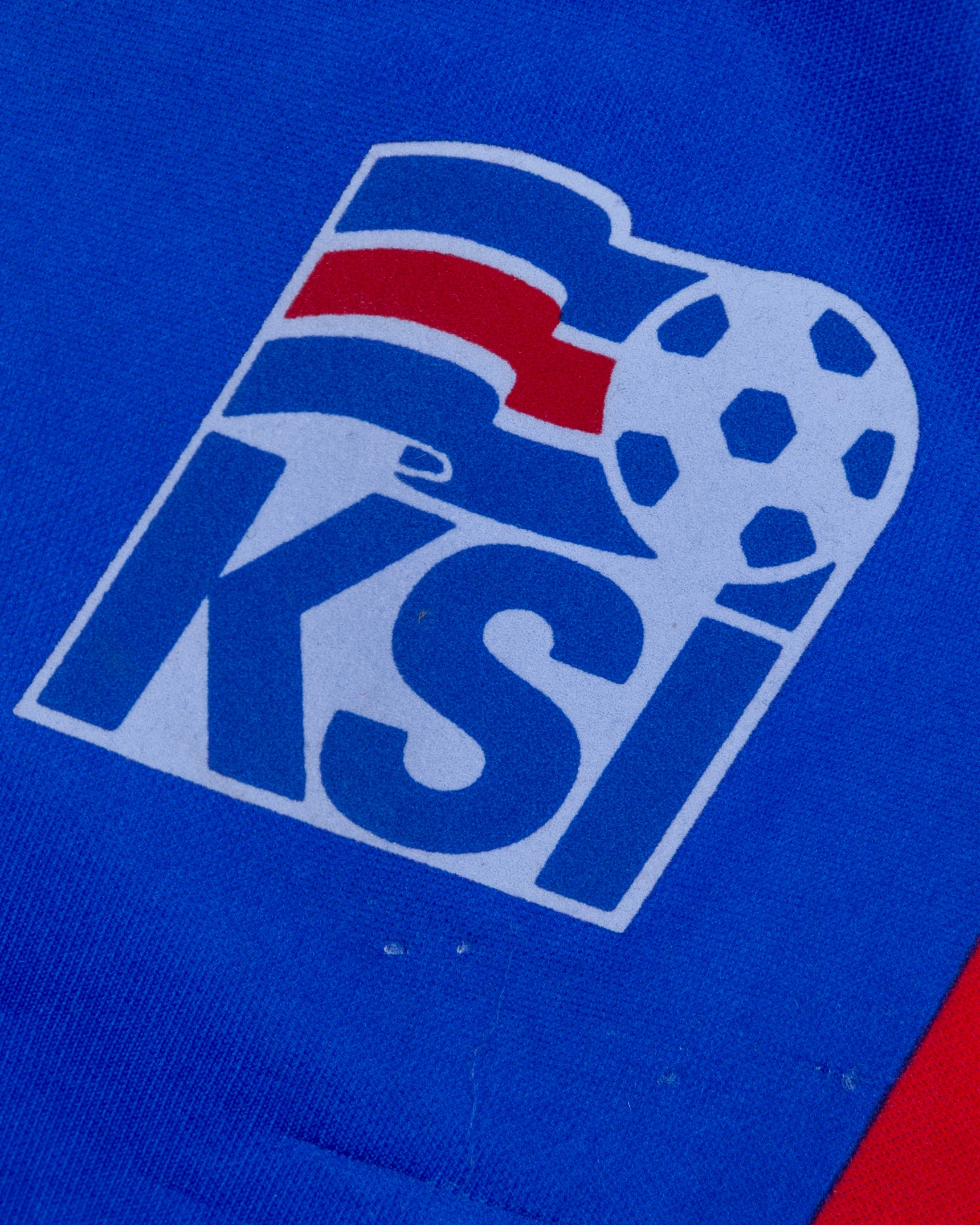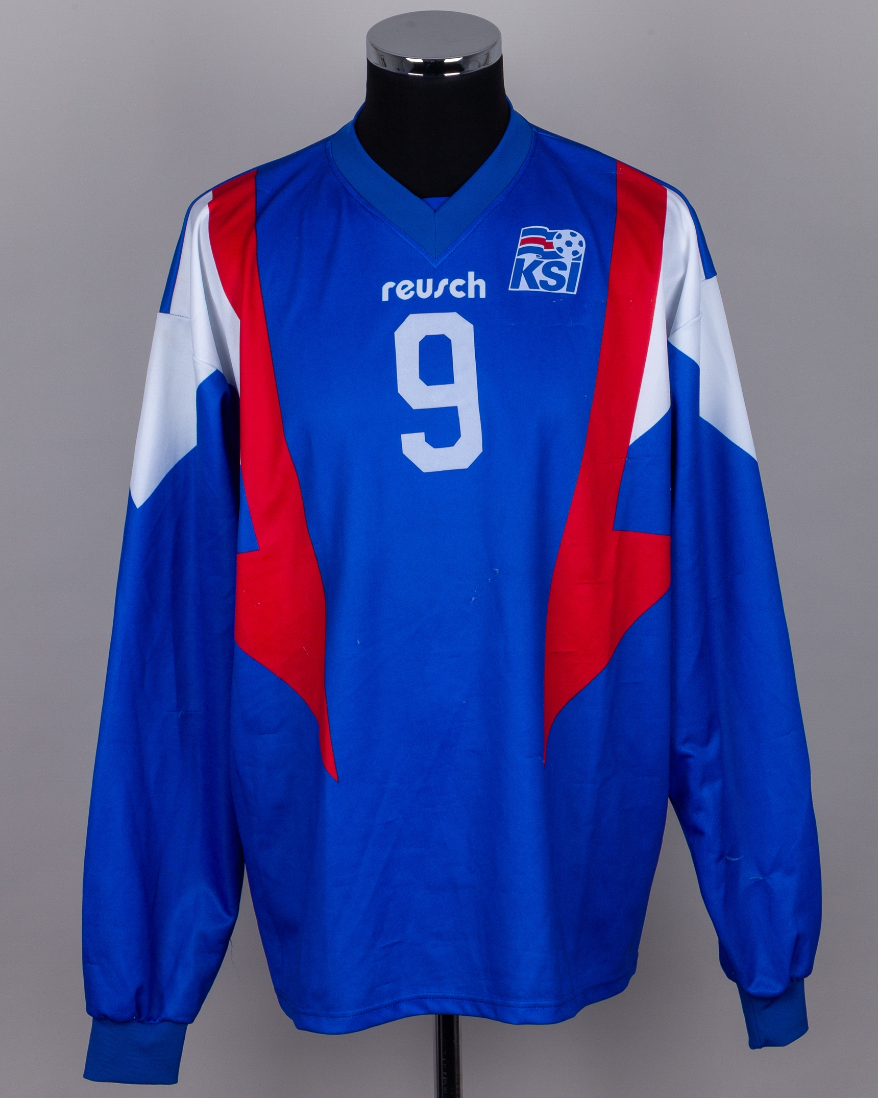 Blue, red and white No. 9 Iceland v. Sweden long-sleeved shirt, 2000, Resuch, XXL, with v-neck collar and printed badge, some staining and shirt pulls