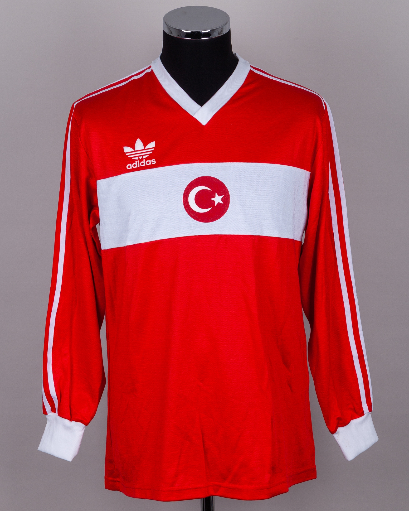 Red and white No.10 Turkey long-sleeved shirt, 1992, Adidas. with v-neck collar and felt badge