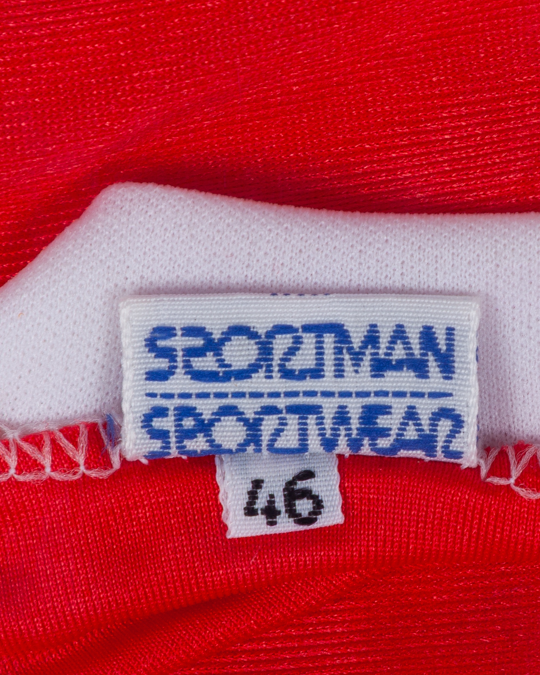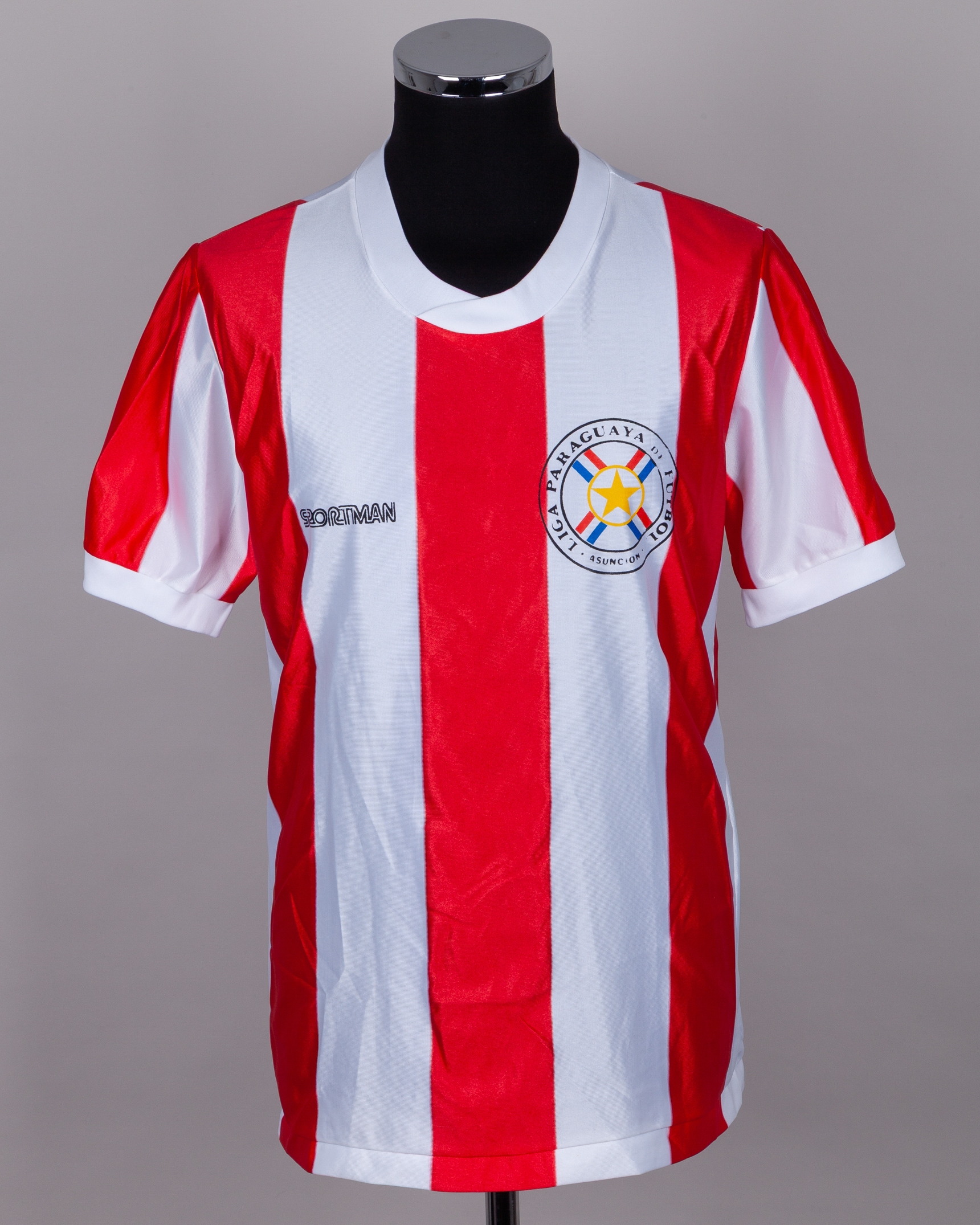 Red and white No.16 Paraguay v. Sporting Lisbon short-sleeved shirt, 1988, Sportman, 46, with crew-neck collar and printed badge