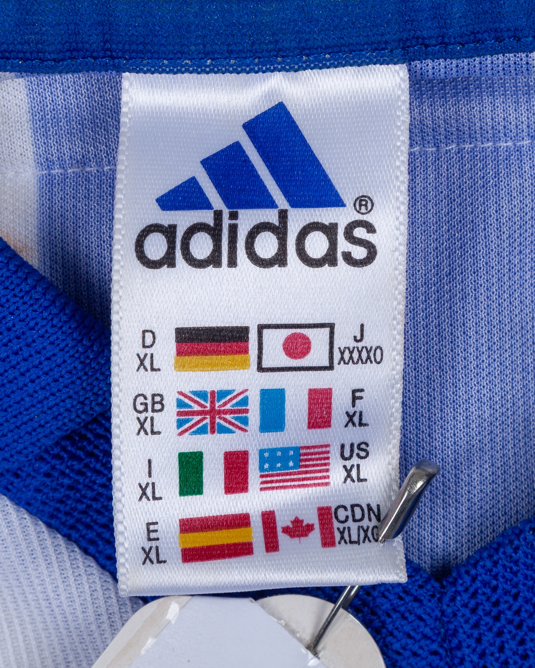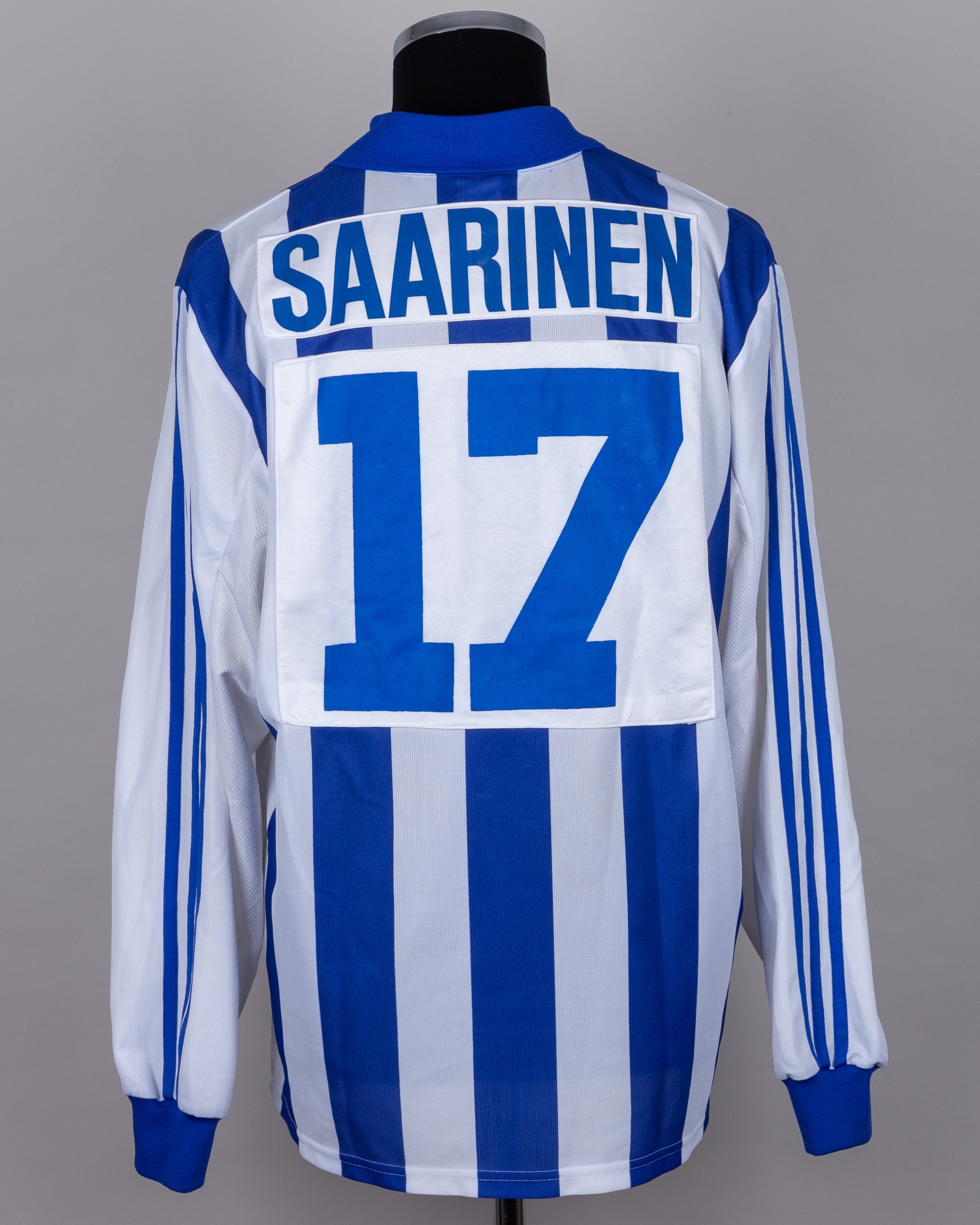 Janne Saarinen blue and white No.17 HJK Helsinki v. Celtic long-sleeved shirt, 2000, Adidas, XL, with v-neck collar and felt badge, the reverse lettered SAARINEN