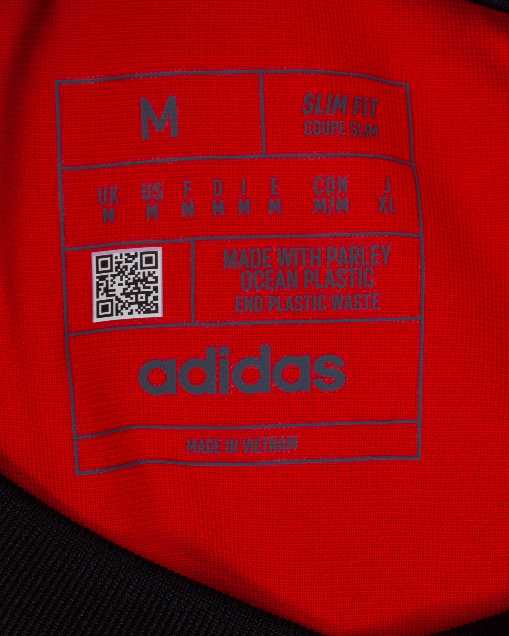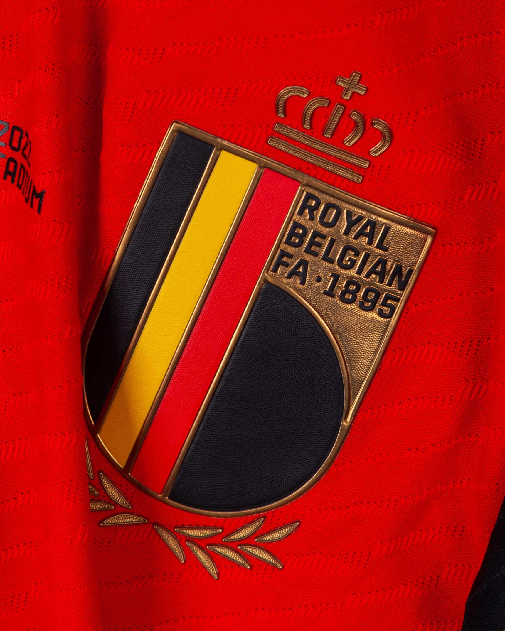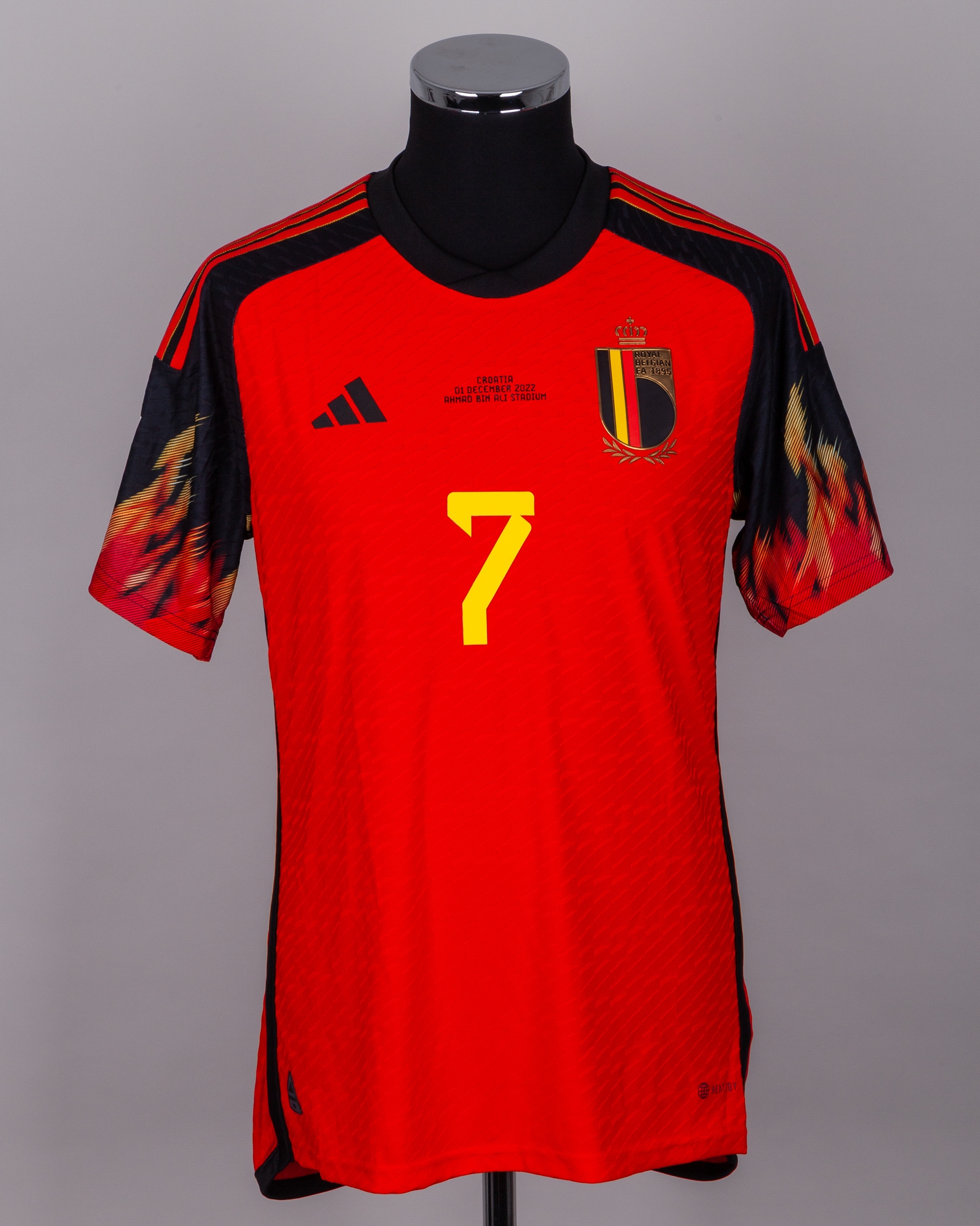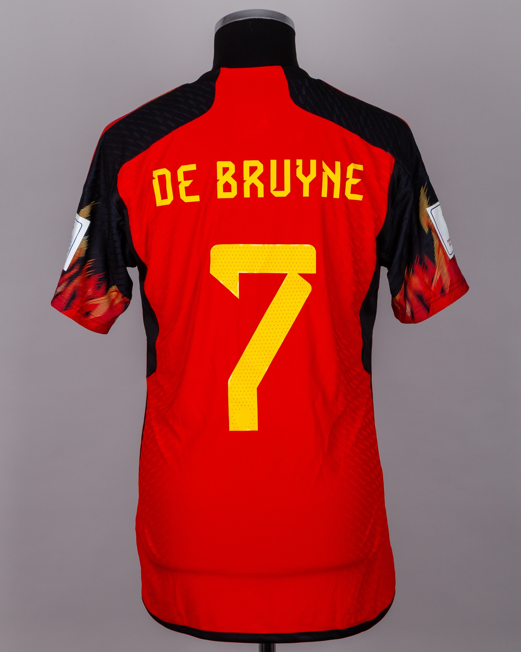 Kevin De Bruyne red and black No.7 Belgium v. Croatia short-sleeved shirt, 2022, Adidas, M, with crew-neck collar and printed badge, with CROATIA 01 DECEMBER 2022 AHMAD BIN ALI STADIUM decal, the reverse lettered DE BRUYNE, the right sleeve with FIFA World Cup Qatar 2022 flash and the left with Football Unites flash