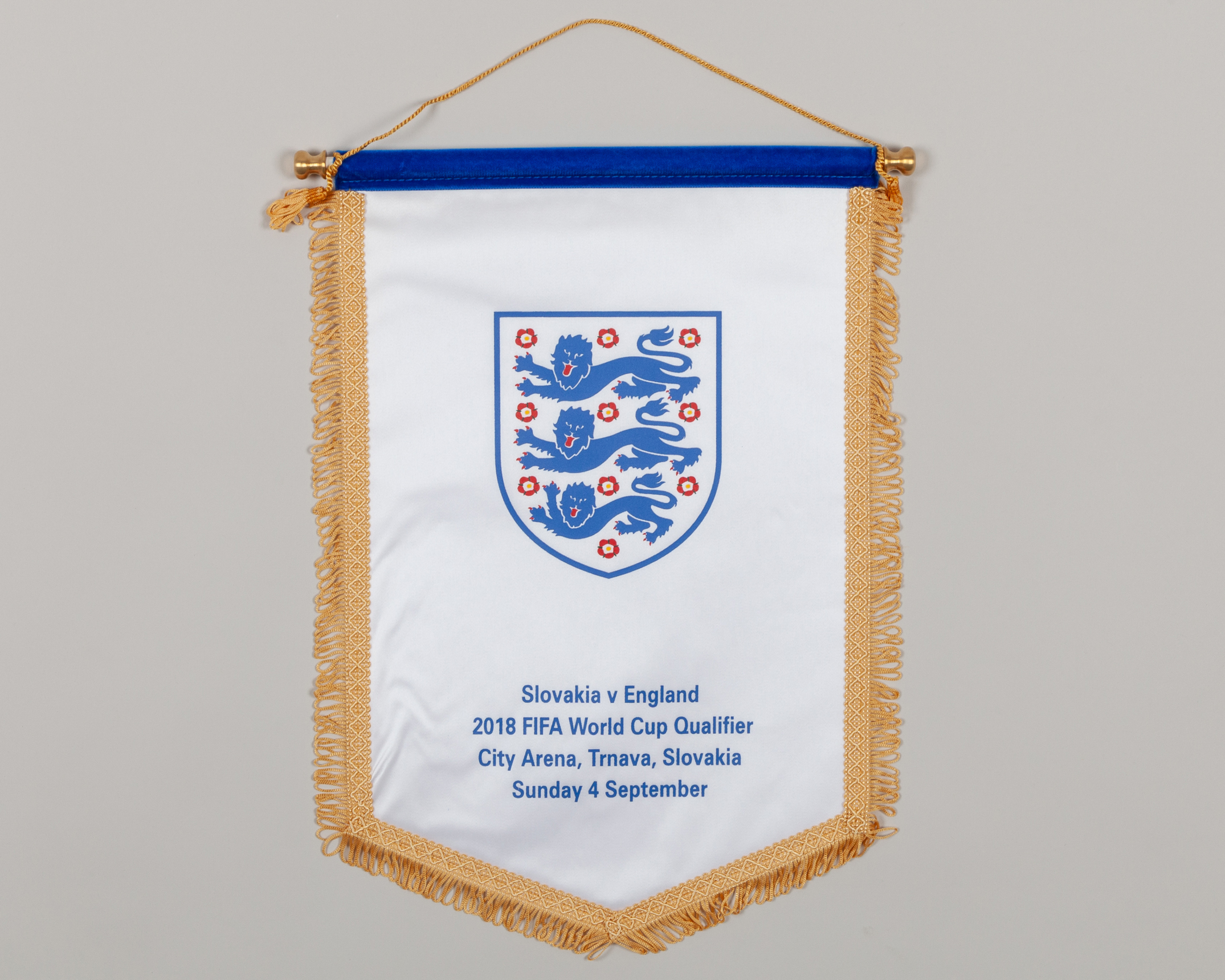 White and blue England v. Slovakia pennant, with printed badge and Slovakia v England 2018 FIFA World Cup Qualifier City Arena, Trnava, Slovakia Sunday 4 September decal, with hanging bar, 43cm high
