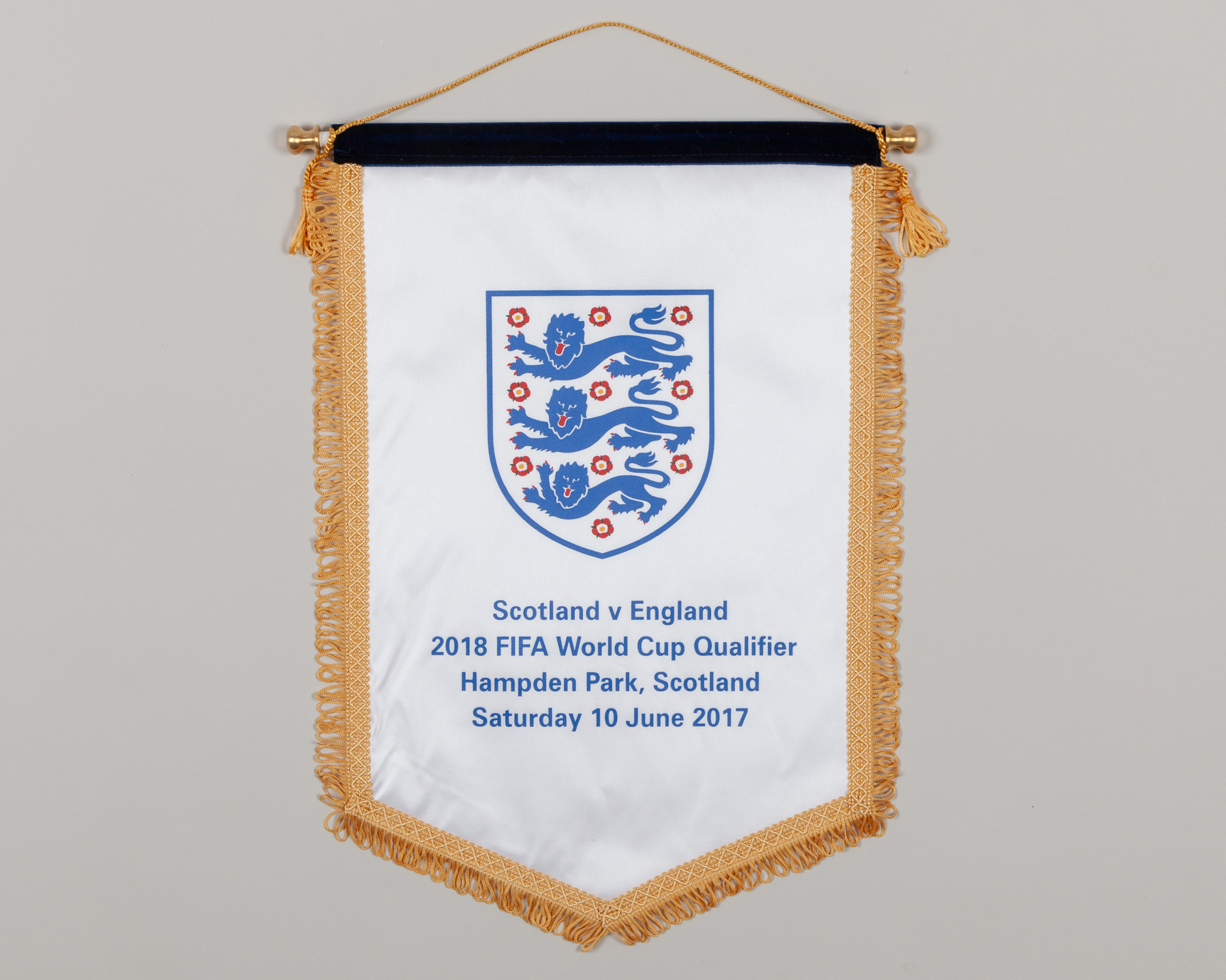 White and blue England v. Scotland pennant, 2017, with printed badge and Scotland v England 2018 FIFA World Cup Qualifier Hampden Park, Scotland Saturday 10 June 2017 decal, with hanging bar, 43cm high