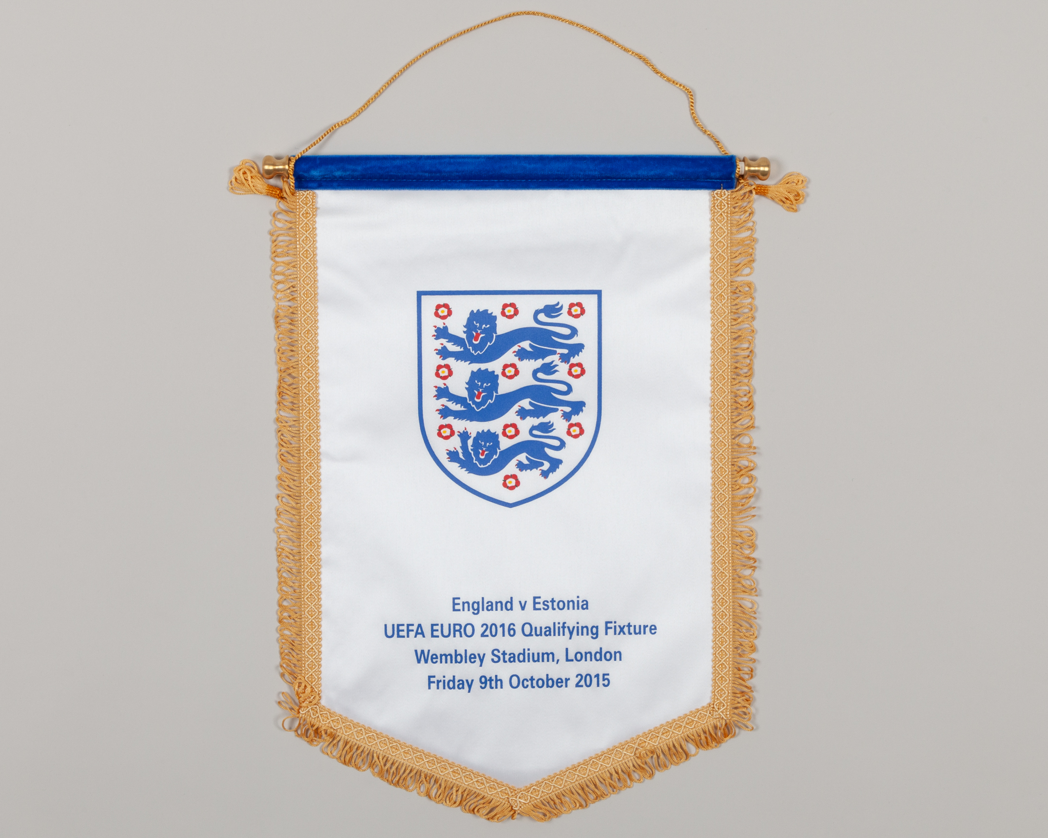 White and blue England v. Estonia pennant, 2015, with printed badge and England v Estonia UEFA EURO 2016 Qualifying Fixture Wembley Stadium, London Friday 9th October 2015 decal, with hanging bar, 43cm high