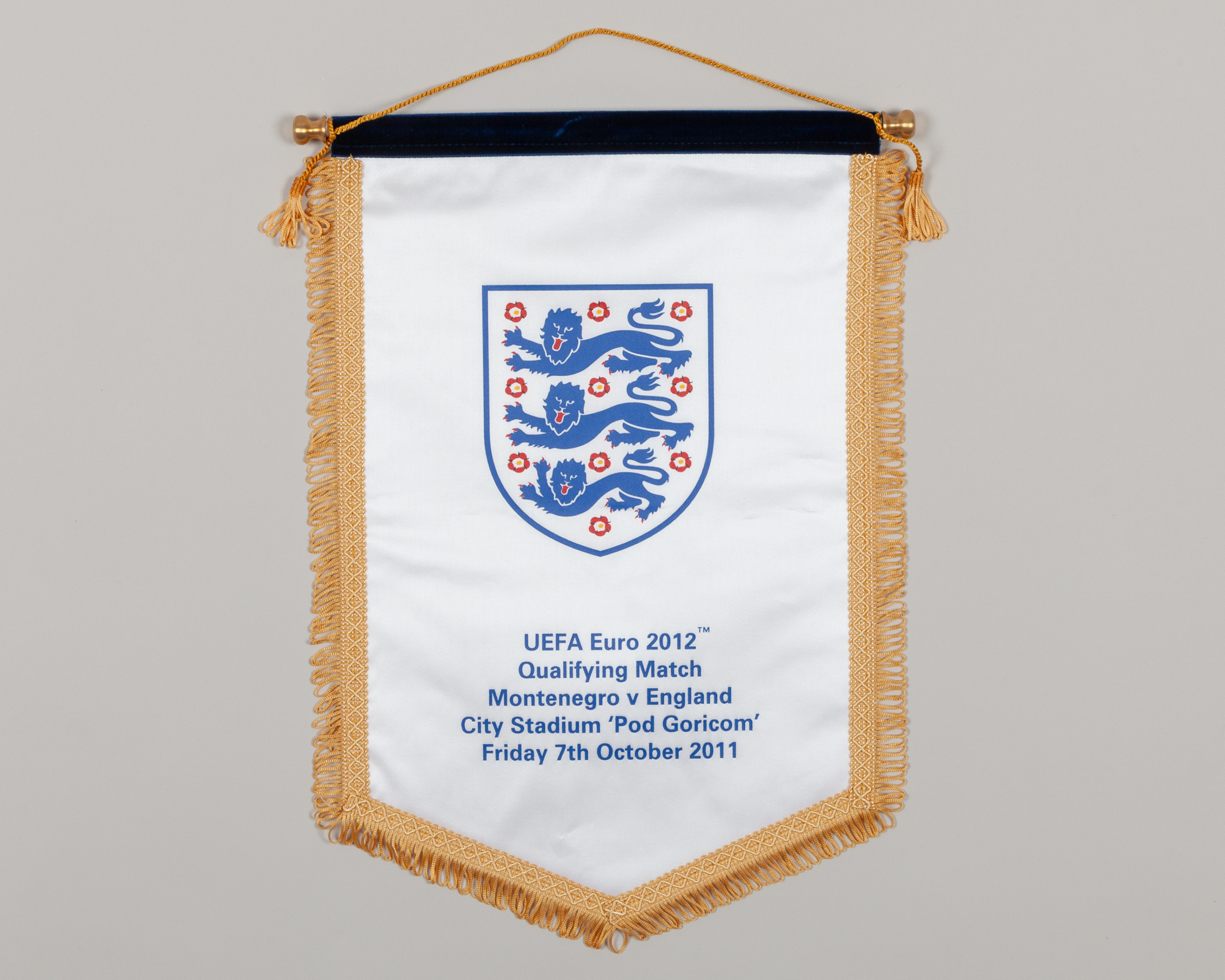 White and blue England v. Montenegro pennant, 2011, with printed badge and UEFA Euro 2012 Qualifying Match Montenegro v England City Stadium ‘Pod Goricom’ Friday 7th October 2011 decal, with hanging bar, 43cm high