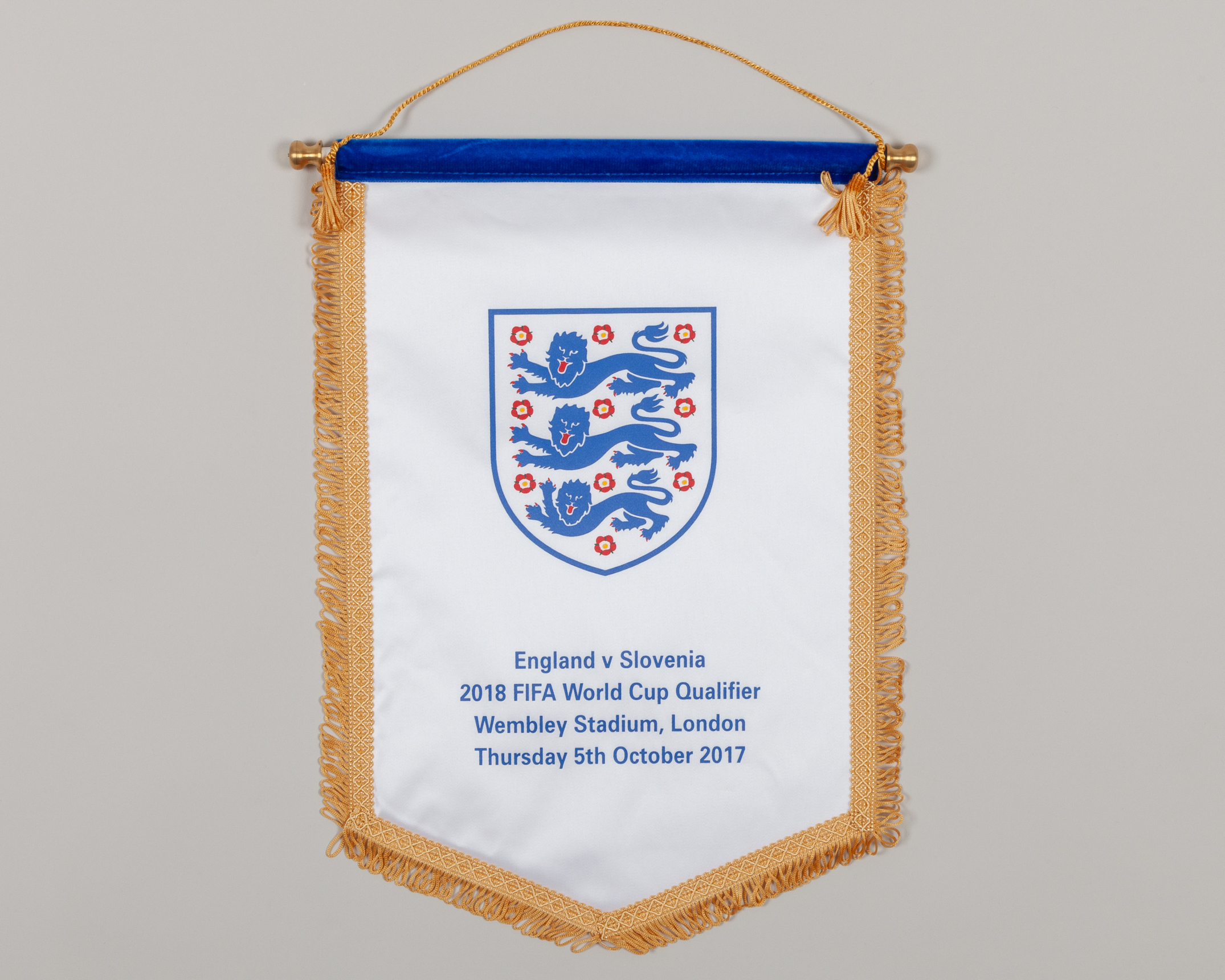 White and blue England v. Slovenia pennant, 2017, with printed badge and England v Slovenia 2018 FIFA World Cup Qualifier Wembley Stadium, London Thursday 5th October 2017 decal, with hanging bar, 43cm high