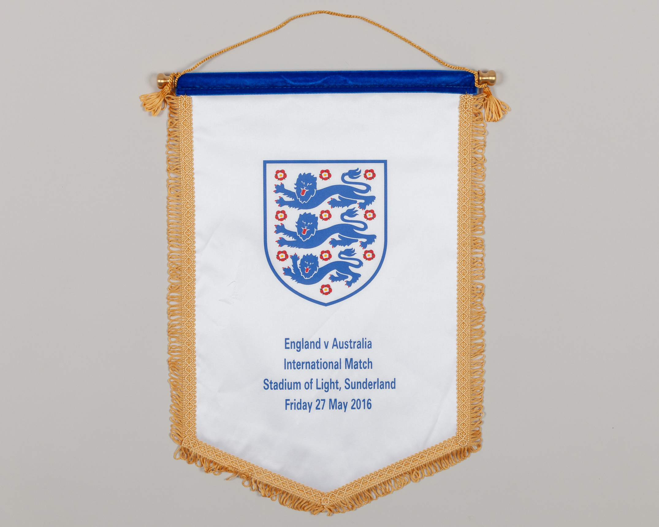 White and blue England v. Australia pennant, 2016, with printed badge and England v Australia International Match Stadium of Light, Sunderland Friday 27 May 2016 decal, with hanging bar, 43cm high