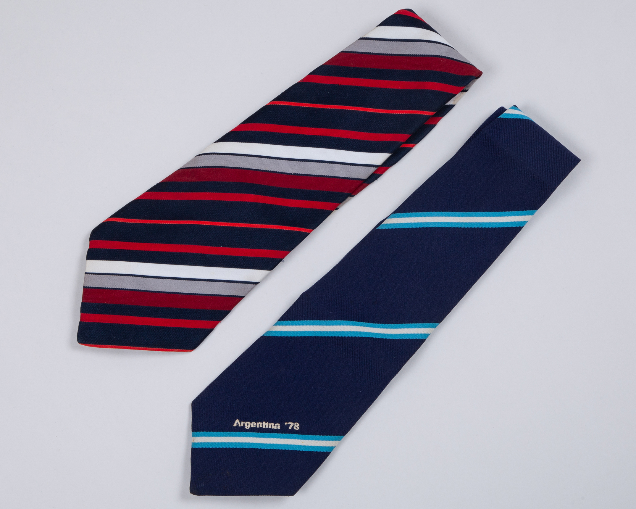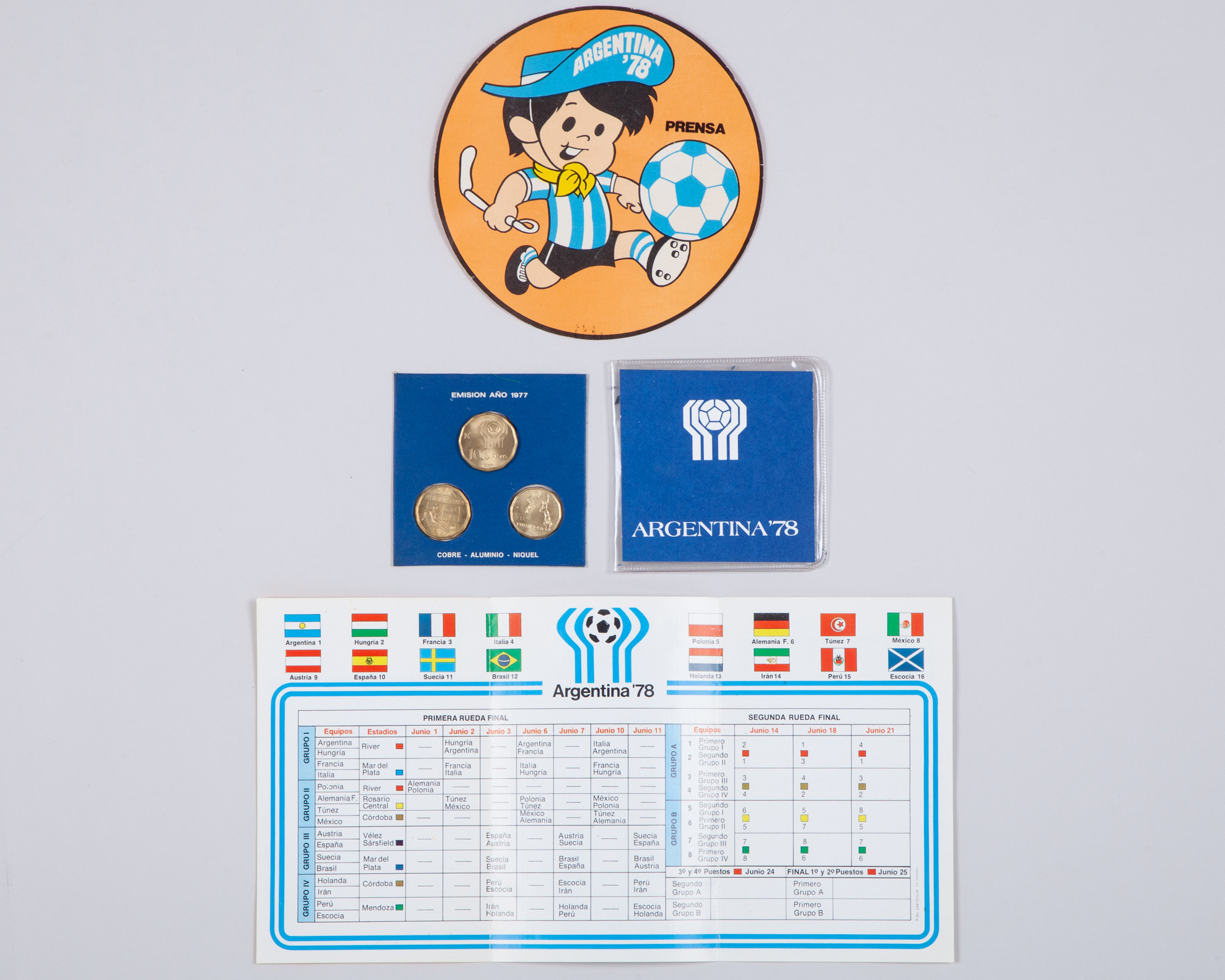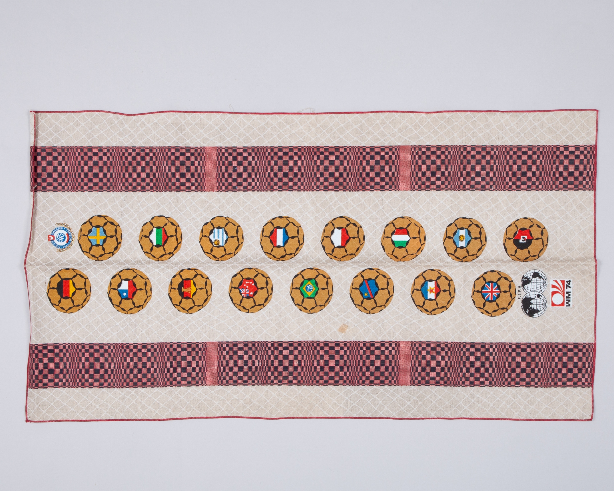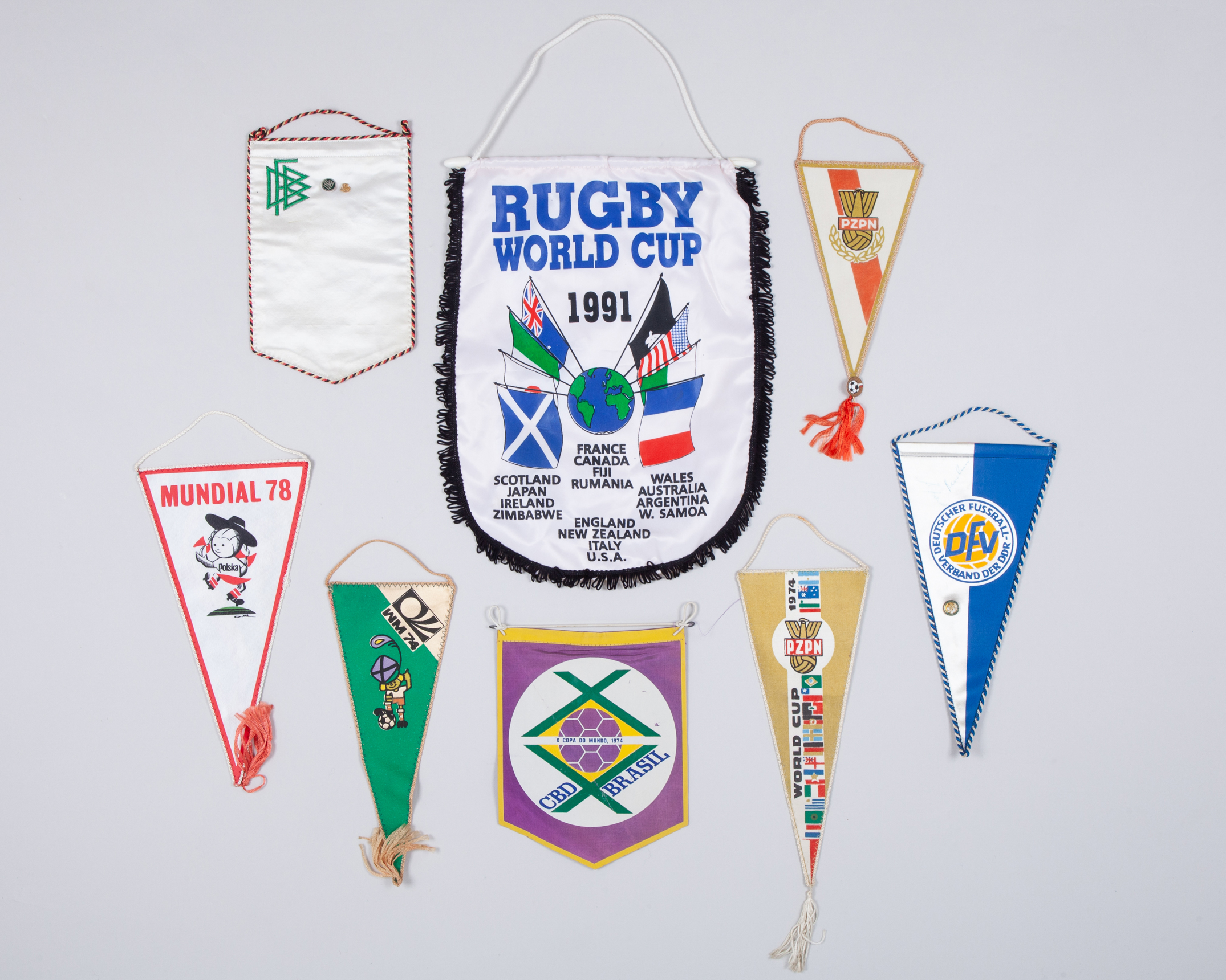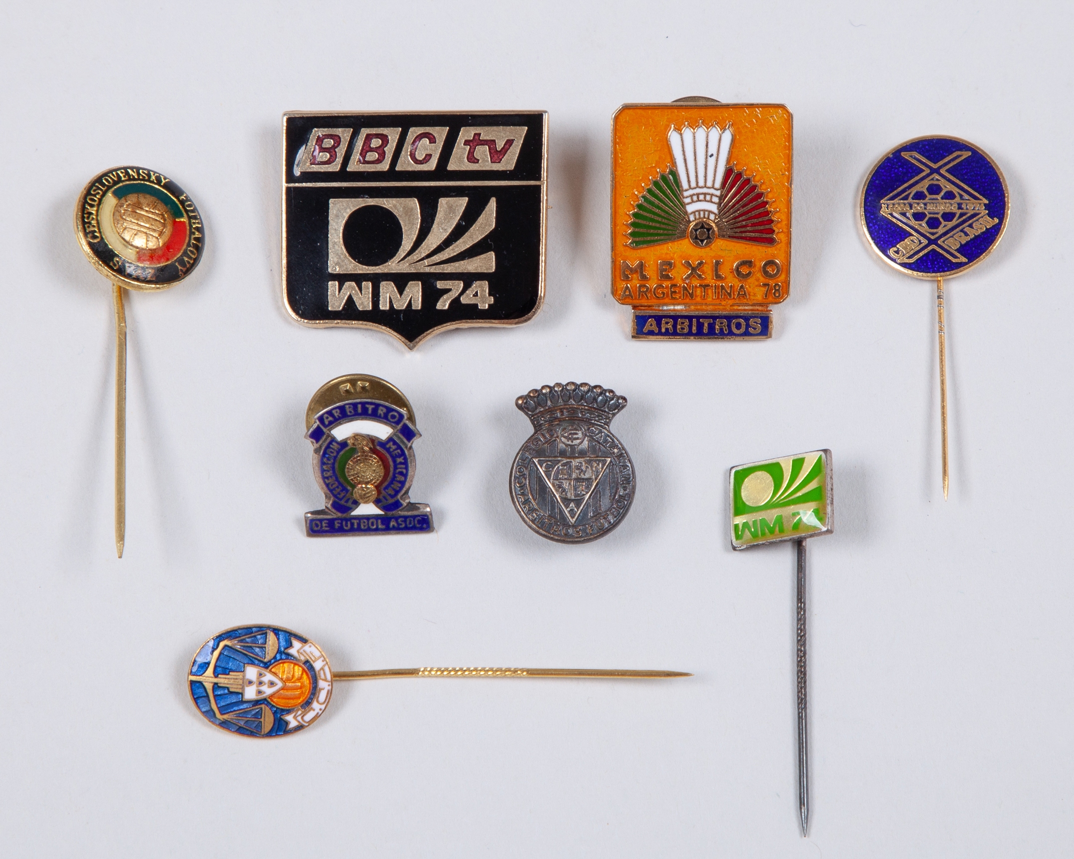 A collection of World Cup supporters pennants, tea towels, neck ties etc including 1974, 1978, and twelve enamel lapel badges including World Cup examples