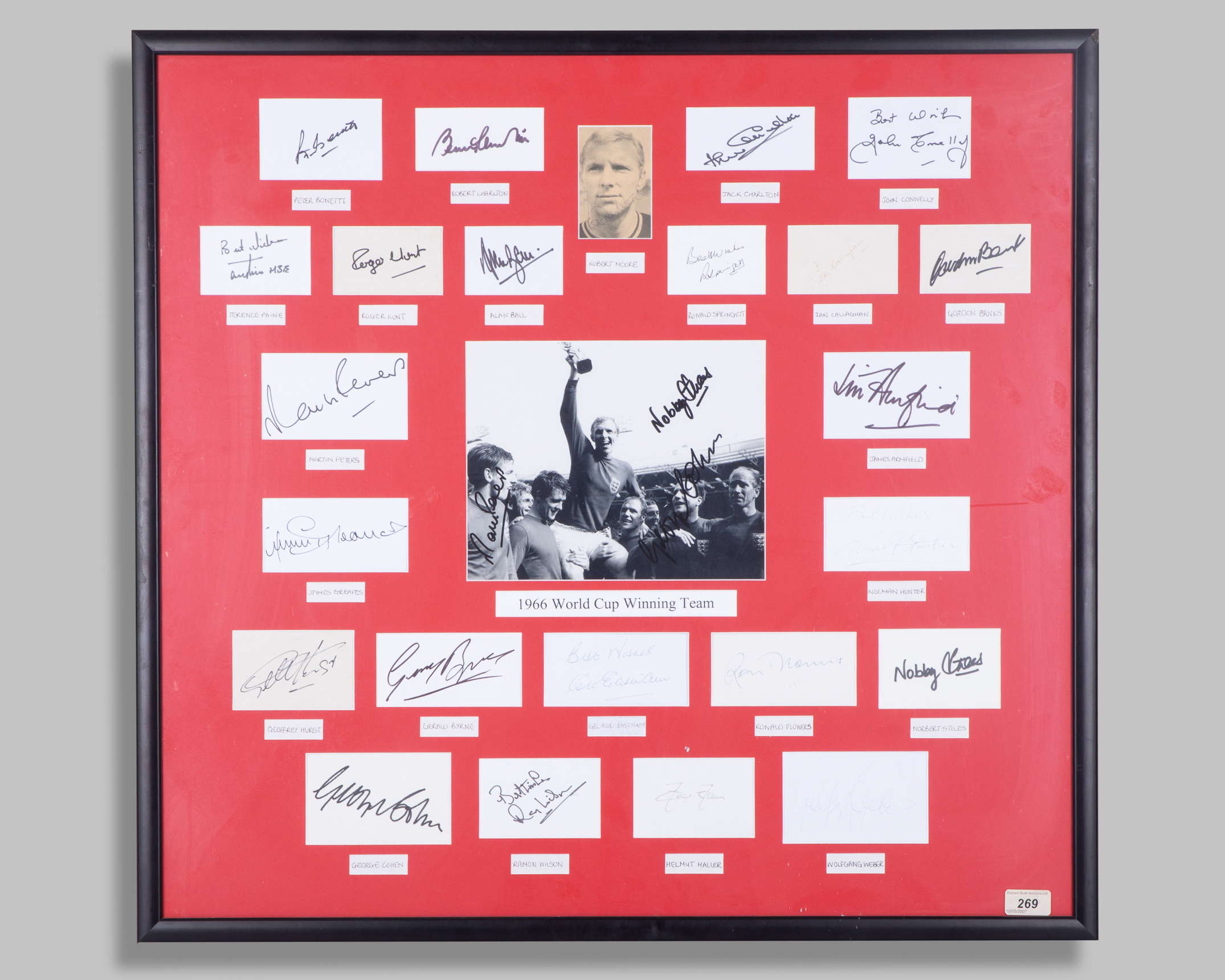 A collection of 1966 World Cup player autographs display, with twenty-eight autographs including Bobby Moore, Helmut Haller, Bobby Charlton, Nobby Stiles and Alan Ball etc., framed and glazed, 80x76cm