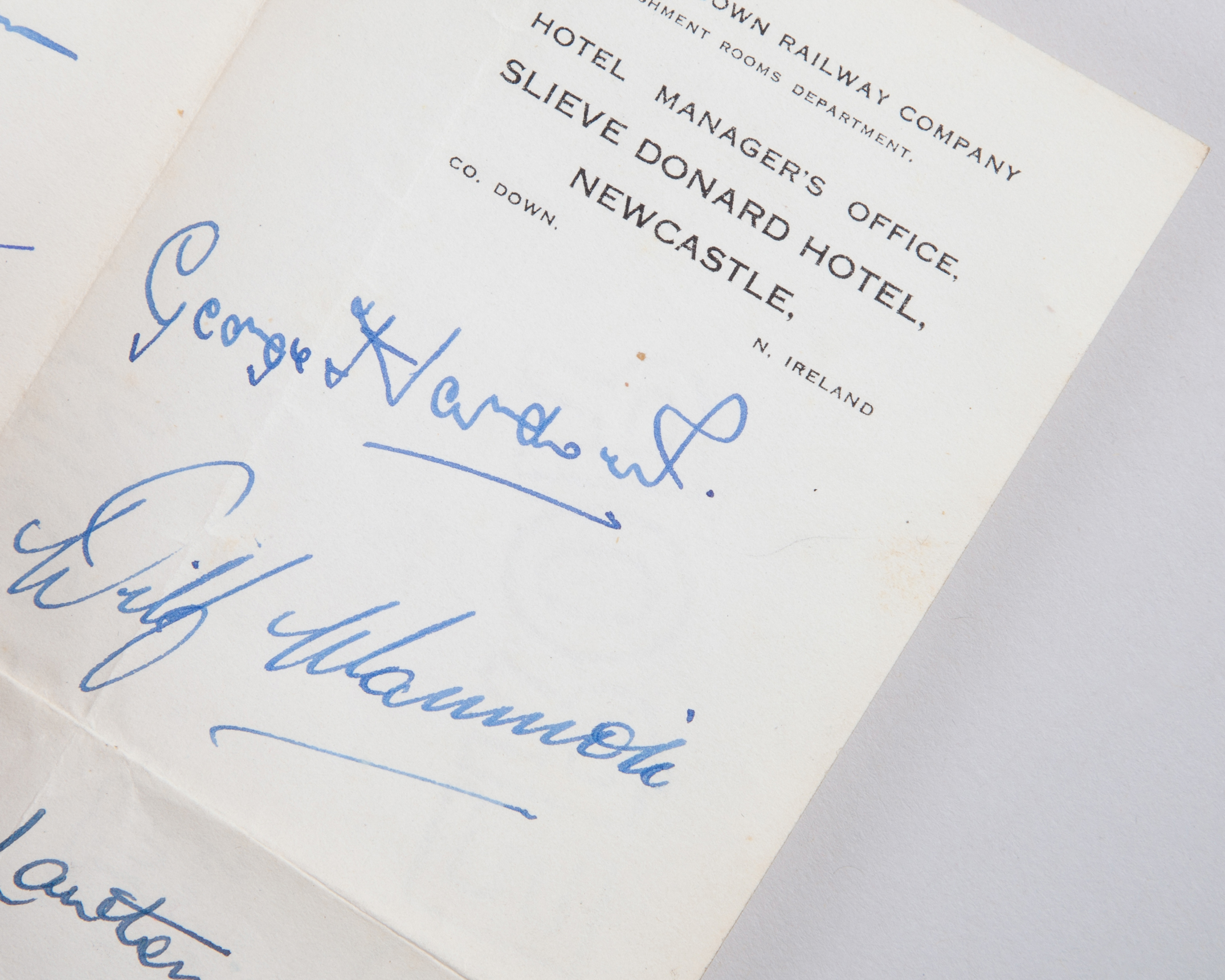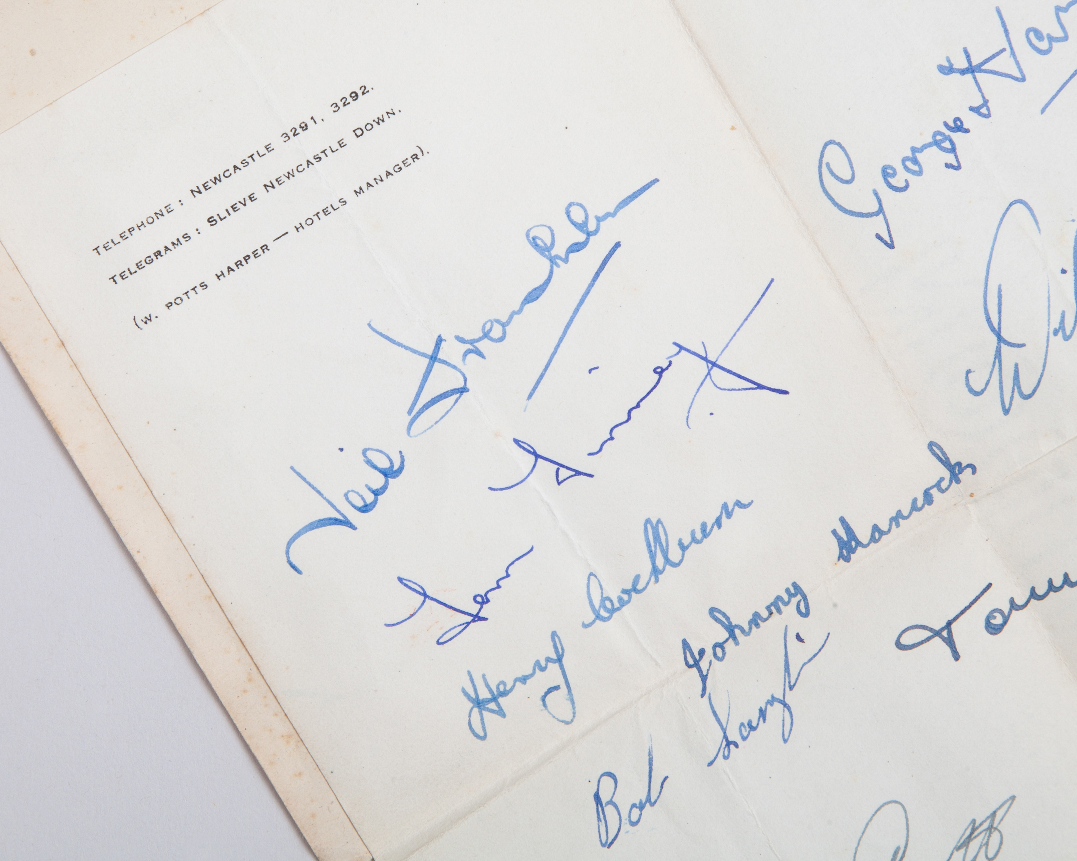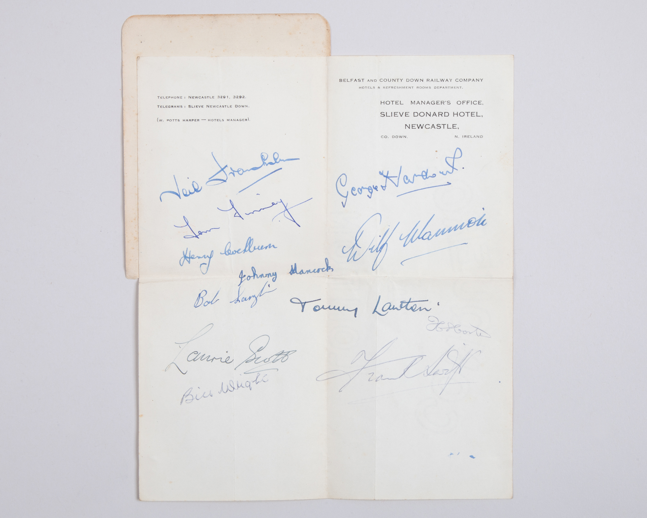 England v. Northern Ireland 1946- page of England autographs on Slieve Donard Hotel headed paper, bearing twelve England autographs including debutant Billy Wright