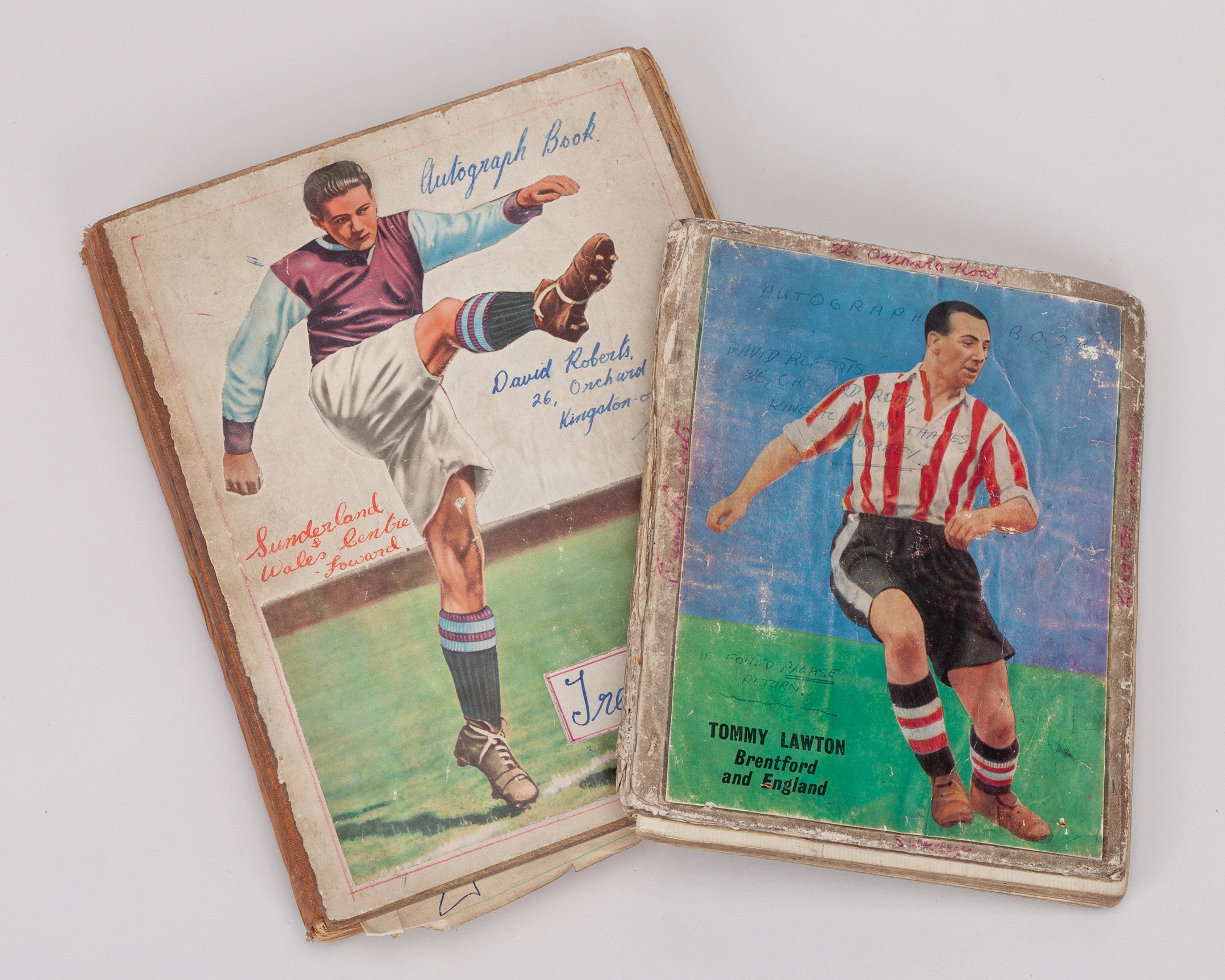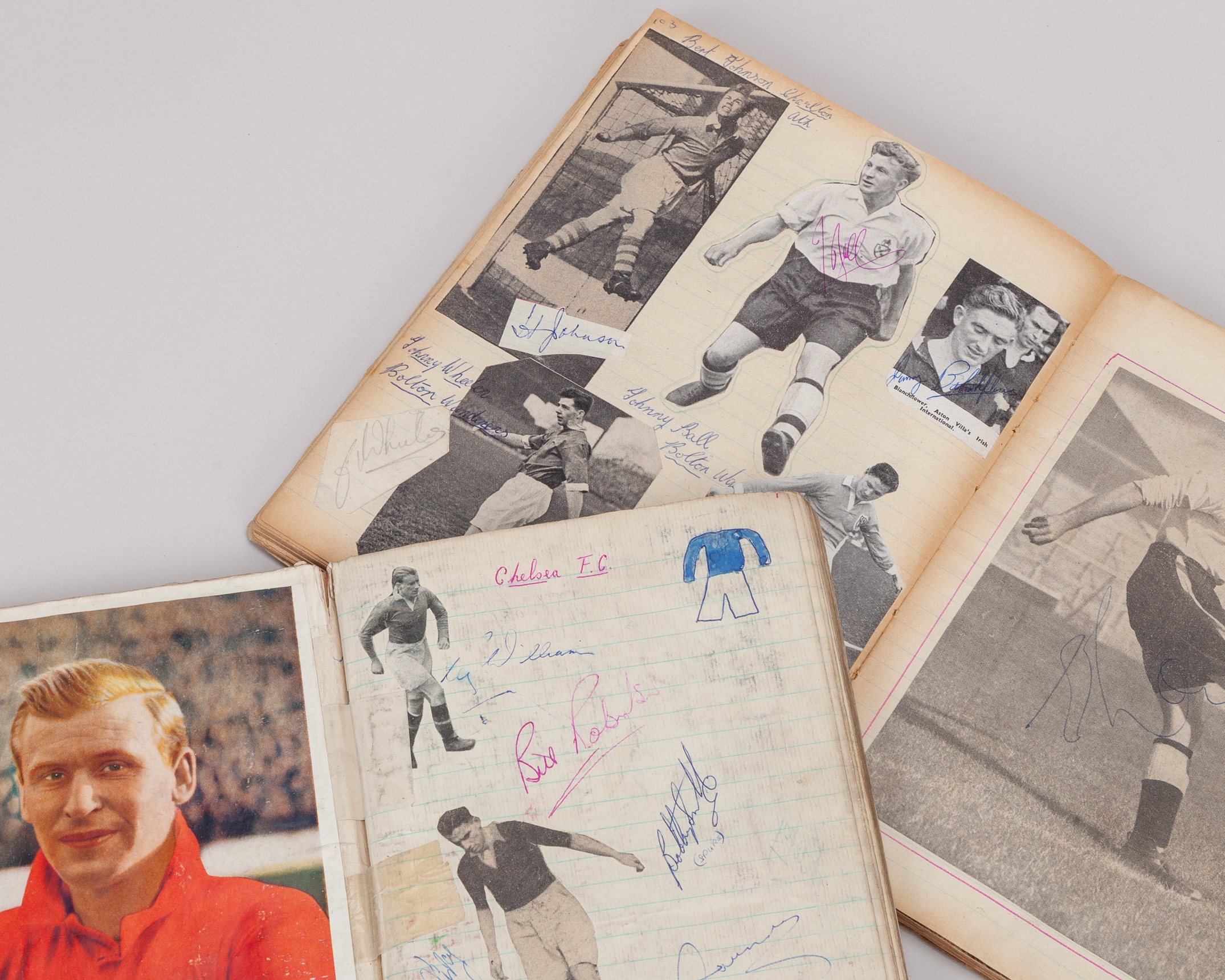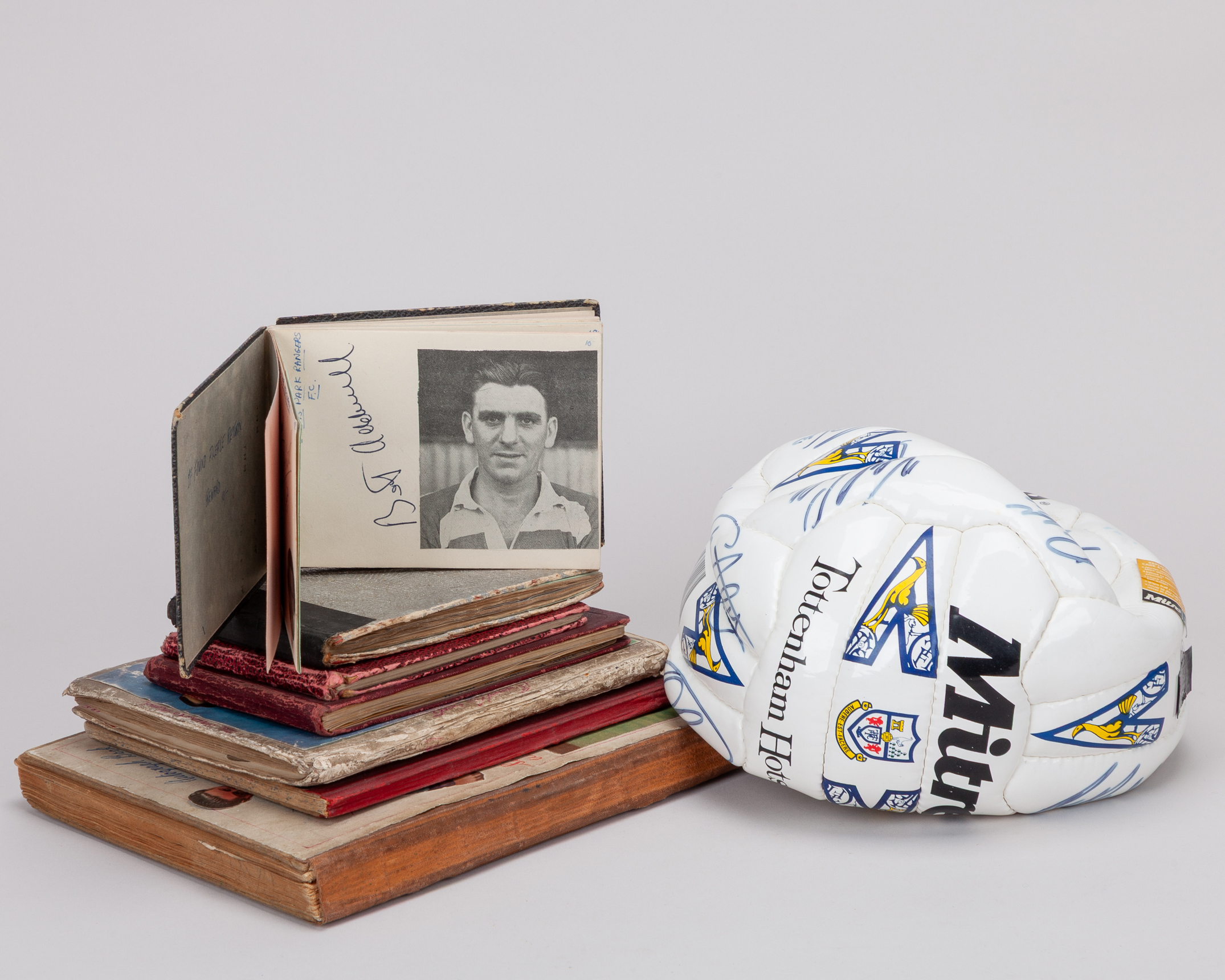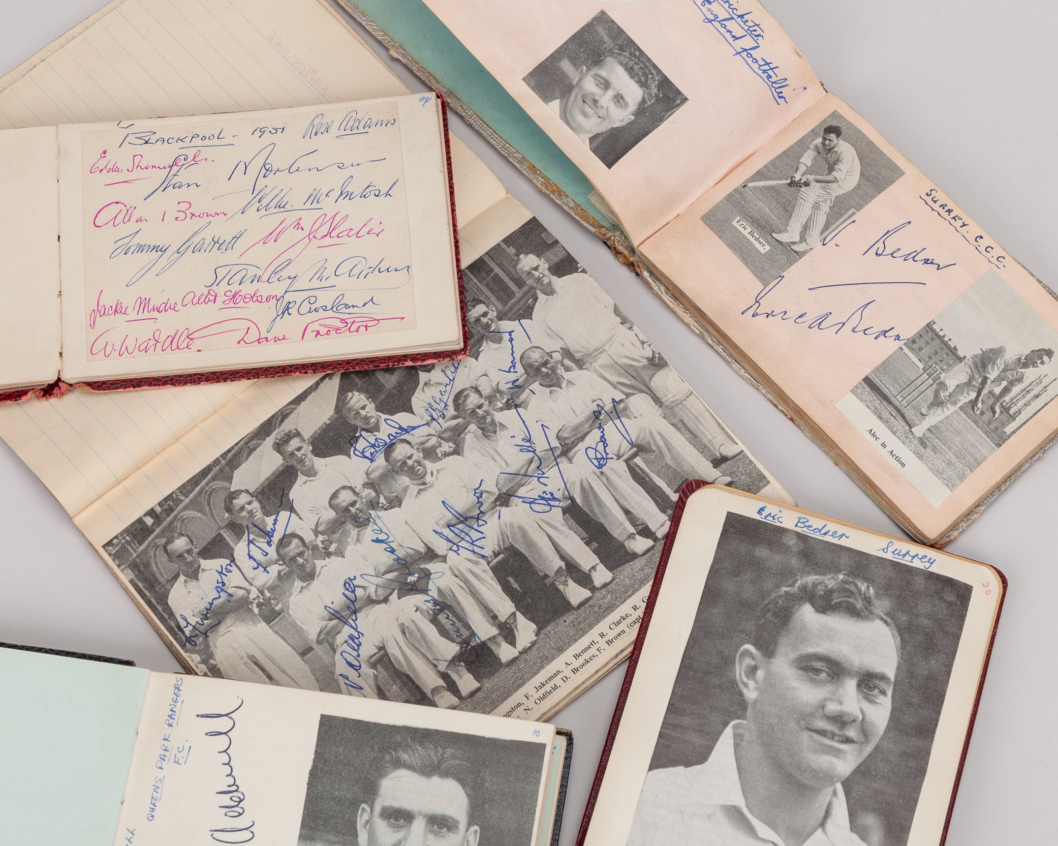 A collection of seven various football and cricket autographs, 1950s, including teams and individuals, teams include Chelsea, West Indies, Surrey, Blackpool, Copenhagen, Brentford, Warwickshire, Sheffield United, Leicester City, Leeds United, Doncaster Rovers and a signed Tottenham Hotspur ball