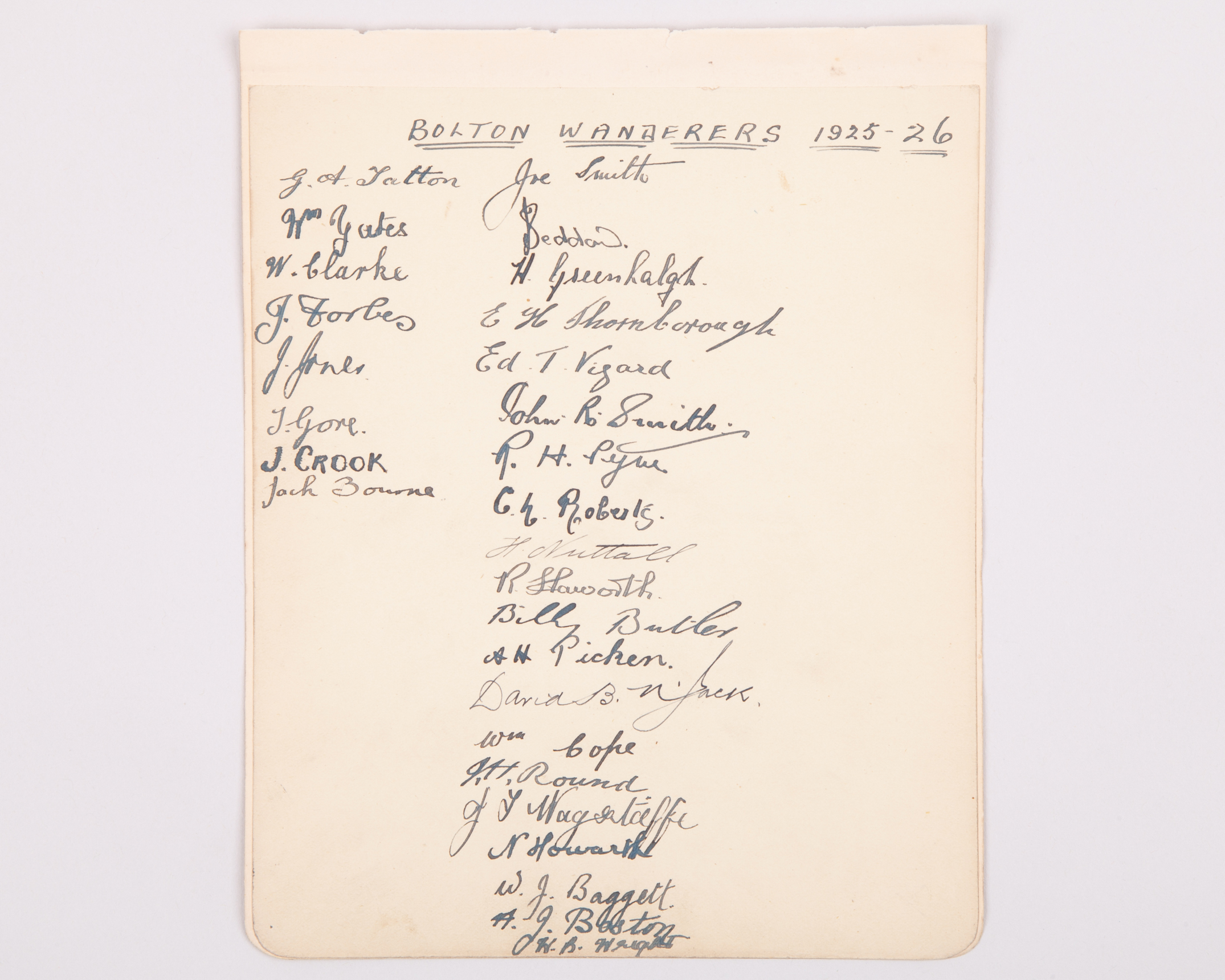 Bolton Wanderers - a page of 28 autographs from 1925-26, including Seddon, Vizard, Smith, Pym, Jack, Cope, Wagstaffe etc