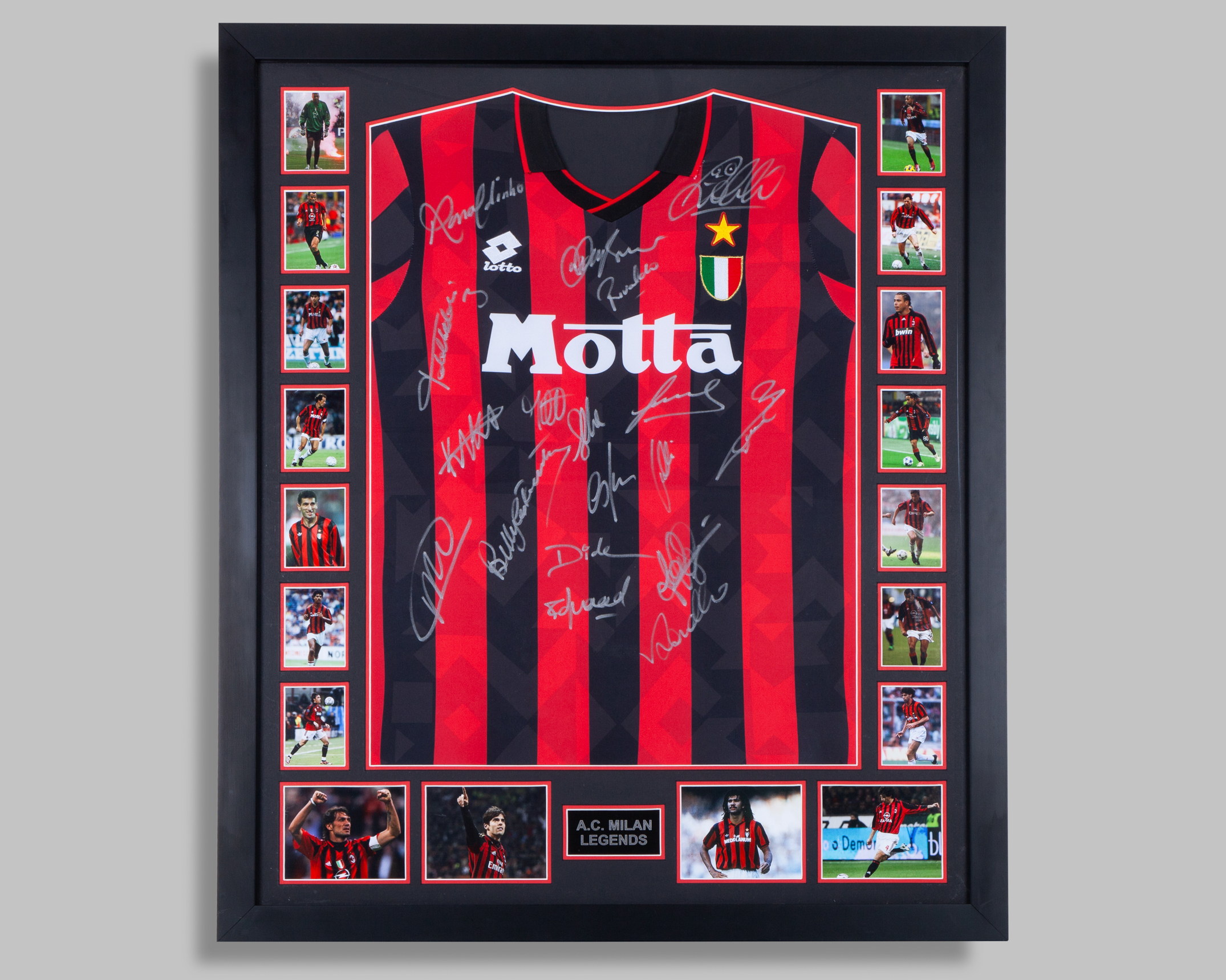 A red and black AC Milan autographed replica shirt display, Lotto, with v-neck collar and embroidered badge, with eighteen autographs and eighteen colour photographs of AC Milan former players, with COA, framed, 83x97cm, frame damaged