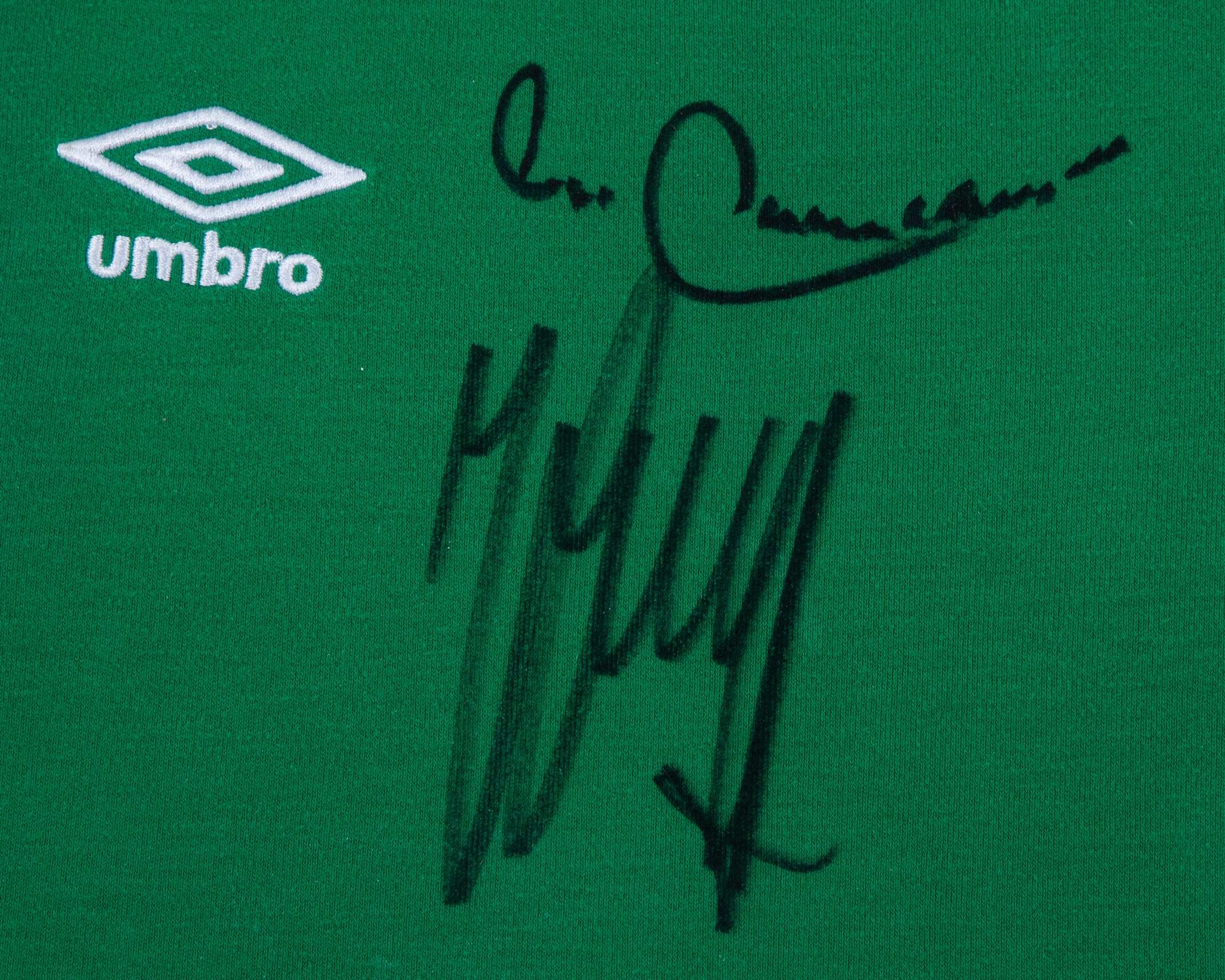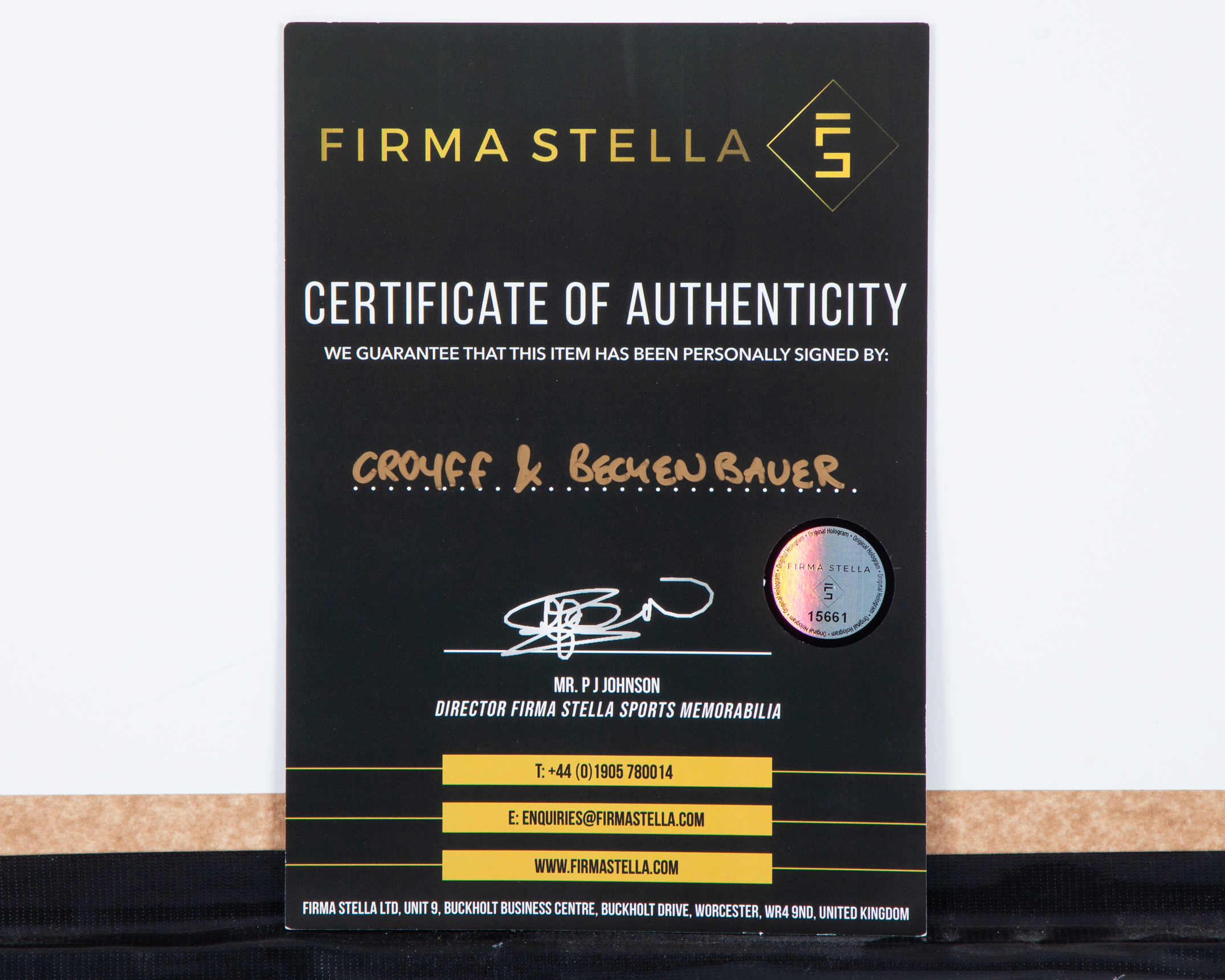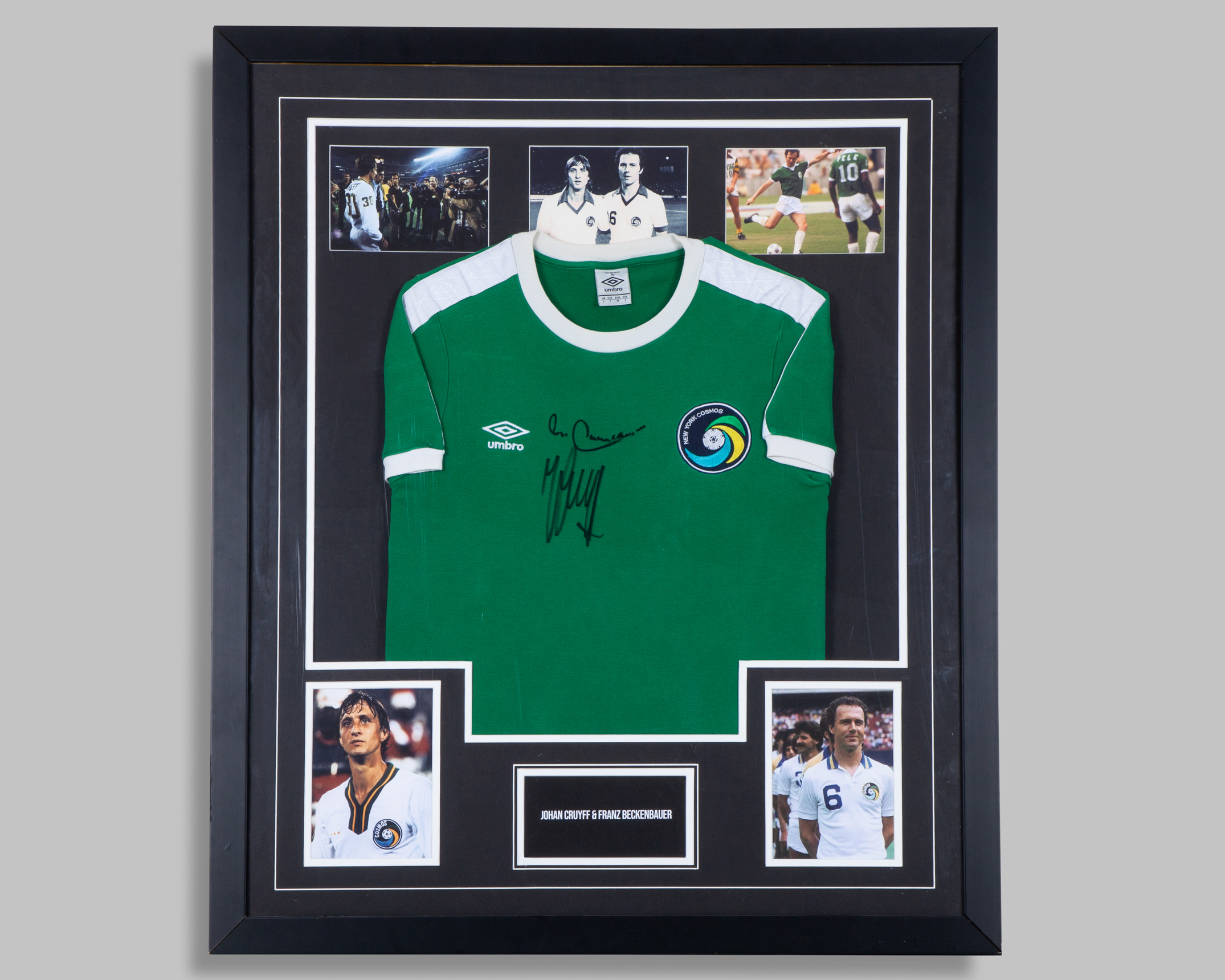 A Johan Cruyff and Franz Beckenbauer autographed green New York Cosmos replica shirt display