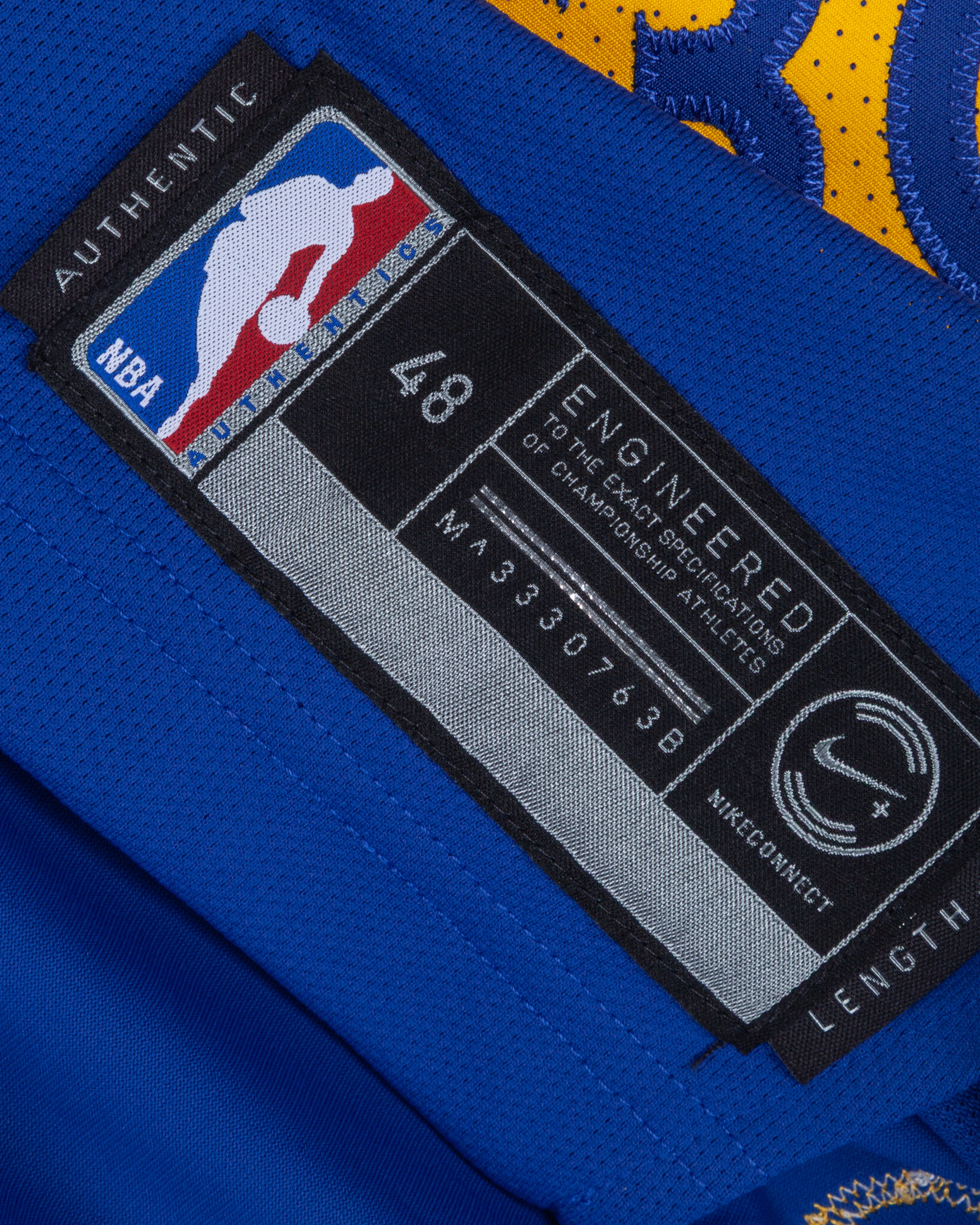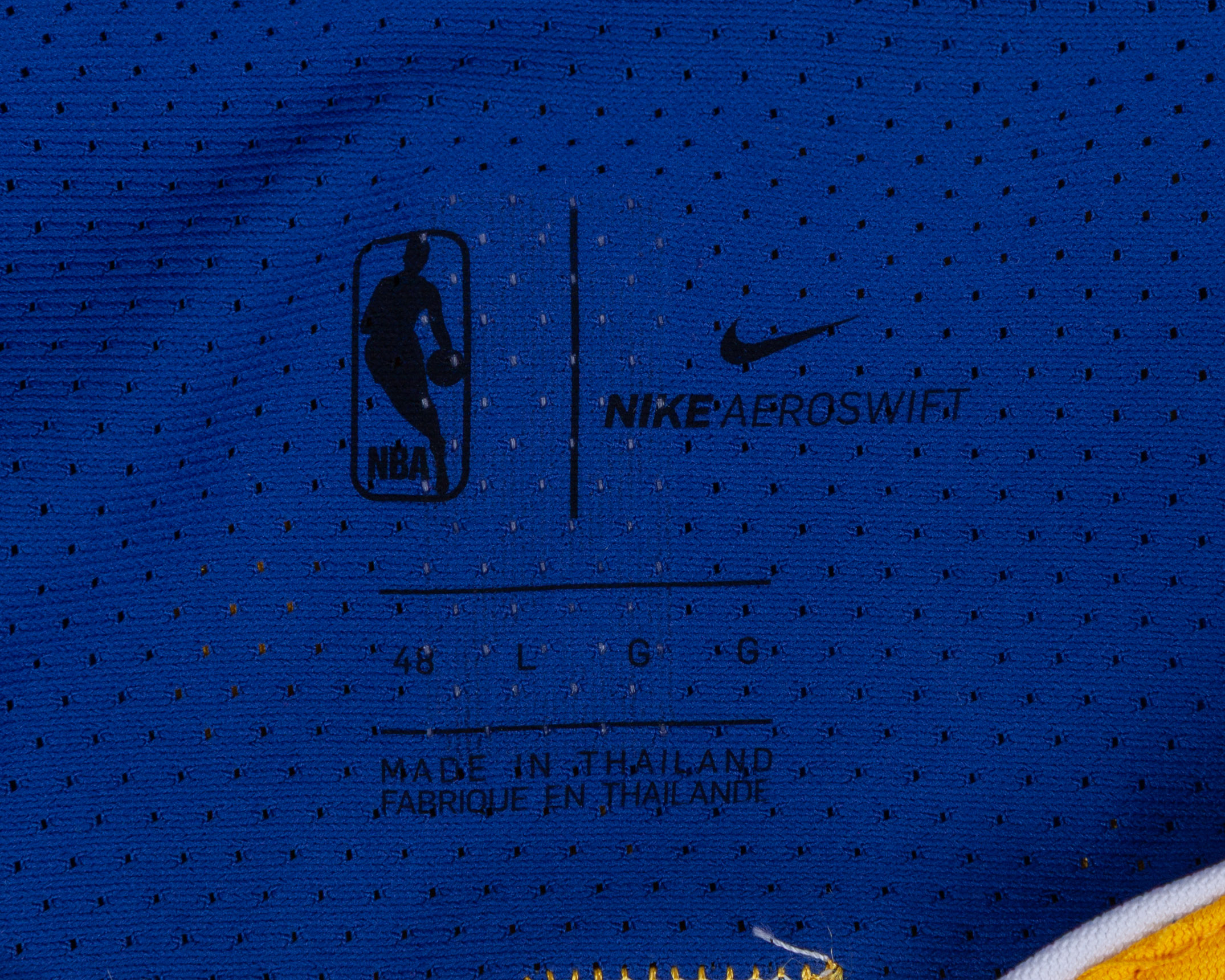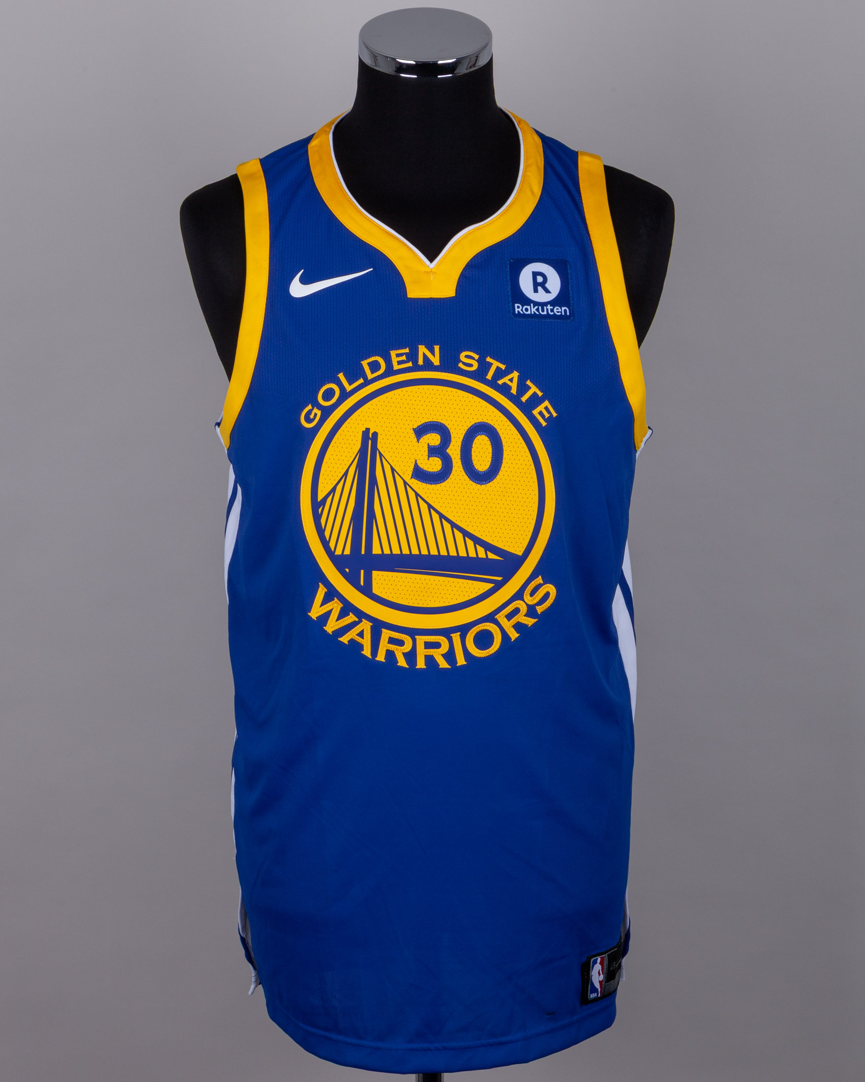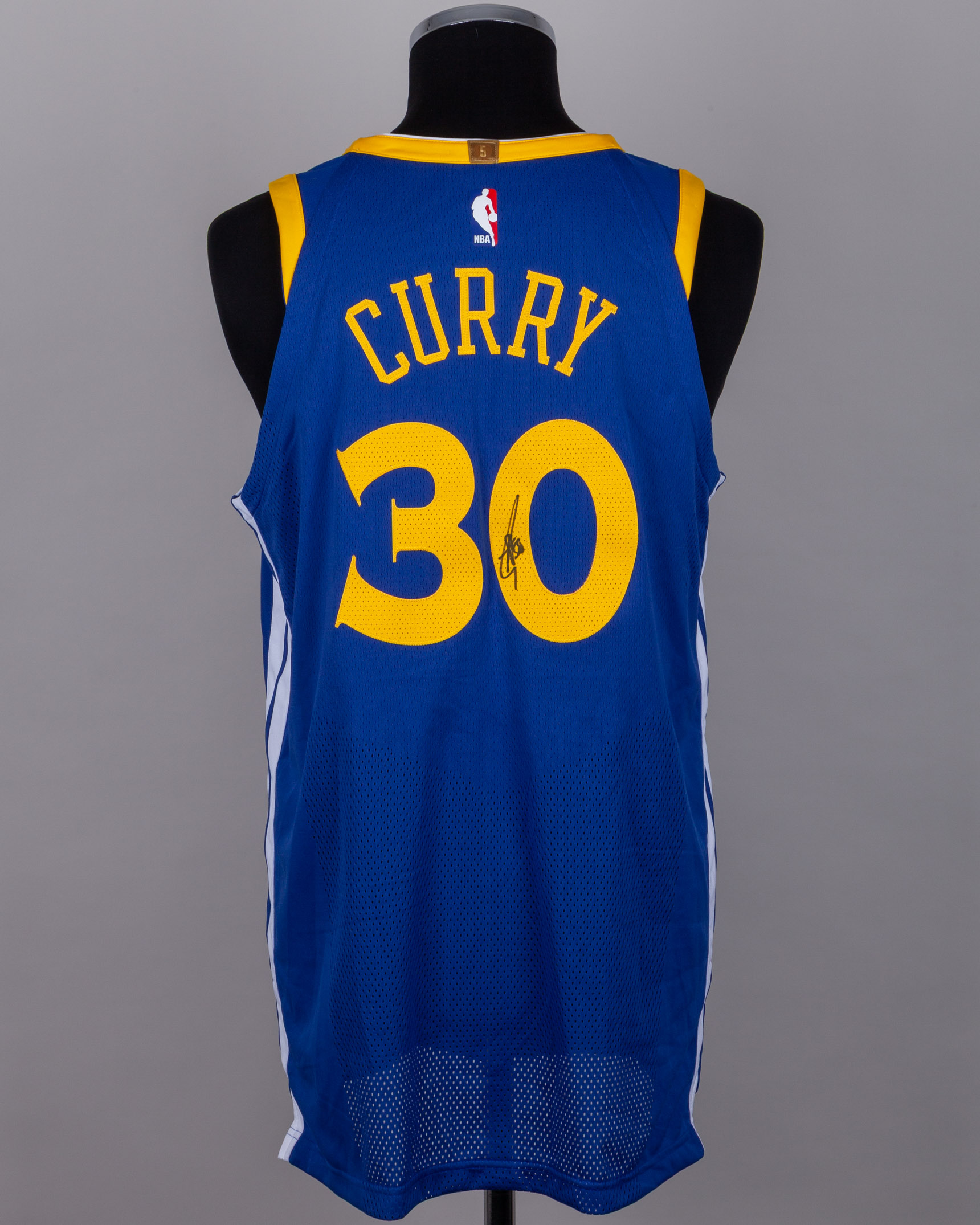 Steph Curry blue No.30 Golden State Warriors autographed basketball shirt, 2017-18, Nike, L, with v-neck collar and embroidered cloth badge inscribed GOLDEN STATE WARRIORS, the reverse lettered CURRY, autographed on the number by the player