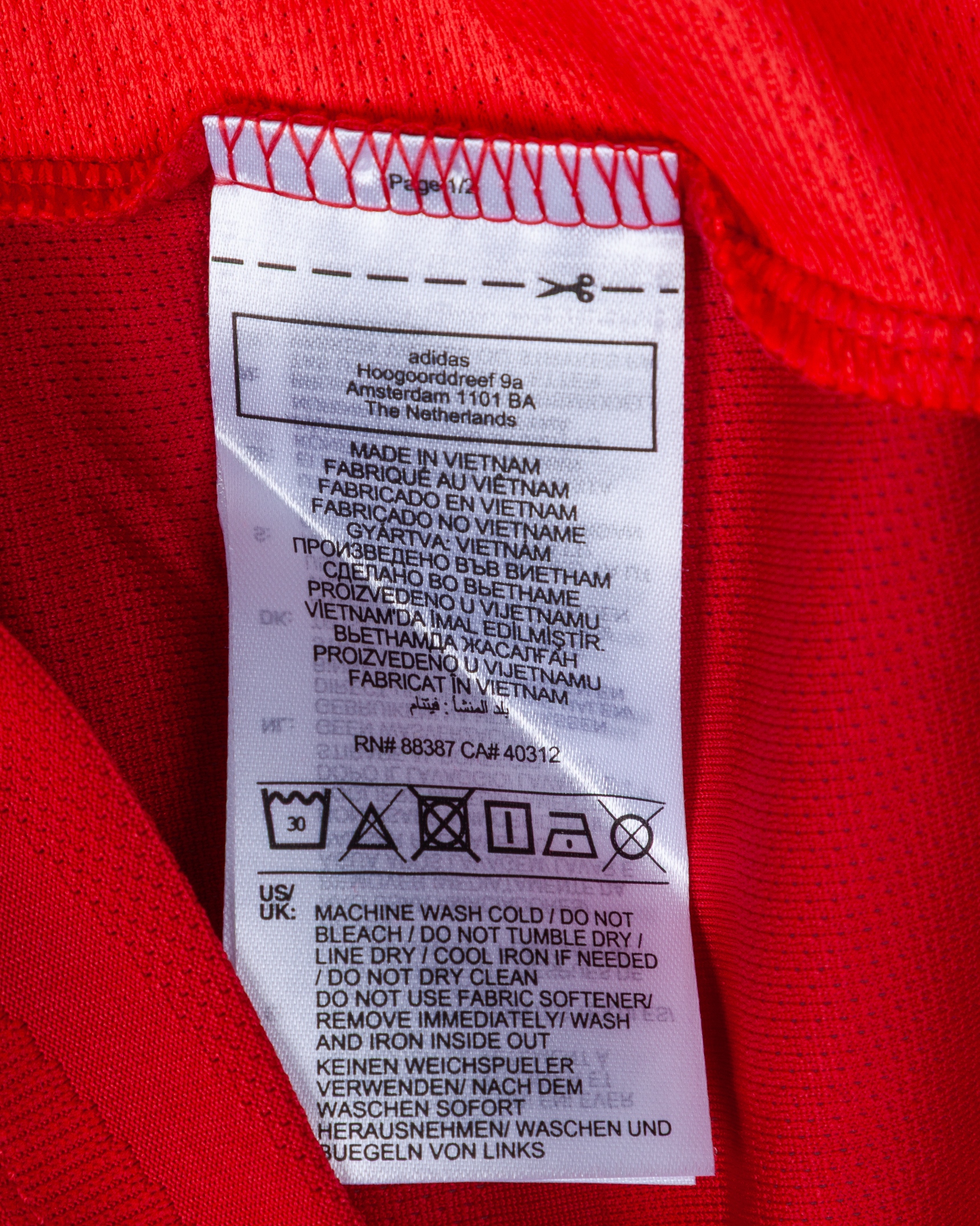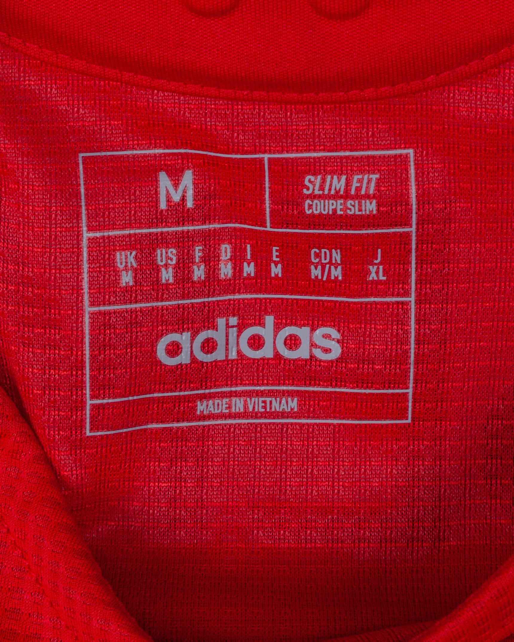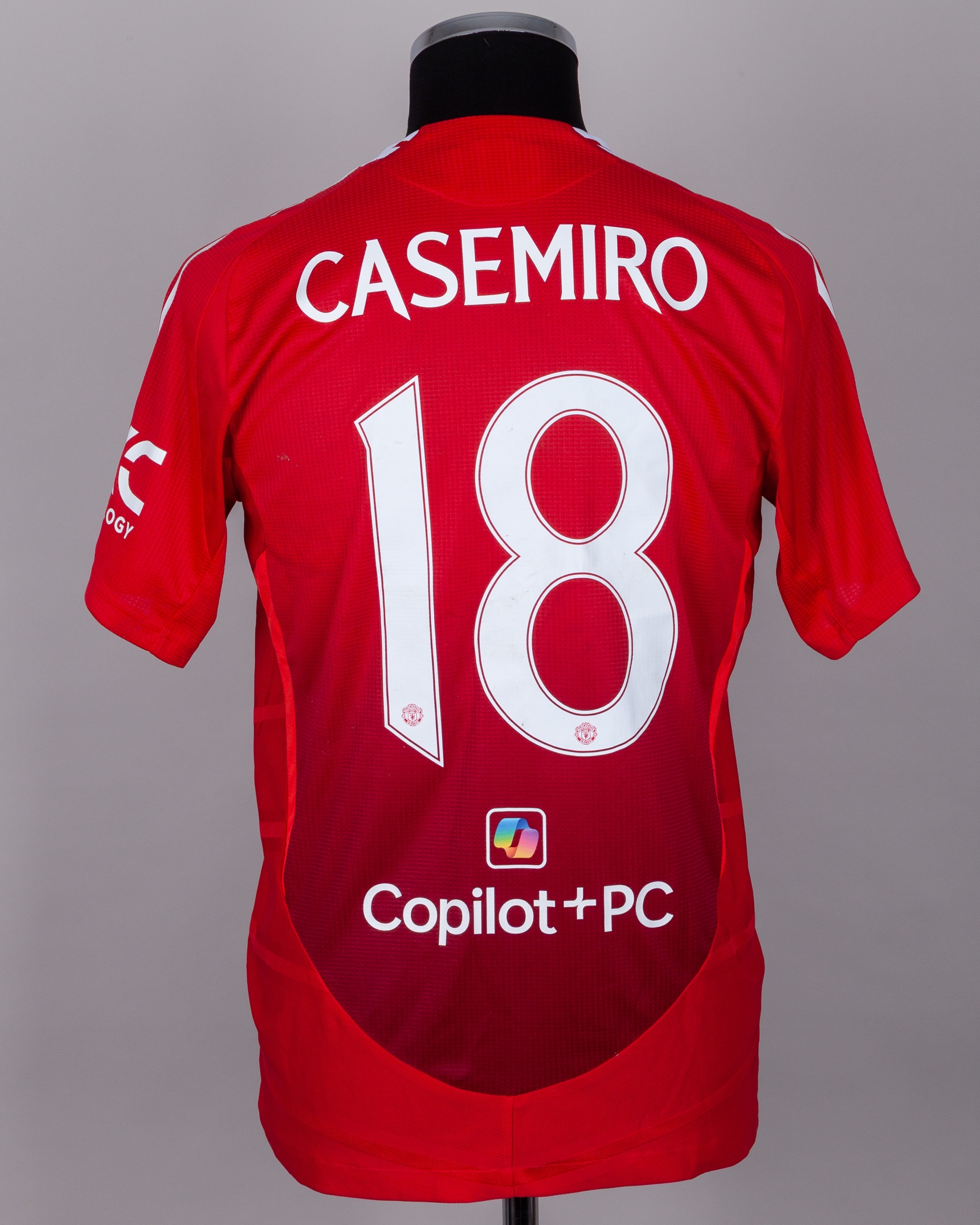 Casemiro red No.18 Manchester United short-sleeved shirt, 2024-25, Adidas, M, with crew-neck collar and printed badge, the reverse lettered CASEMIRO, the right sleeve with Emirates FA Cup flash, marks on number