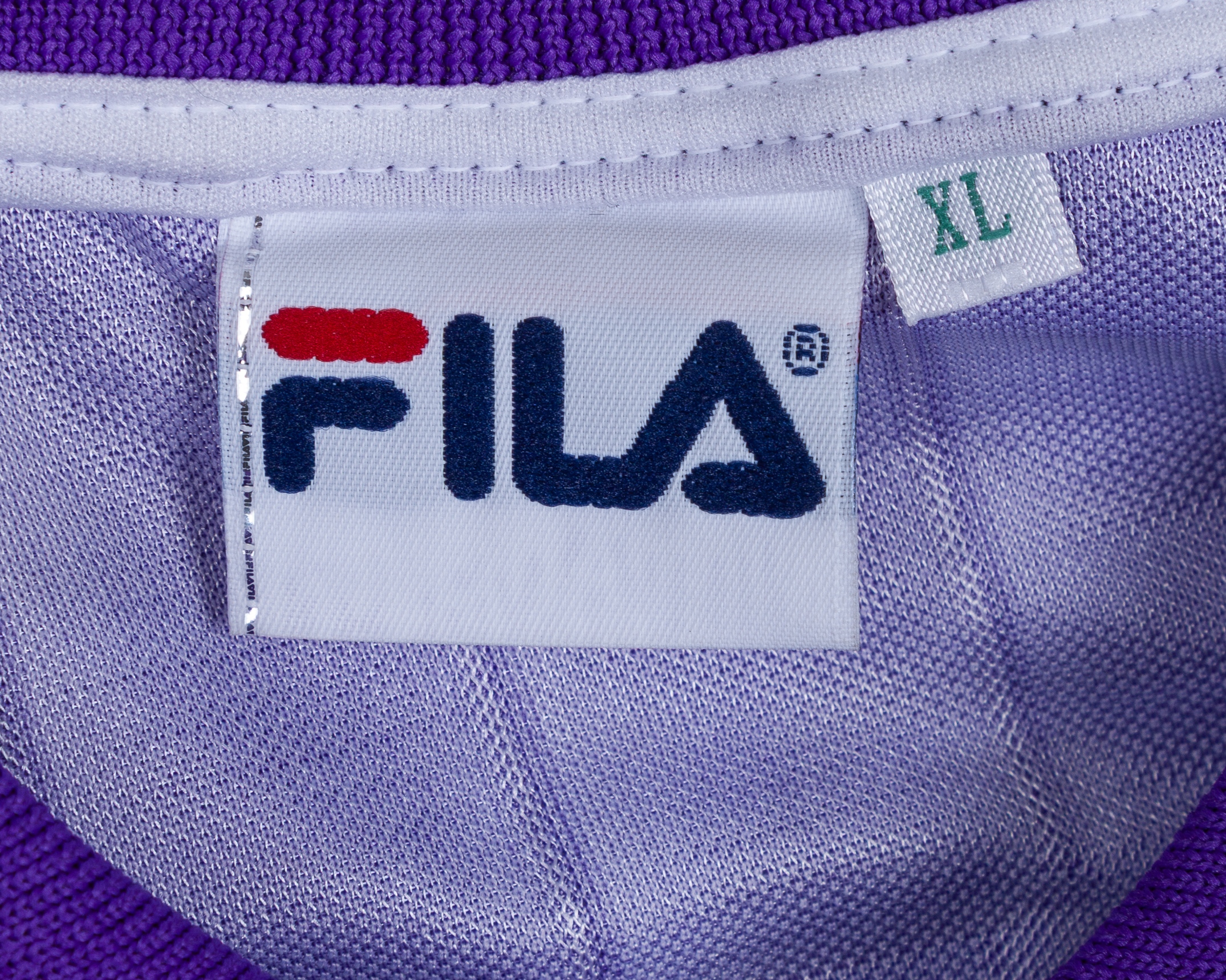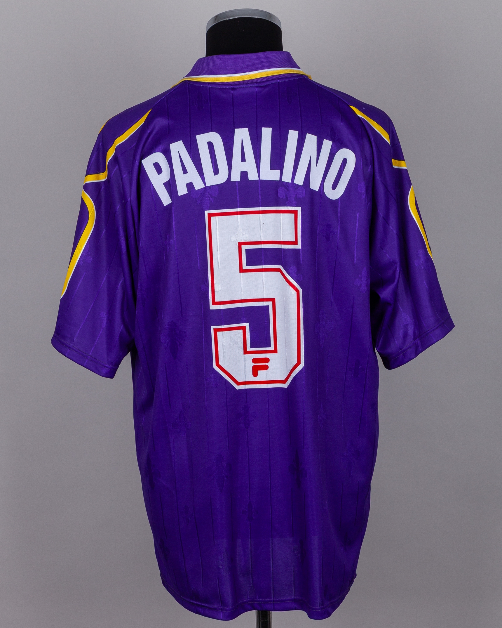 Pasquale Padalino purple and yellow No.5 Fiorentina short-sleeved shirt, 1997-98, Fila, XL, with button-up collar and embroidered cloth badge inscribed ACF, the reverse lettered PADALINO