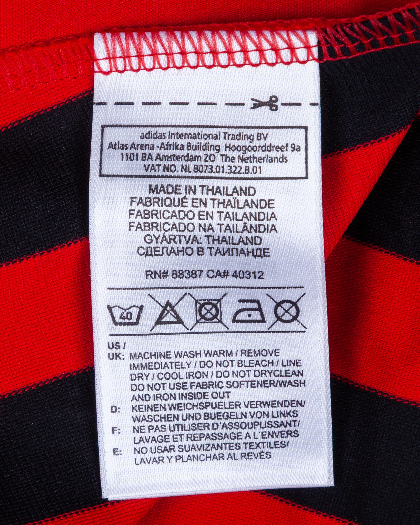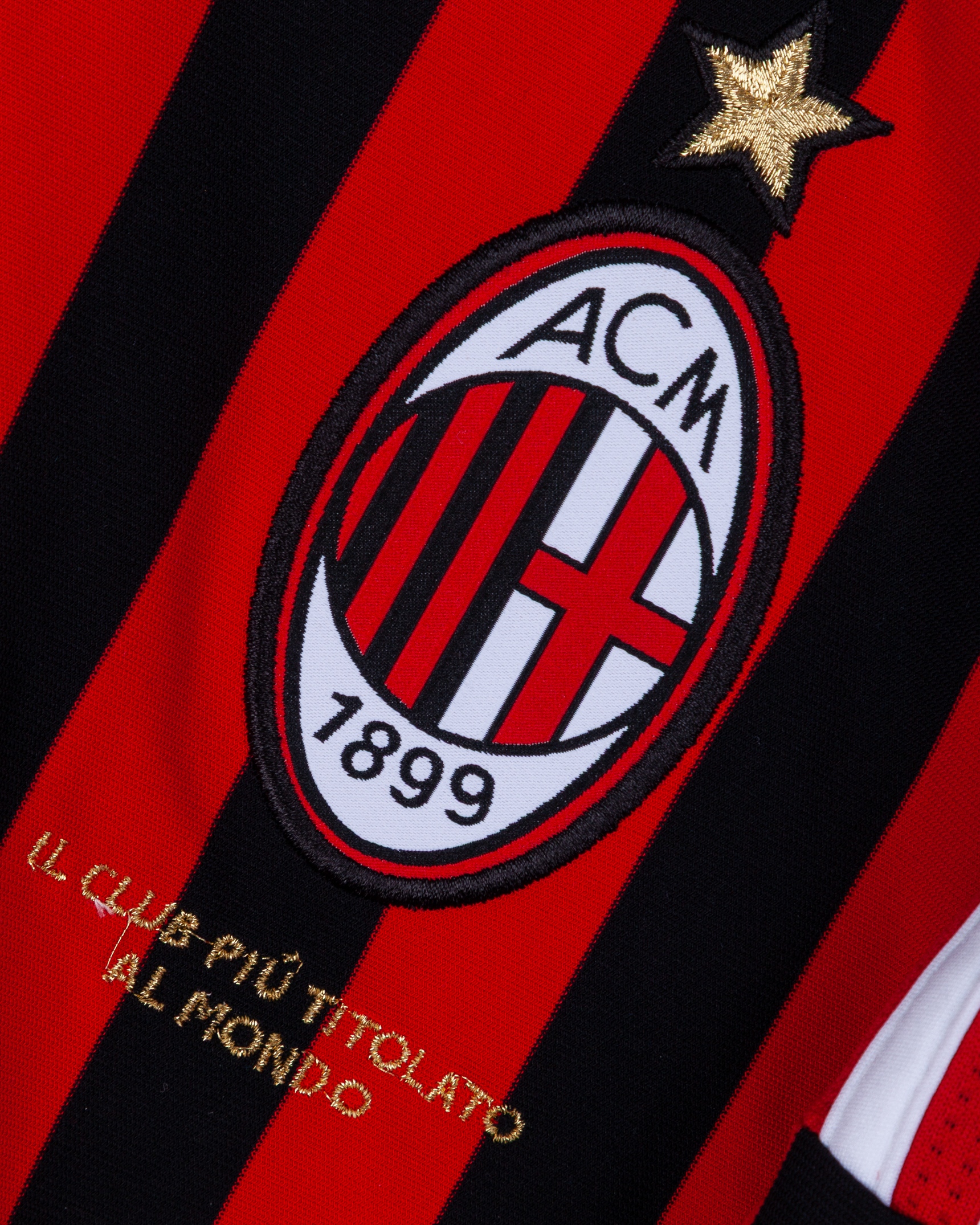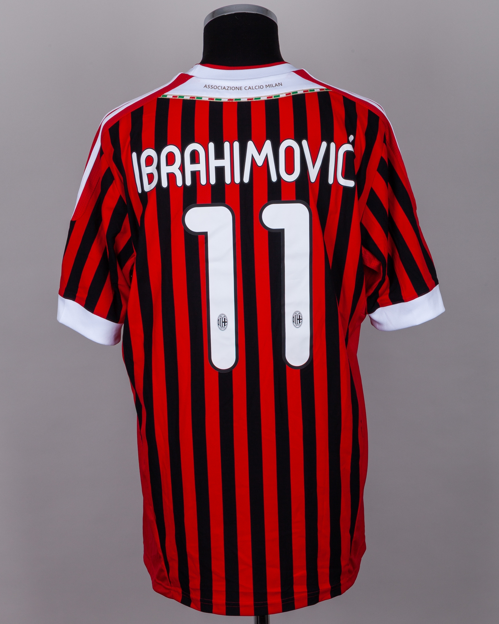 Zlatan Ibrahimovic red and black No.11 AC Milan short-sleeved shirt, Adidas, XL, with crew-neck collar and embroidered cloth badge inscribed ACM, IL CLUB PIU TITOLATO AL MONDO, the reverse lettered IBRAHIMOVIC, the right sleeve with Serie A flash, the other with European Cup 7