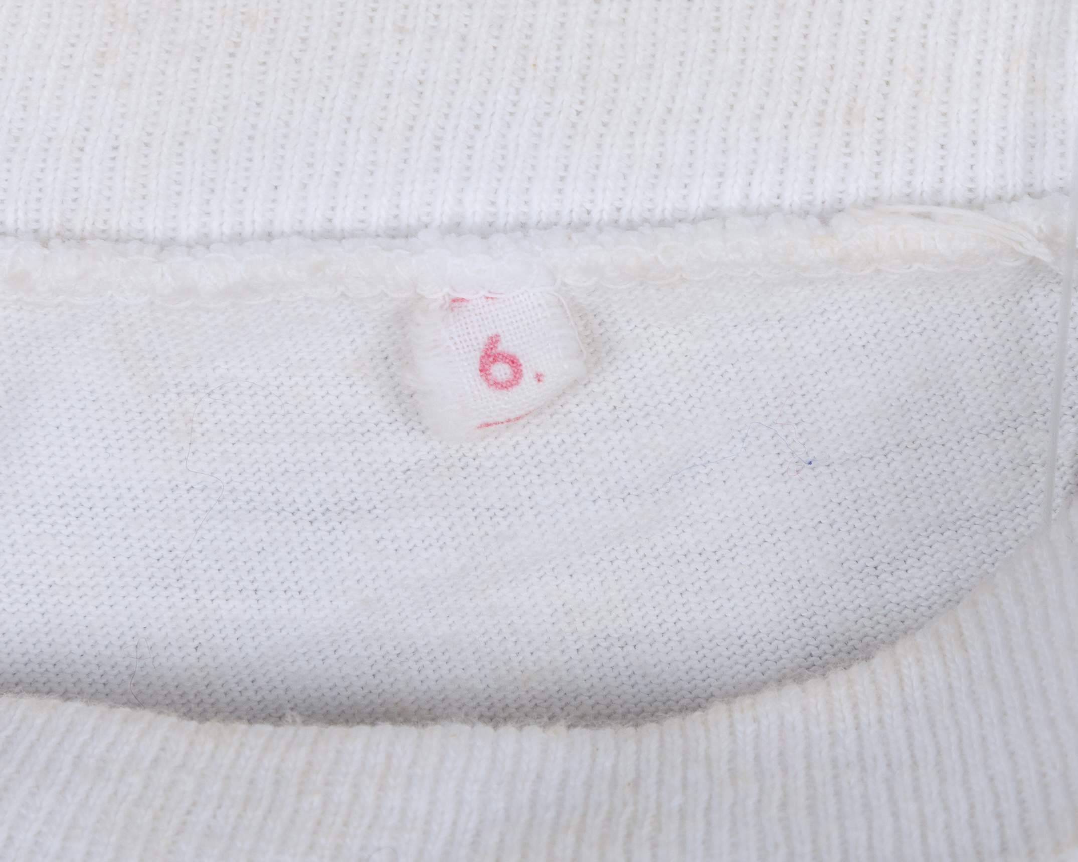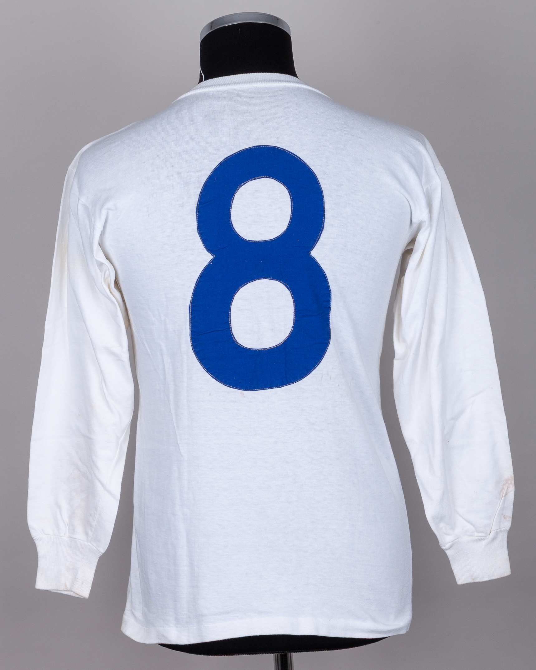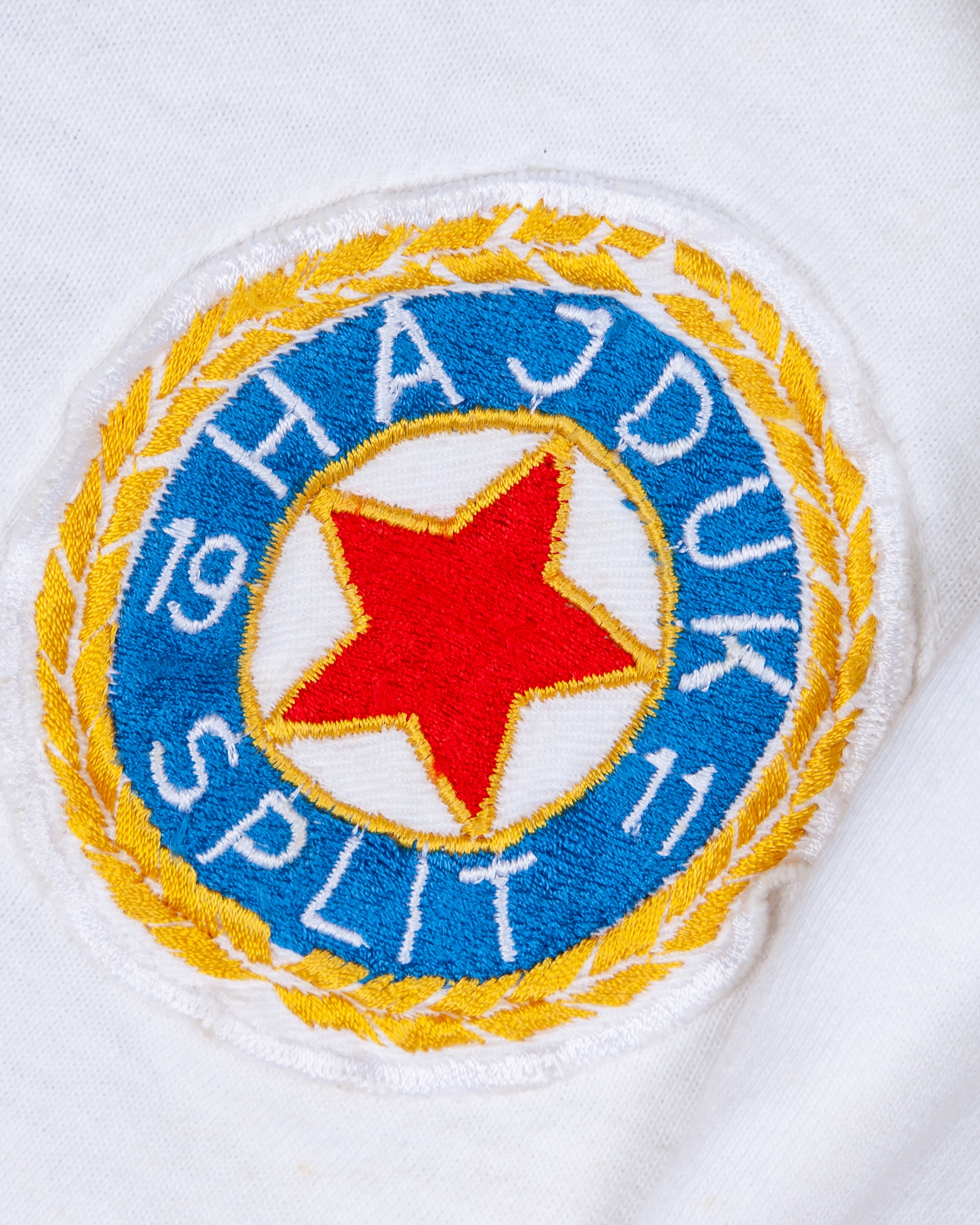 White No.8 Hadjuk Split v. Leeds United long-sleeved shirt, 1973, with crew-neck collar and embroidered cloth badge inscribed HAJDUK SPLIT 1911, areas of staining, possibly worn by Jerkovic