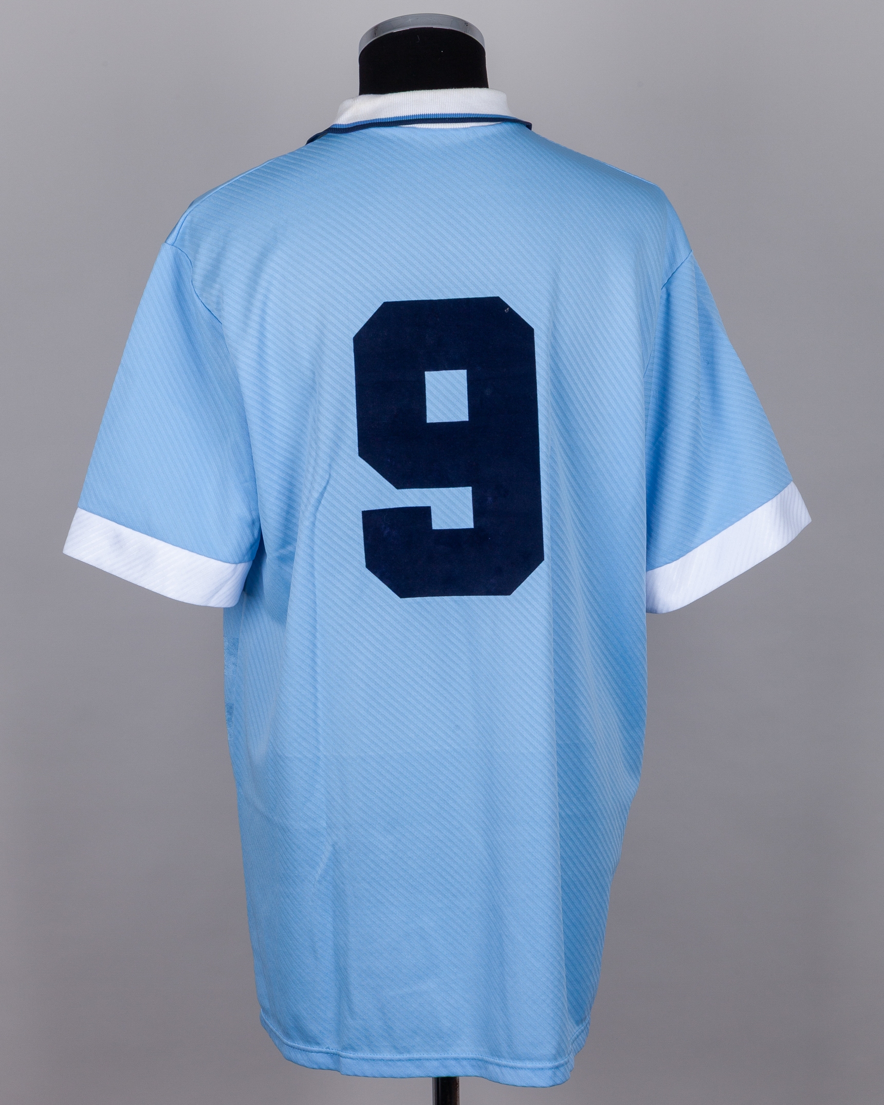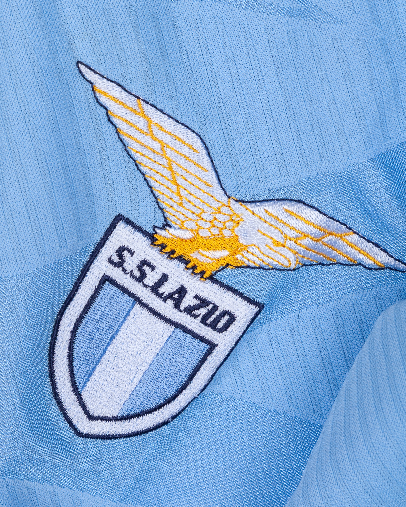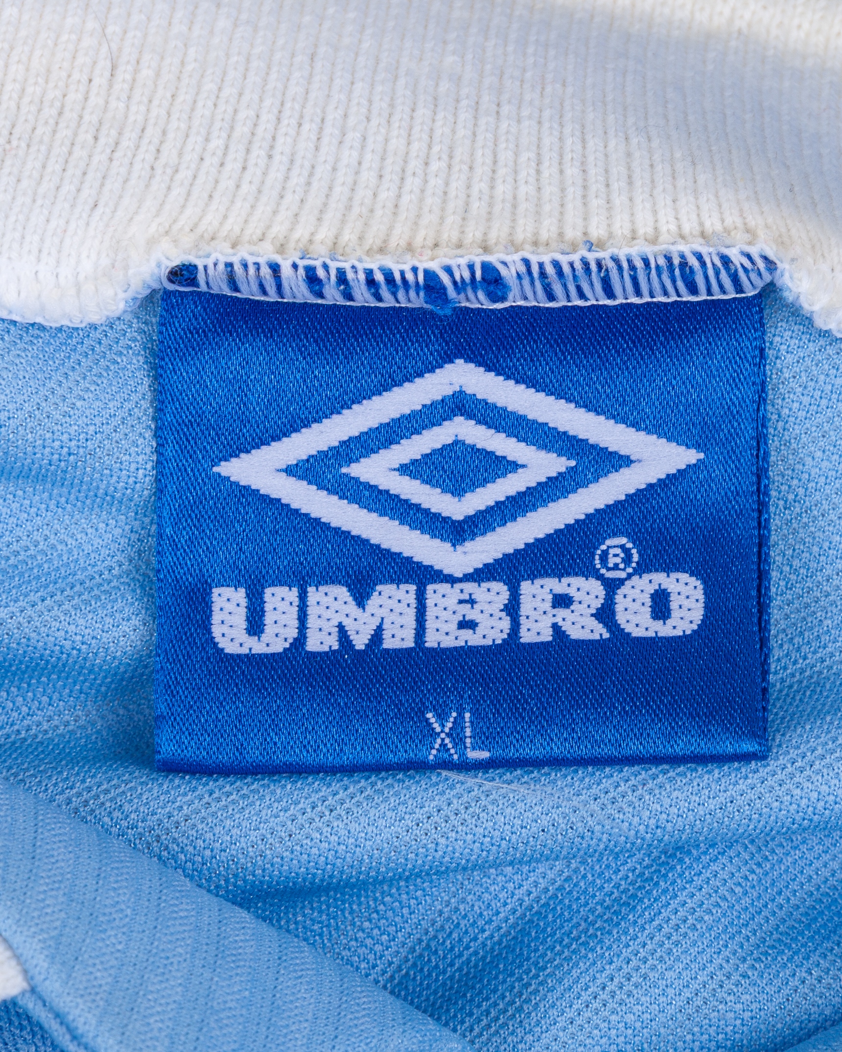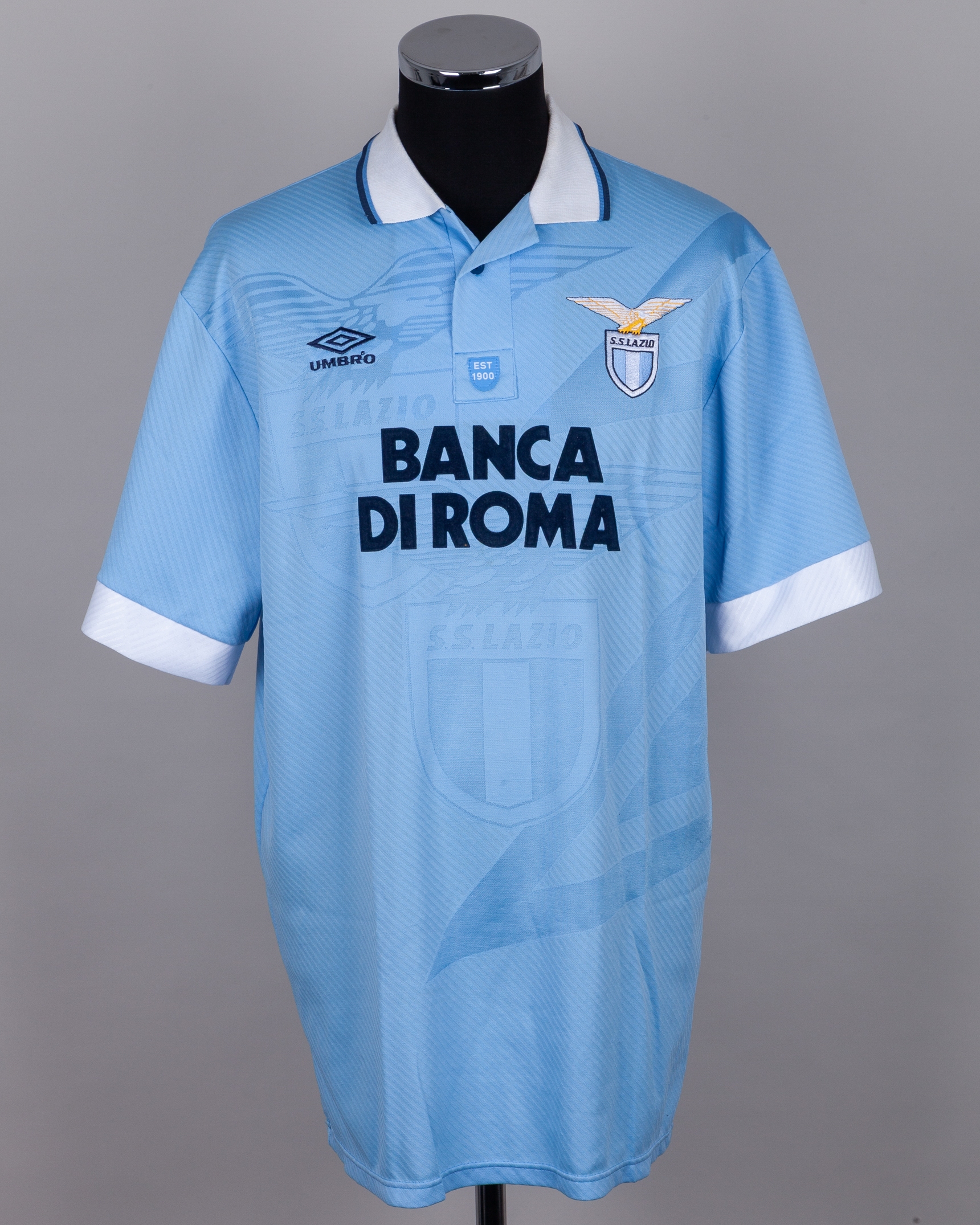 Aron Winter sky-blue and white No.9 Lazio v. Tottenham Hotspur long-sleeved shirt, 1993, Umbro, XL, with button-up collar and embroidered badge inscribed S.S. LAZIO