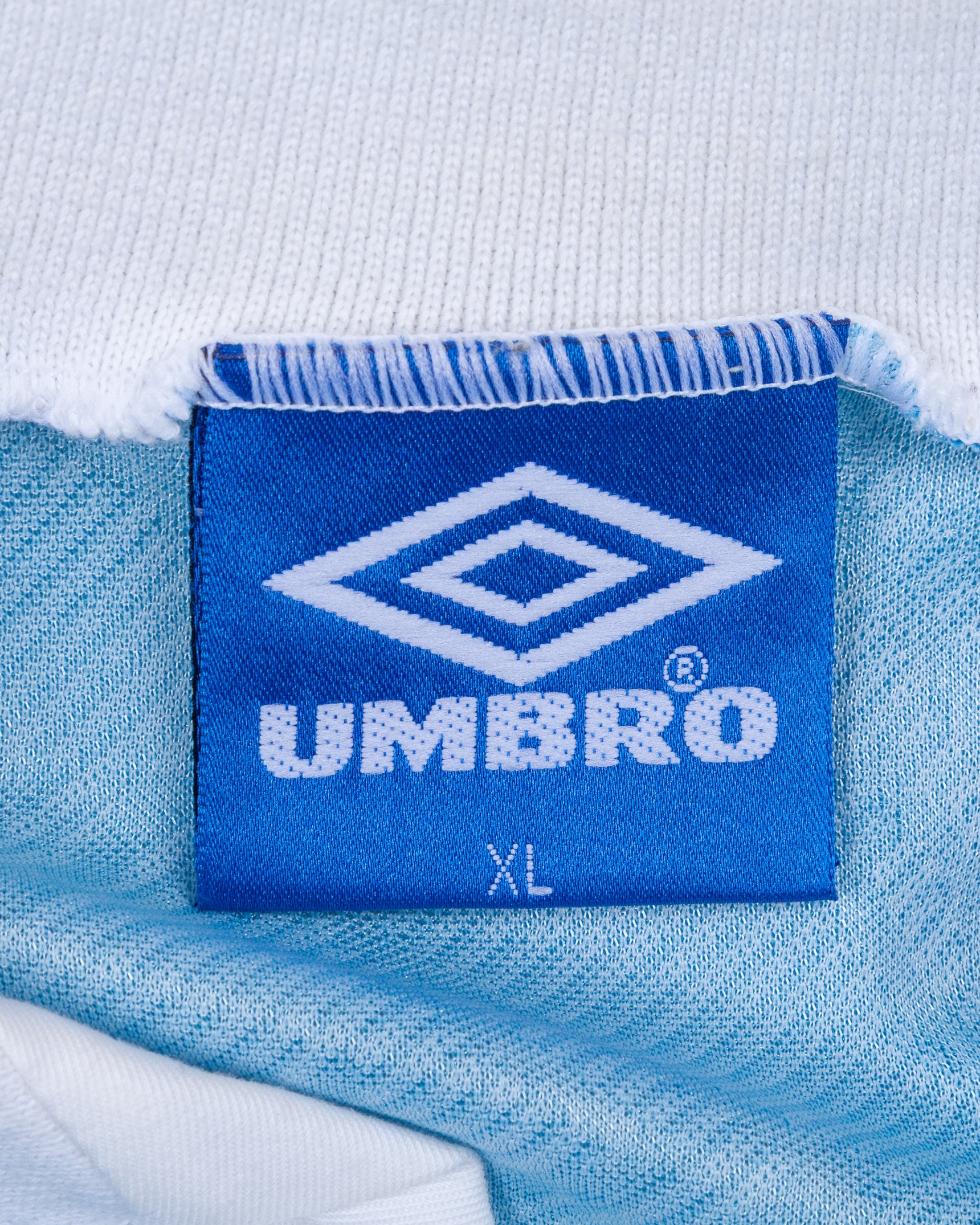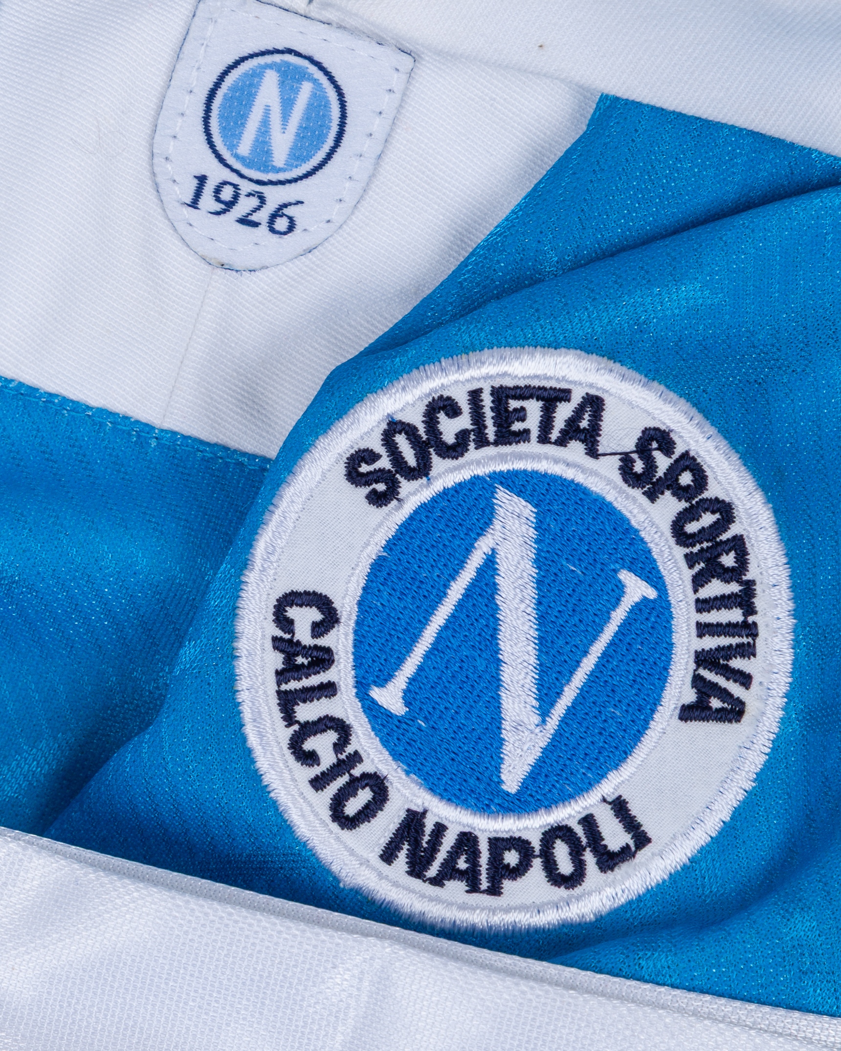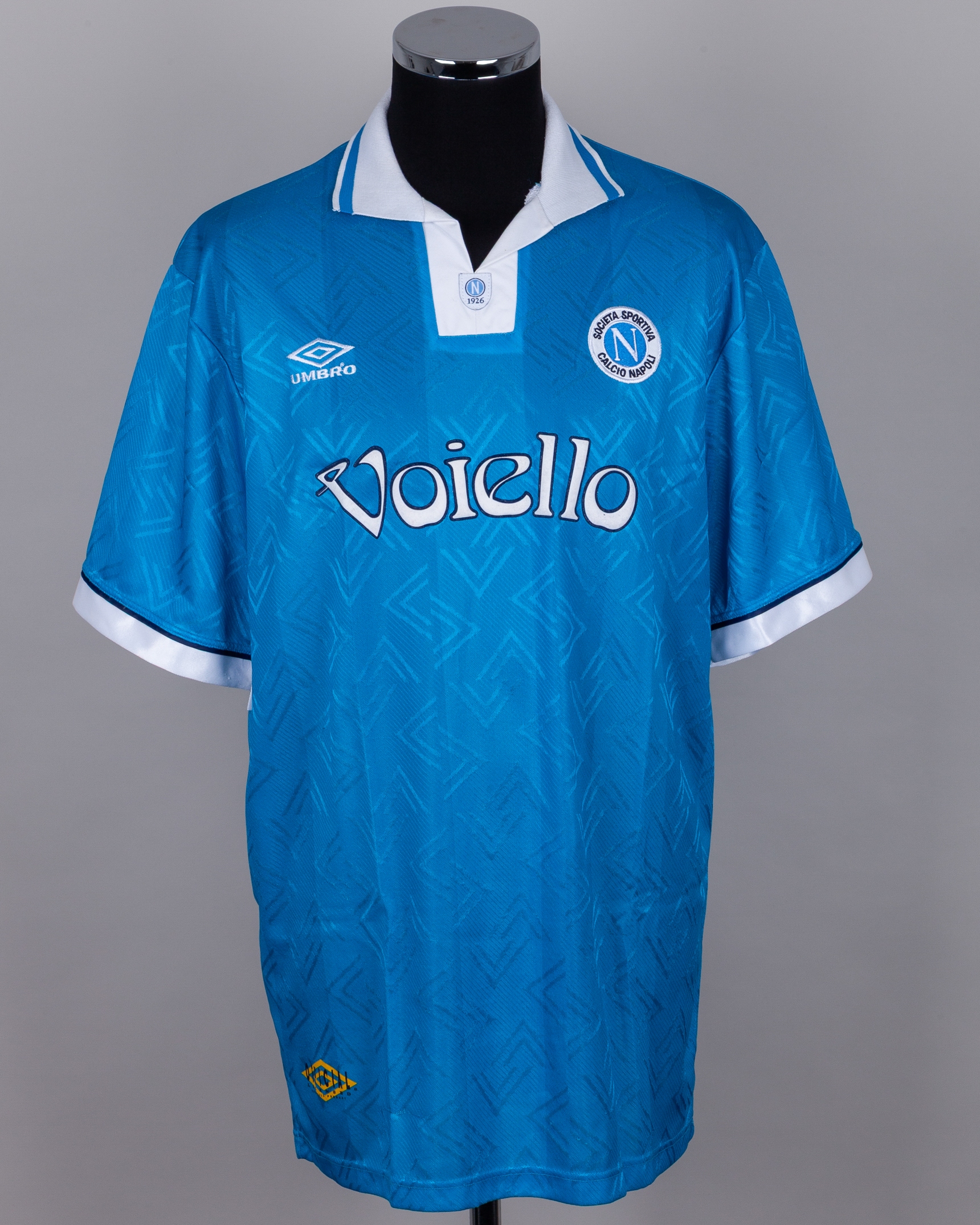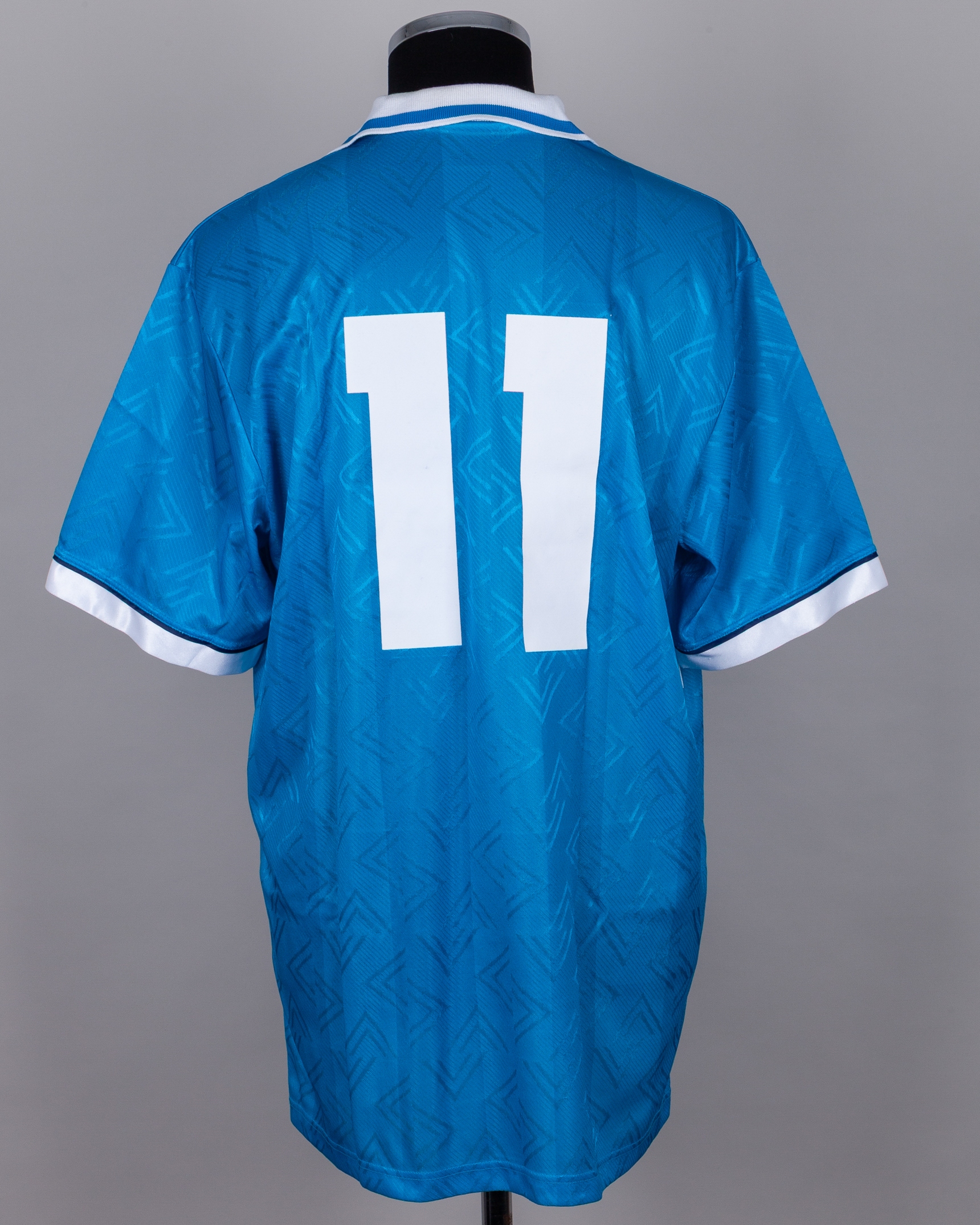 Renato Buso blue and white No.11 Napoli short-sleeved shirt, 1993-94, Umbro, XL, with v-neck collar and embroidered cloth badge inscribed SOCIETA SPORTIVA CALCIO NAPOLI