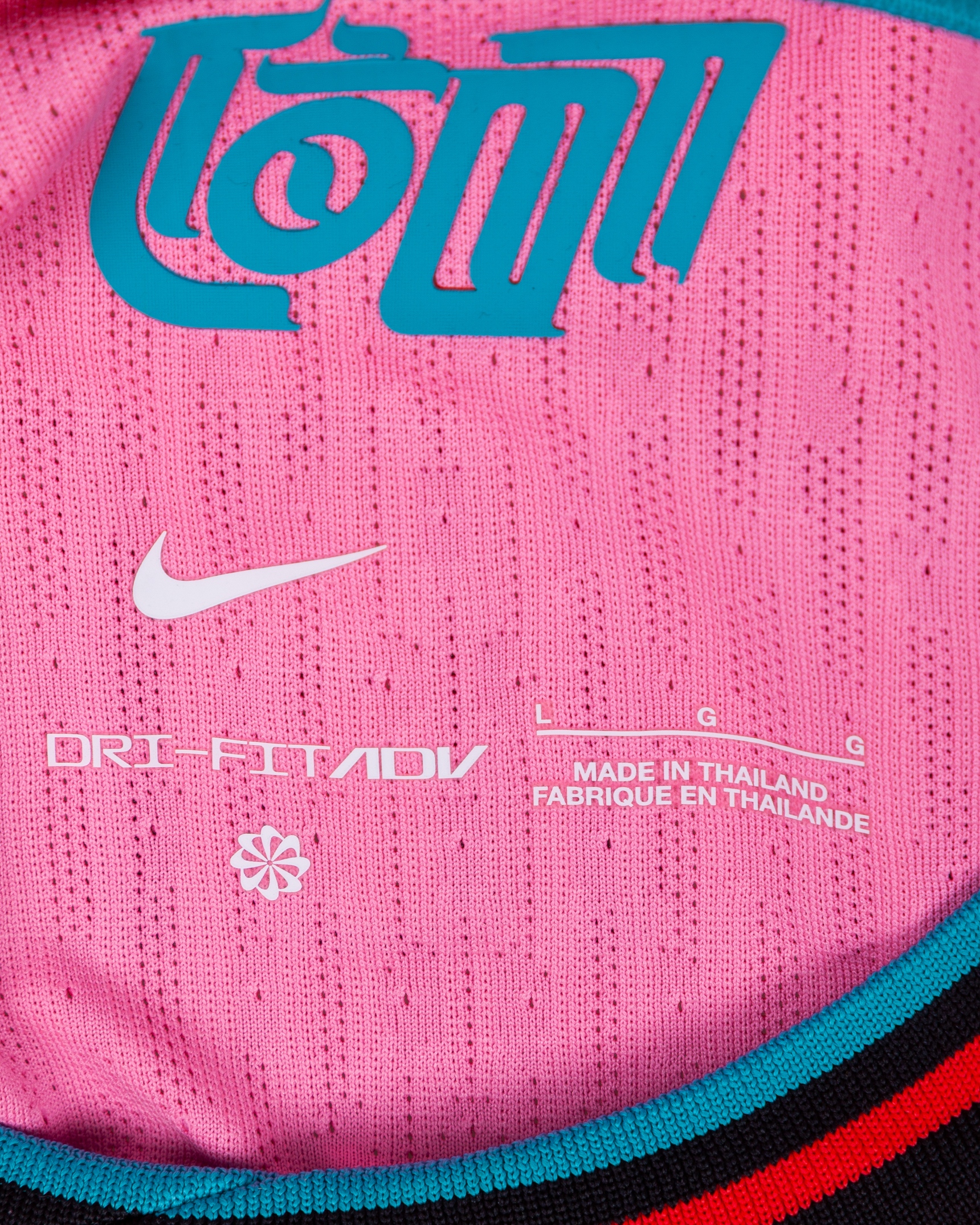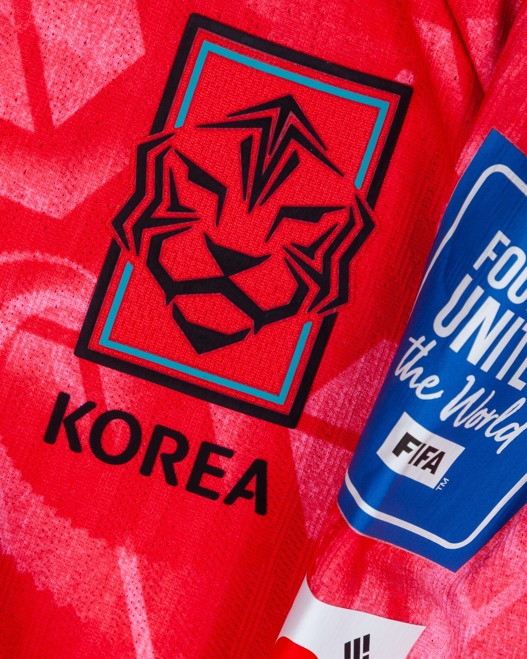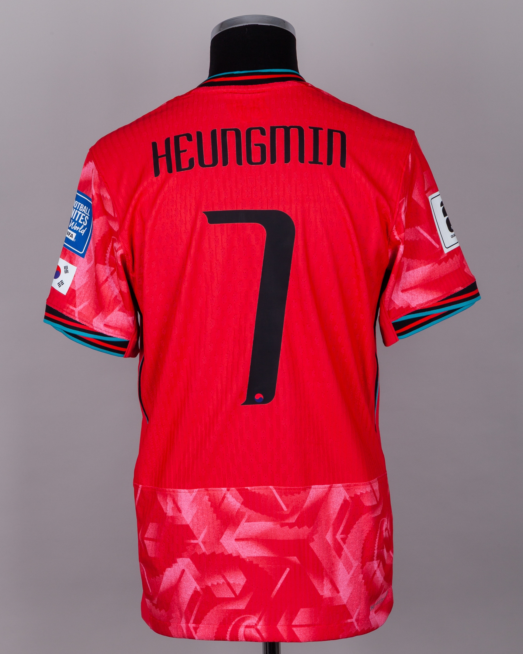 Son Heung-min red and pink No.7 South Korea v. China short-sleeved shirt, 2024, Nike, L, with crew-neck collar and printed badge, with FIFA WORLD CUP 26 ASIAN QUALIFIERS ROUND 2 KOREA REPUBLIC VS CHINA 11 JUNE 2024 SEOUL, KOREA REPUBLIC decal, the reverse lettered HEUNGMIN, the right sleeve with FIFA qualifiers flash and the left sleeve with football unites flash