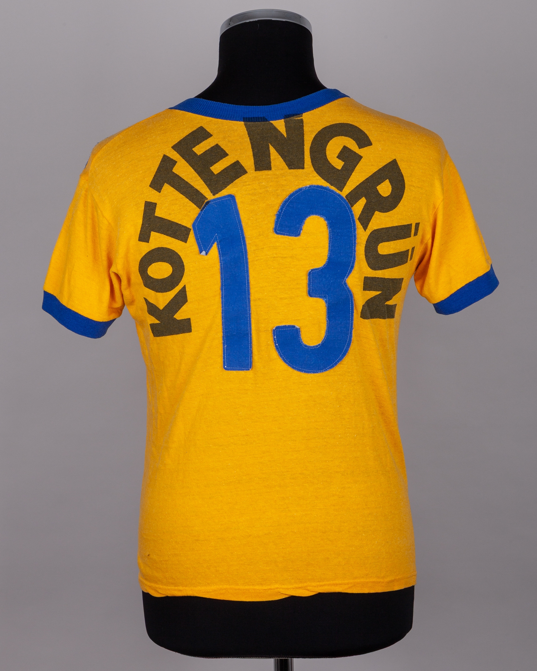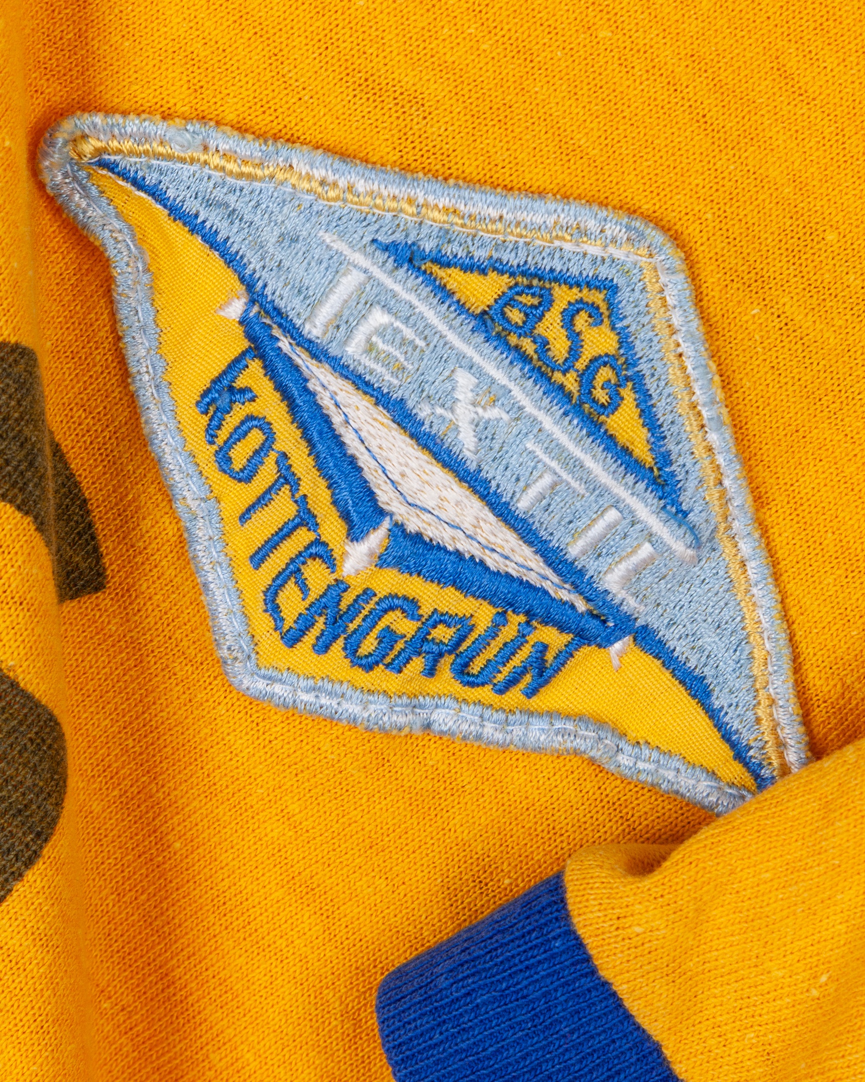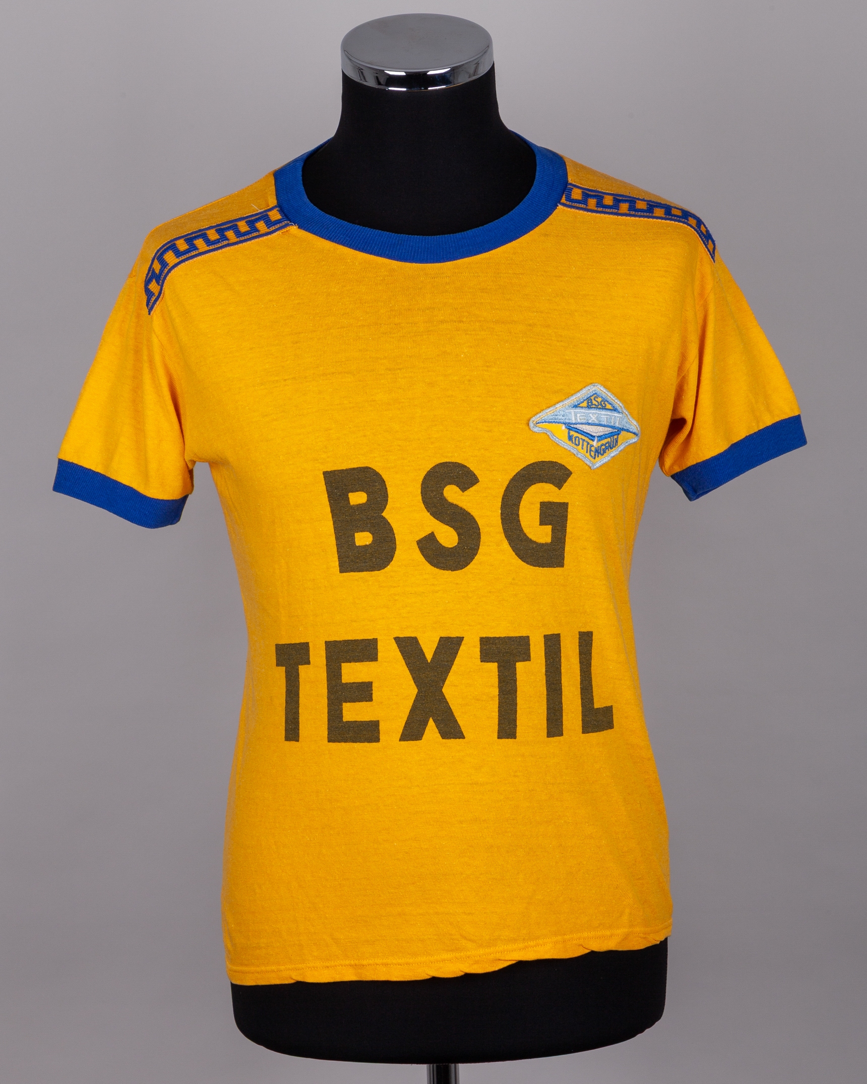 Yellow and blue No.13 BSG Kottengrun short-sleeved shirt, c.1980s, with crew-neck collar and embroidered cloth badge inscribed with BSG TEXTIL KOTTENGRUN