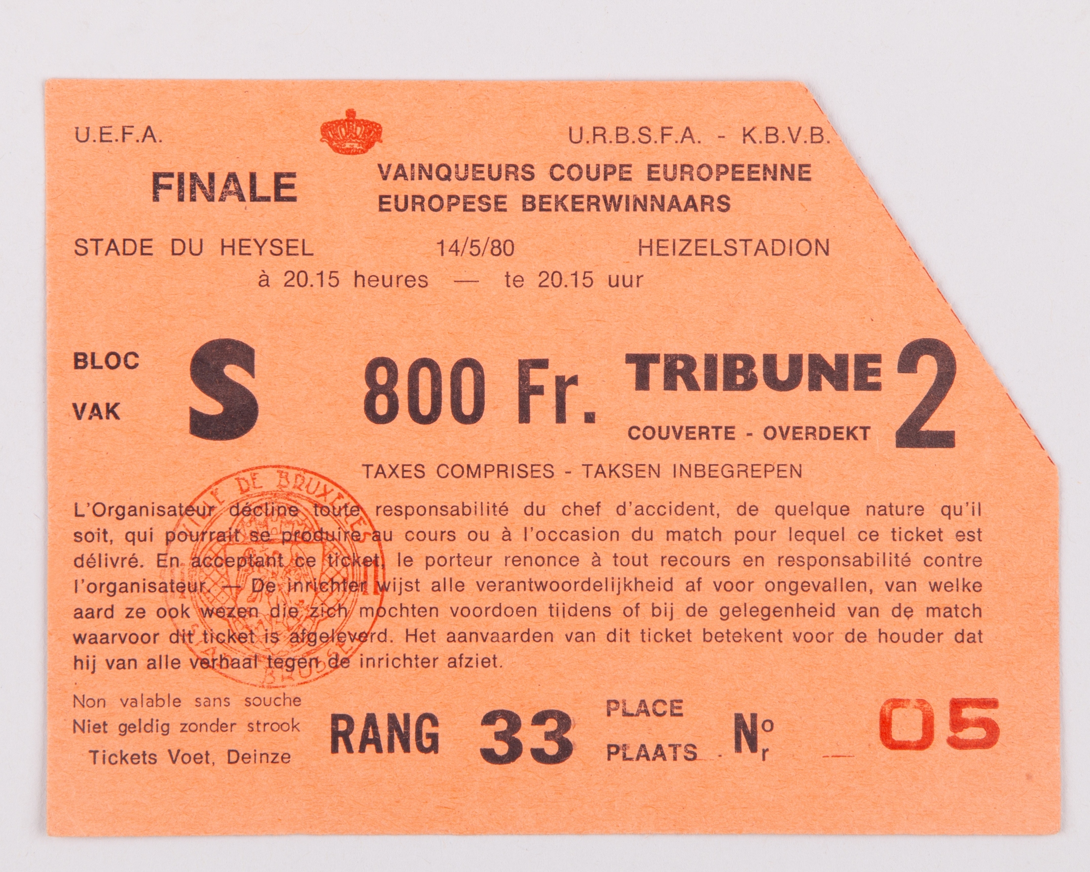 Valencia v. Arsenal UEFA Cup Winners Cup Final ticket 14th May 1980, with annotation made on the back