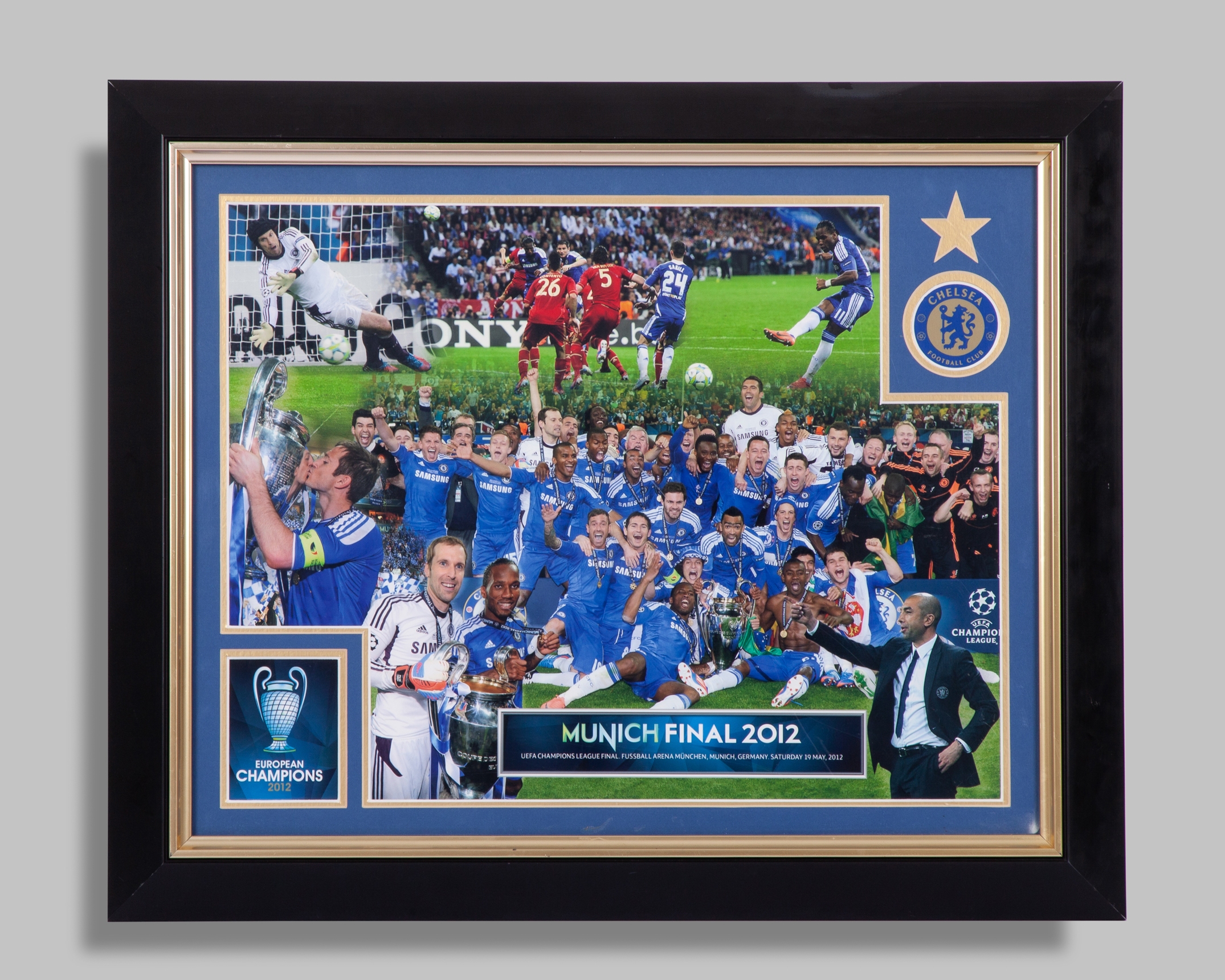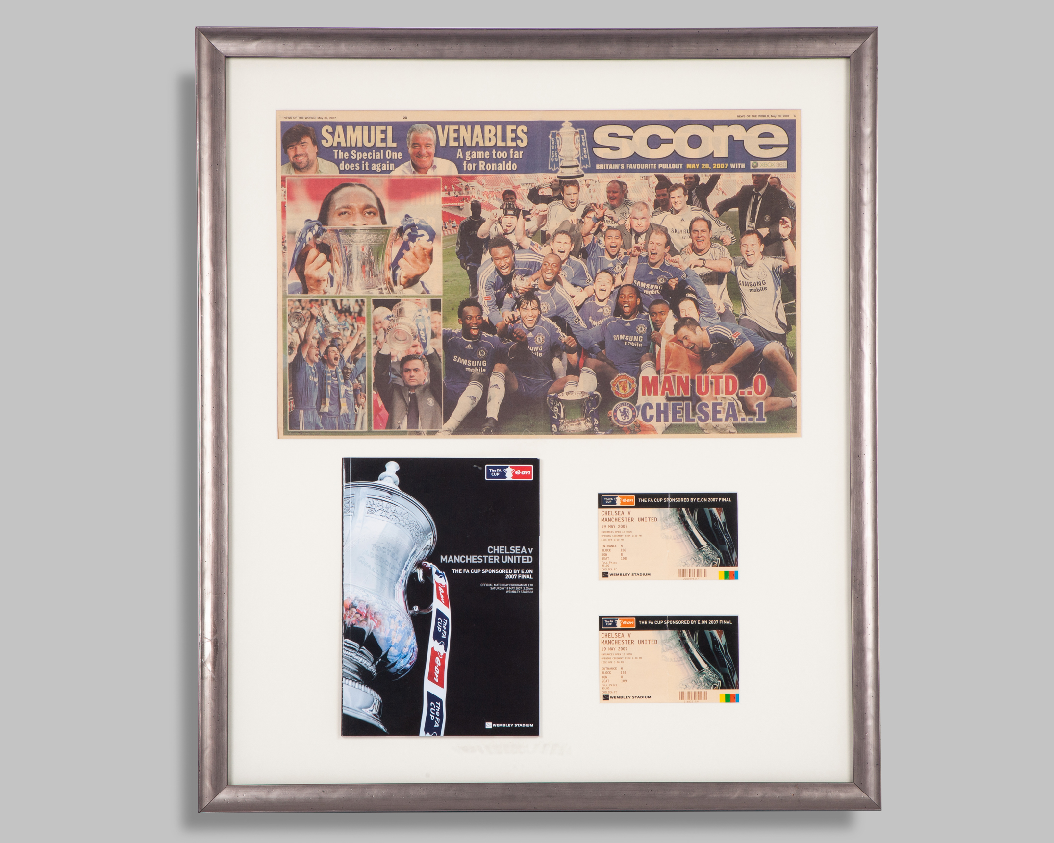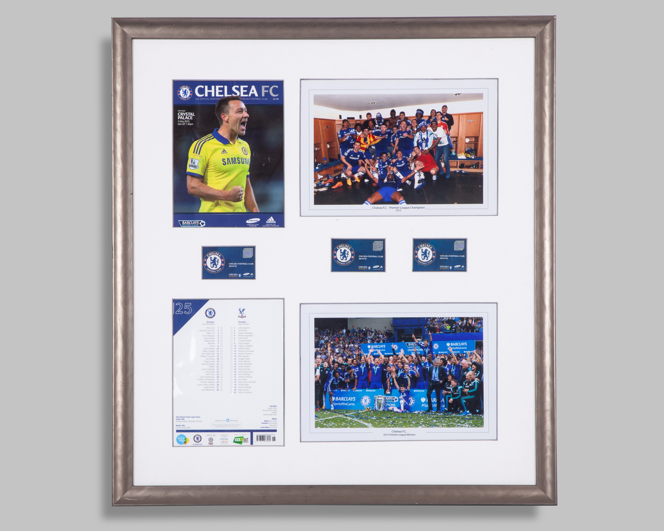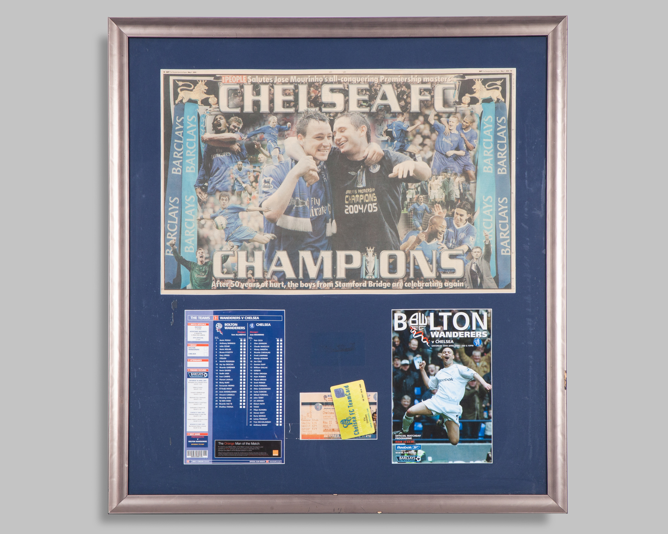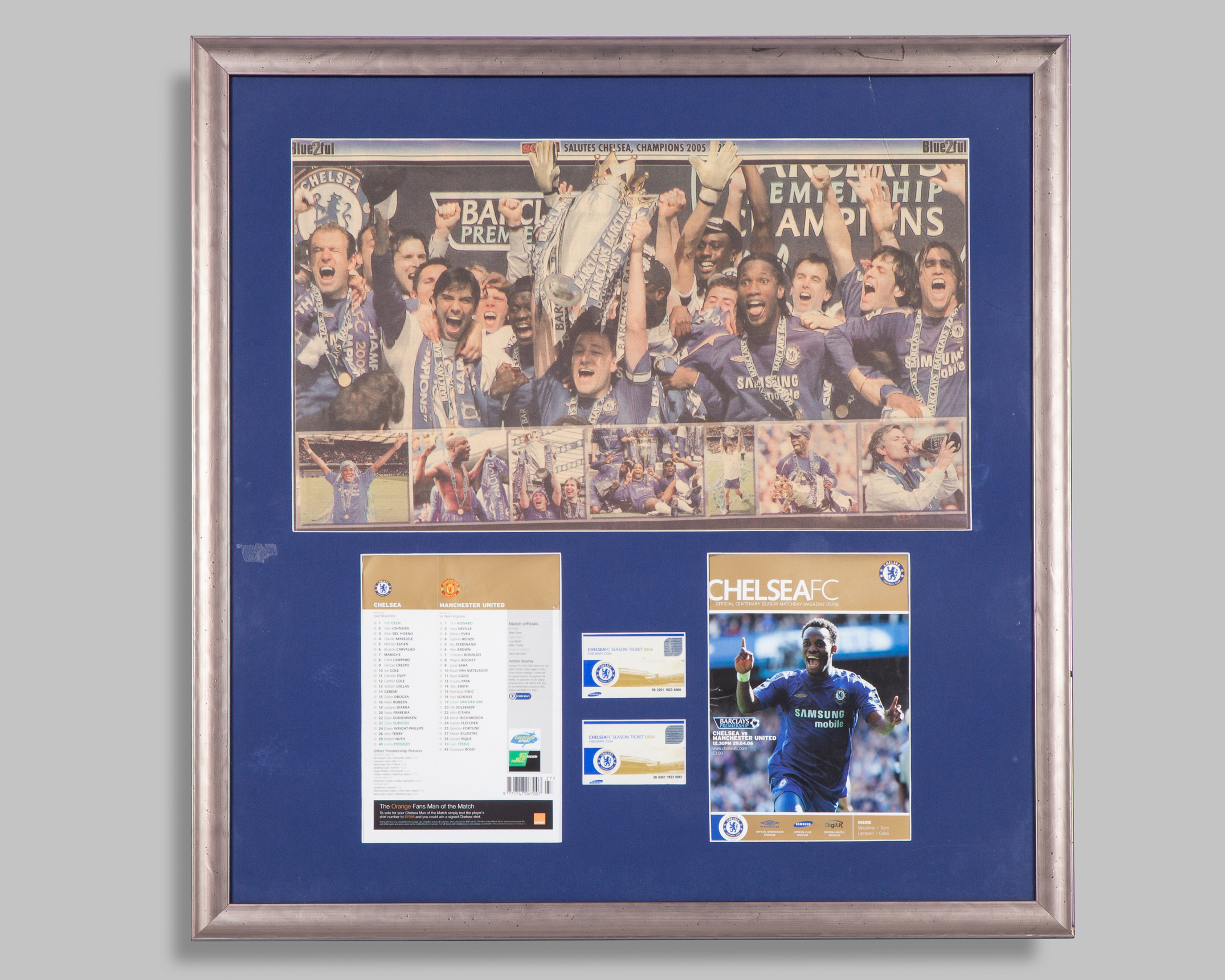 celebrating 2004-05, 2005-06 & 2014-15 Premier League titles, the 2007 F.A. Cup and the 2012 Champions League victory, variously mounted with programmes, tickets, newspaper coverage and other memorabilia, ranging in size from 49 to 61cm. to 72 by 84cm.