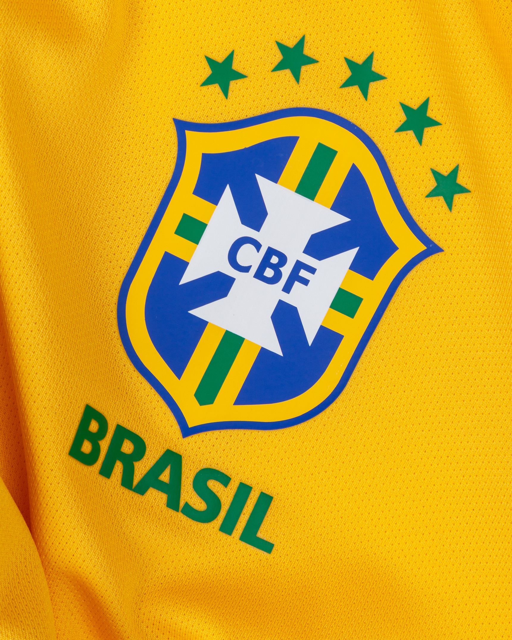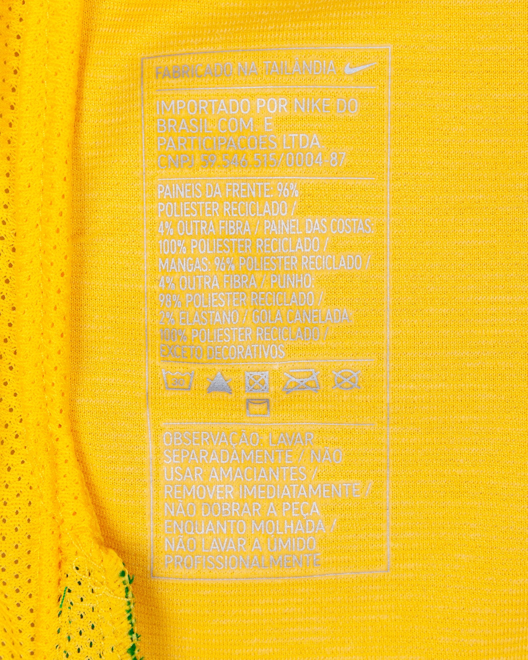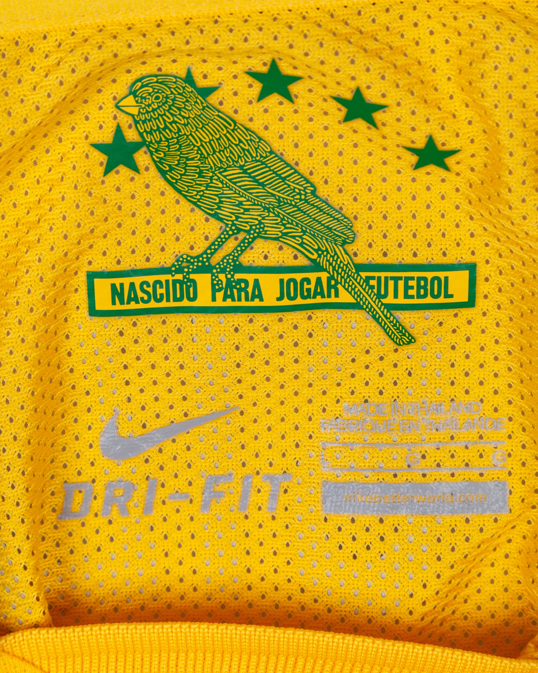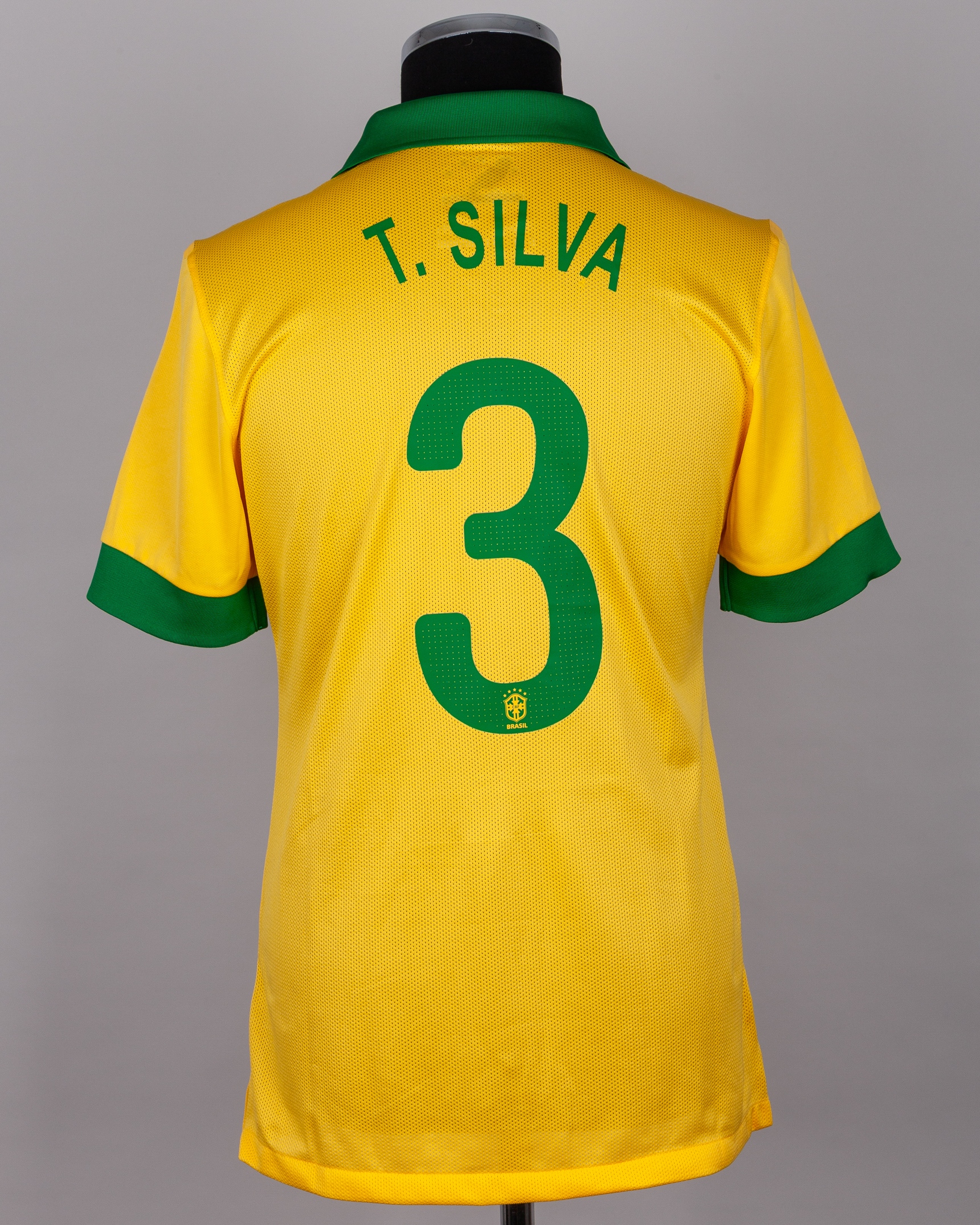 Thiago Silva yellow and green No.3 Brazil short-sleeved shirt, 2013, Nike, L, with v-neck style collar and printed badge, the reverse lettered T. SILVA, with some staining