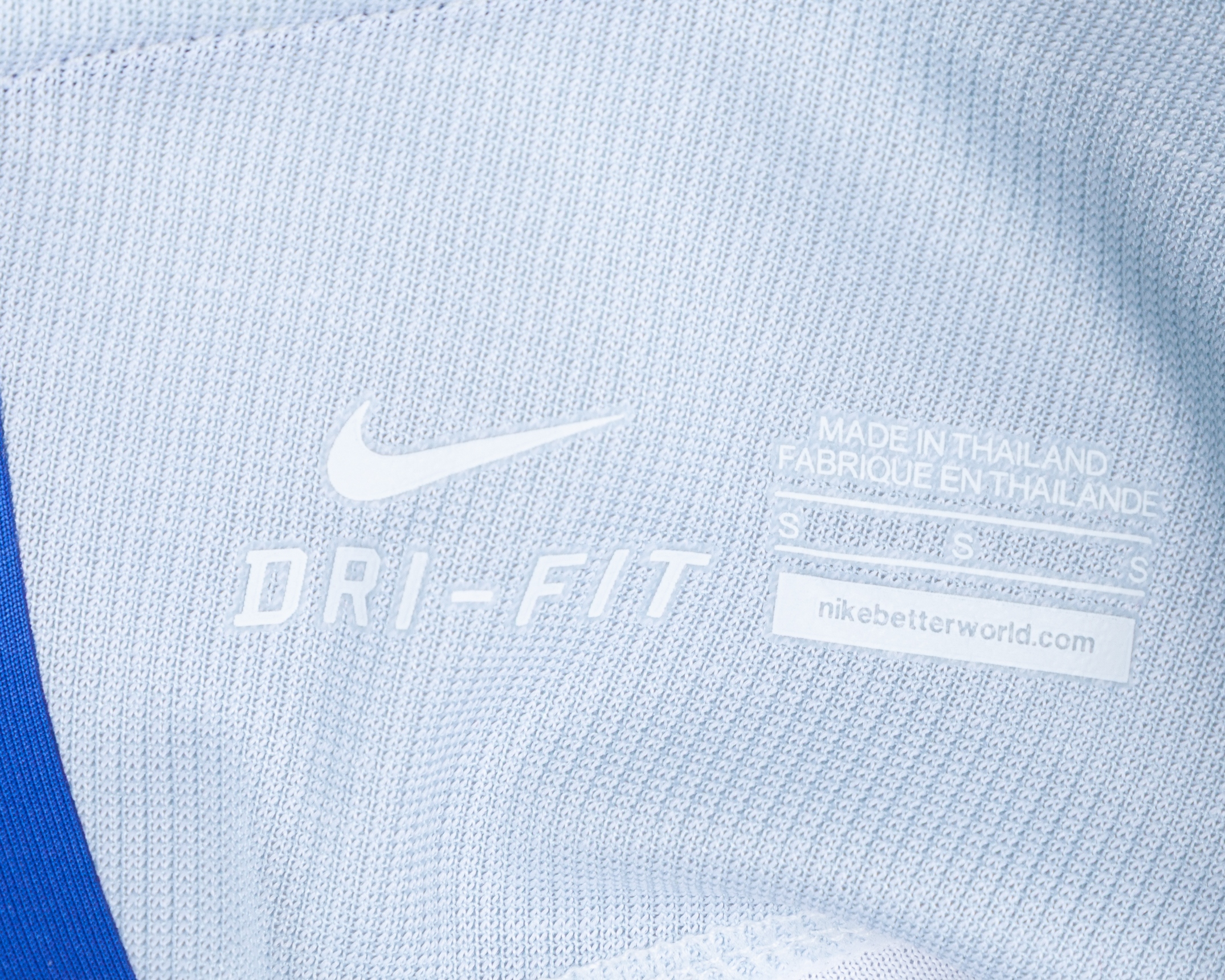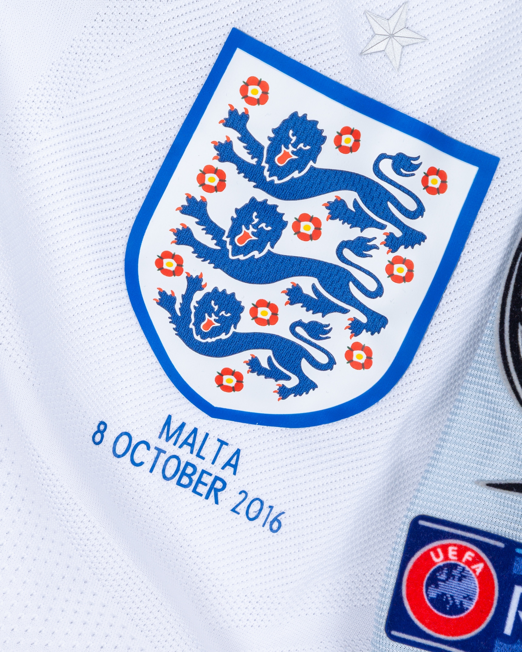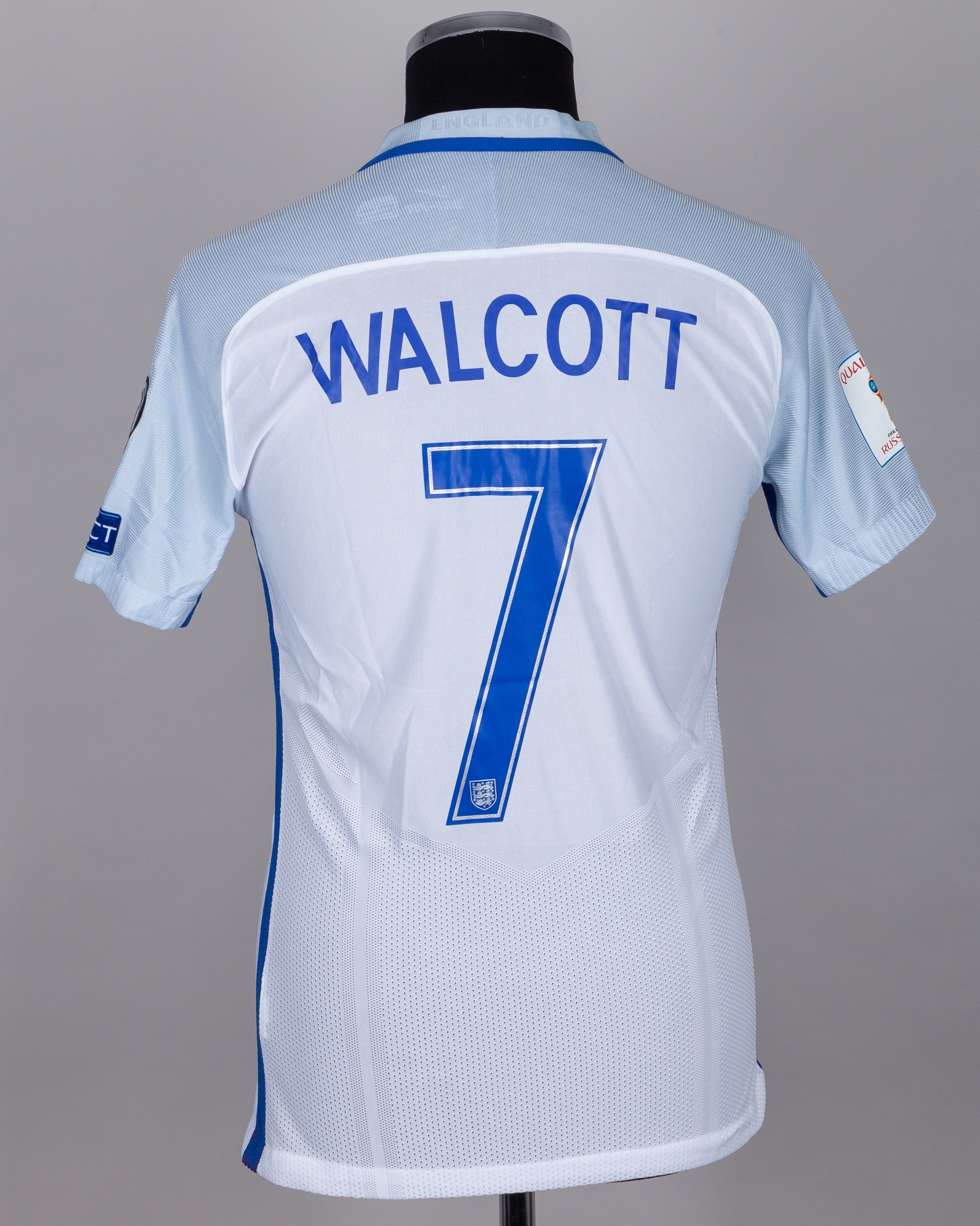 Theo Walcott white and blue No.7 England v. Malta short-sleeved shirt, 2016, Nike, S, with v-neck collar and printed badge, with MALTA 8 OCTOBER 2016 decal, the reversed lettered WALLCOTT, the right sleeve with Qualifiers FIFA World Cup Russia 2018 flash and the left sleeve with respect flash, the front of the shirt re-numbered from 8 to 7