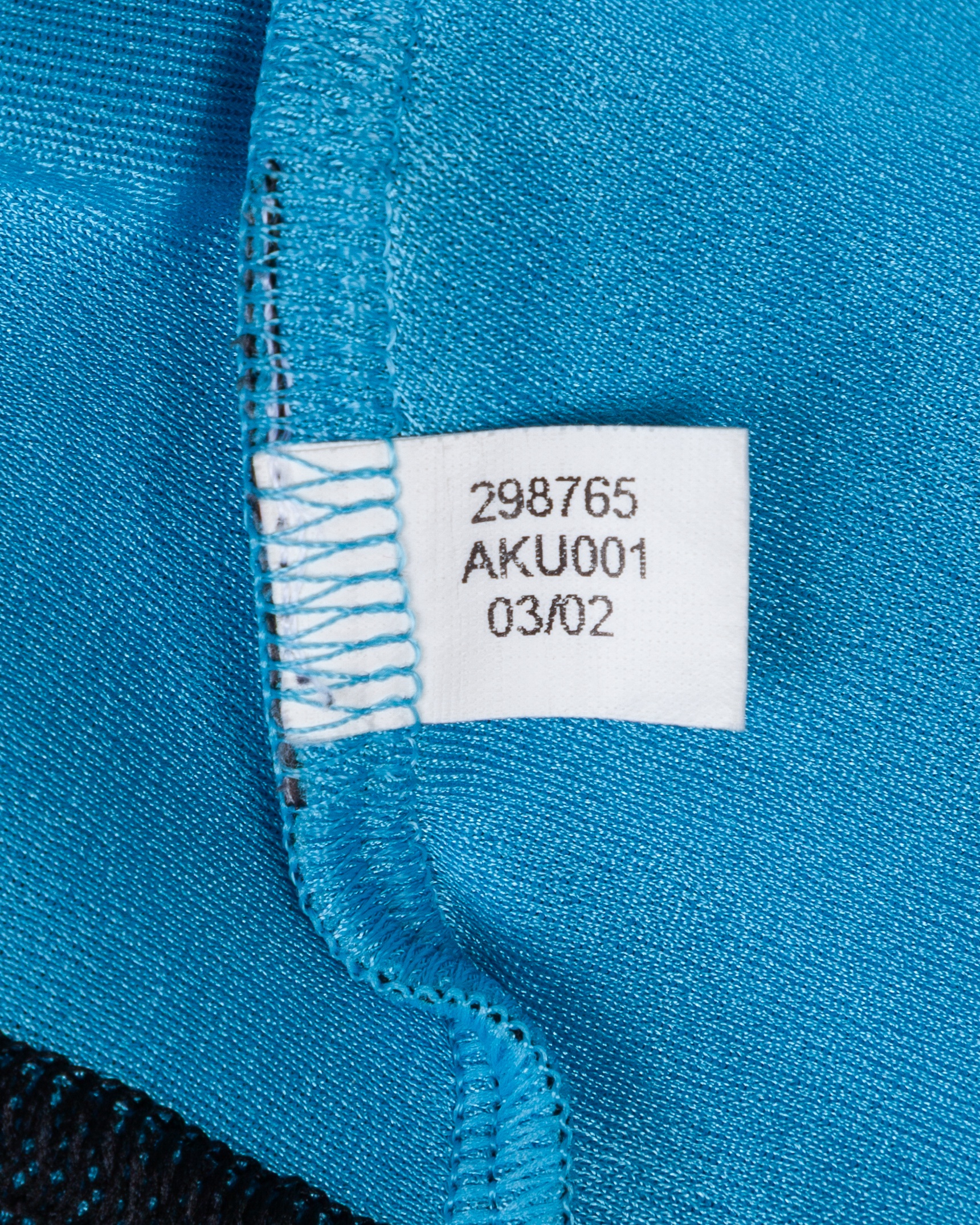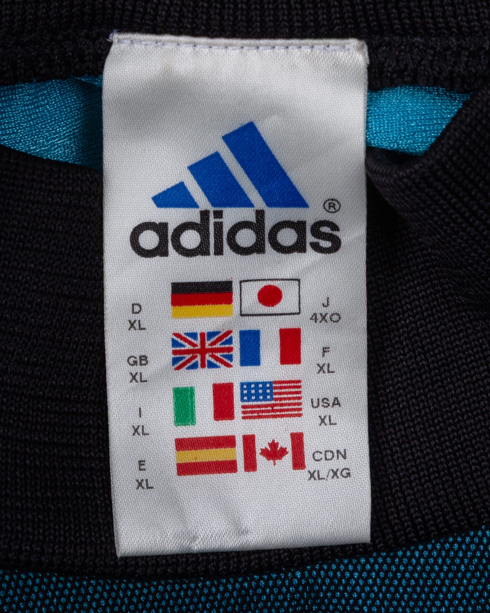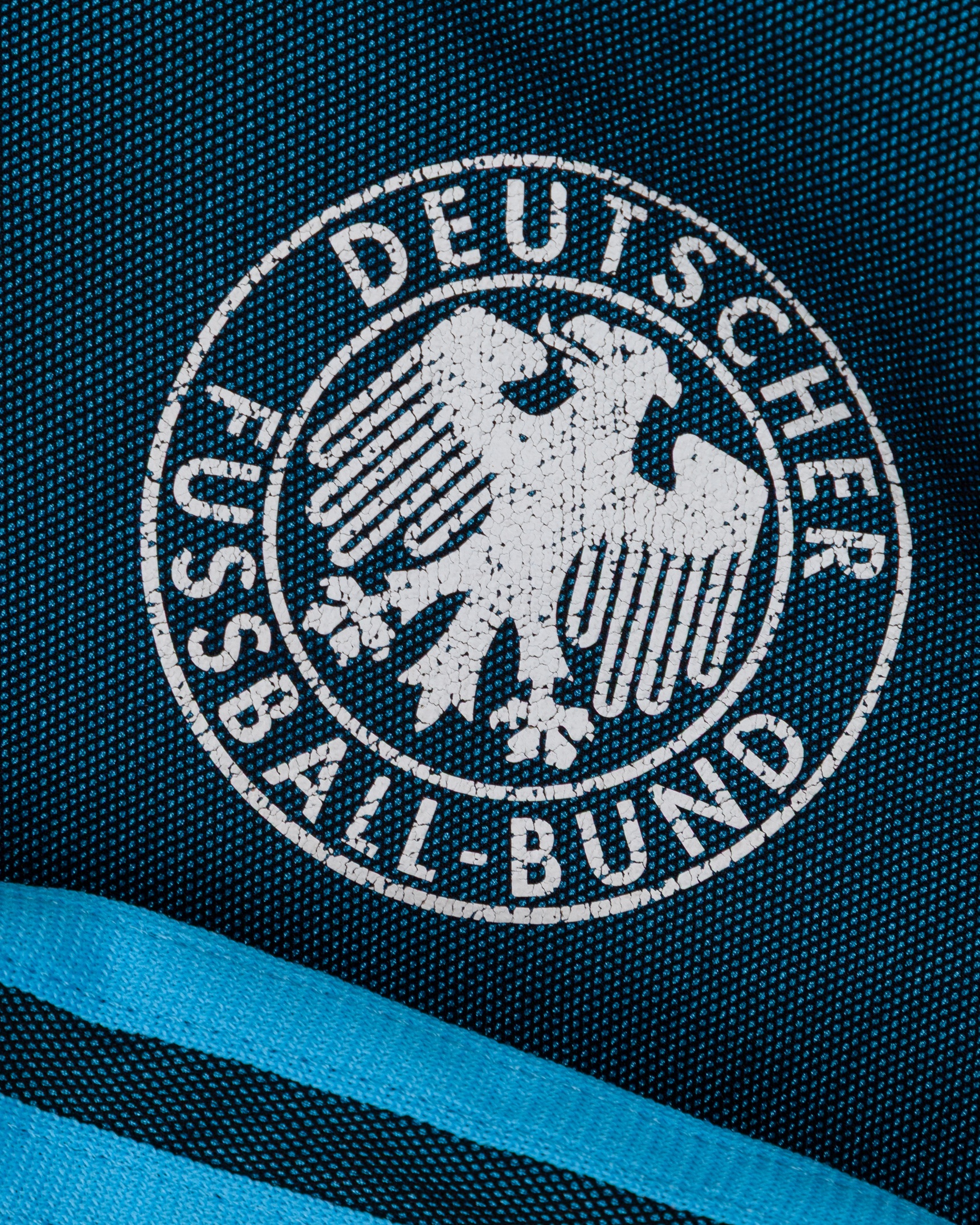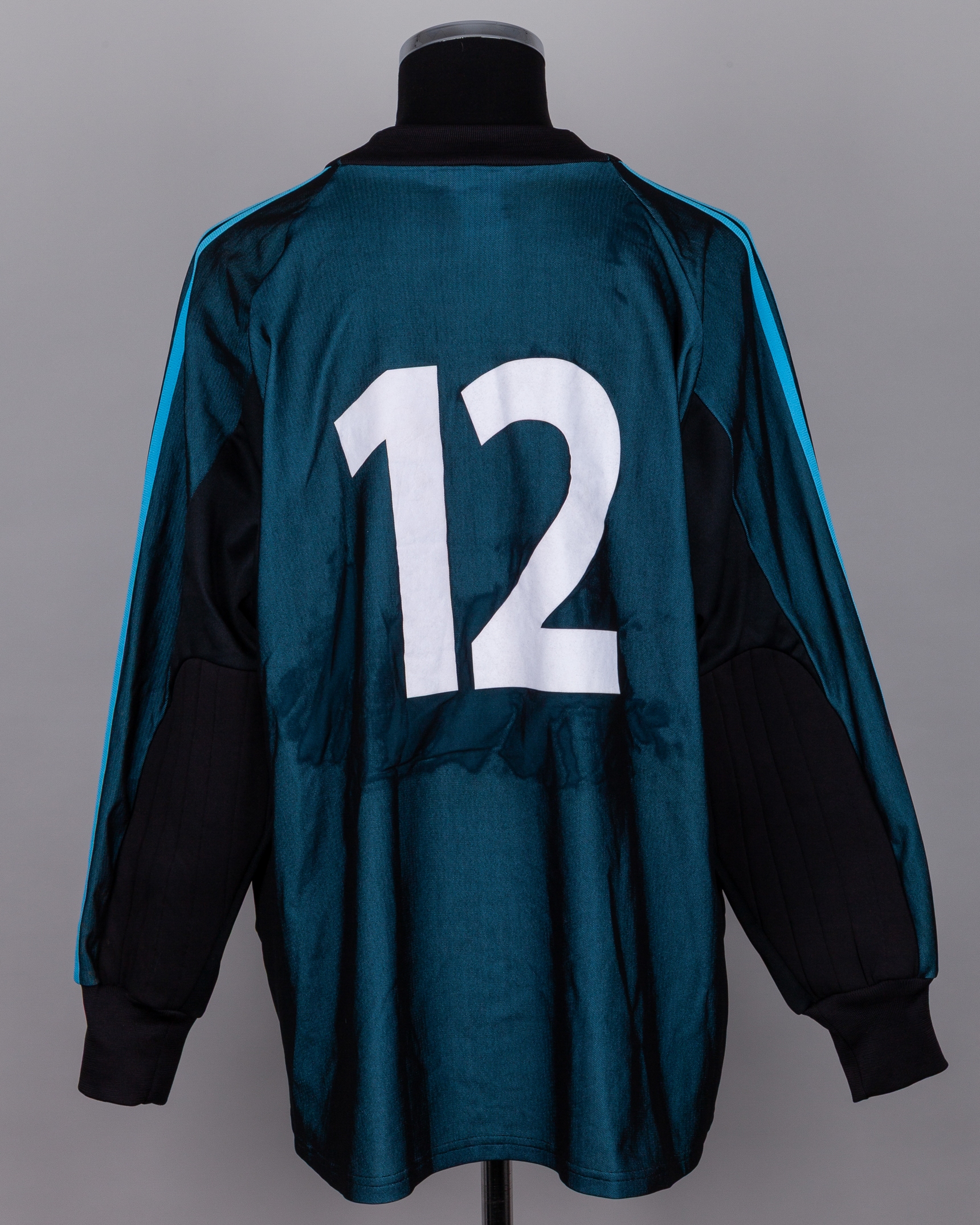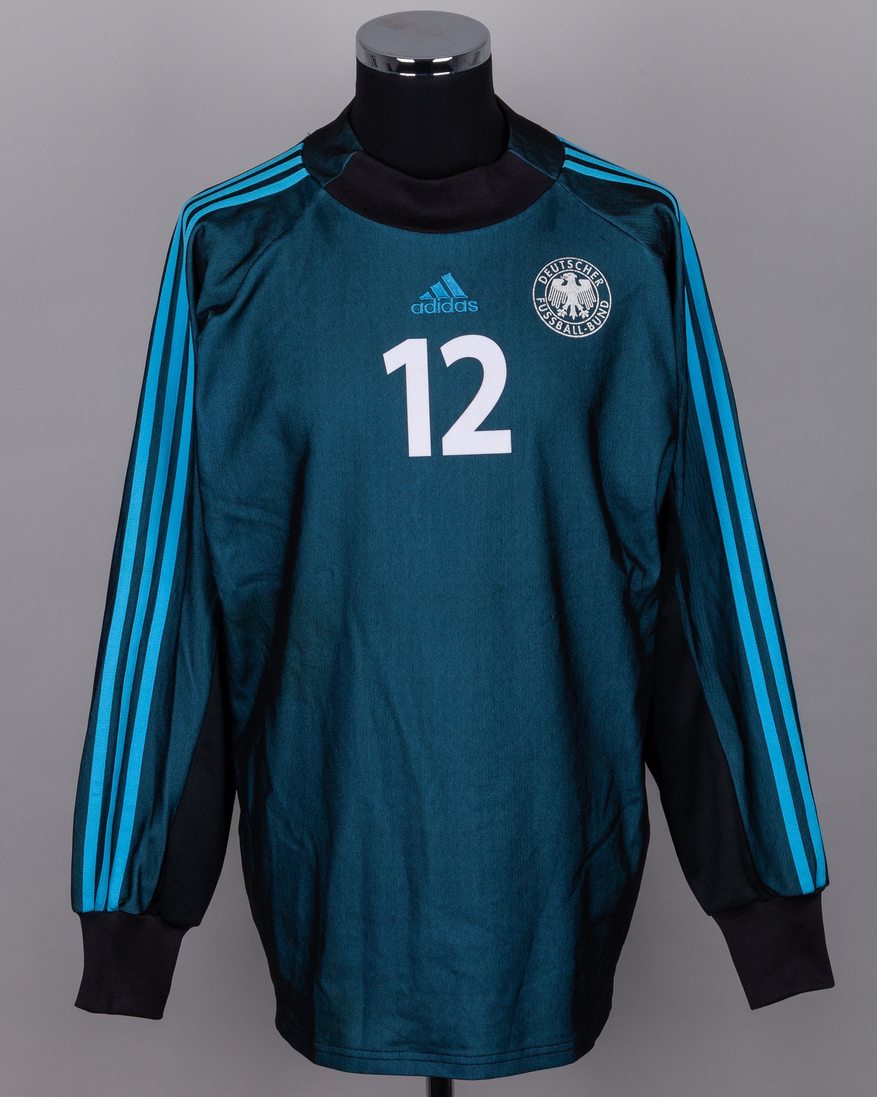 Blue and black No.12 Germany goalkeeper shirt, Adidas XL, with crew-neck collar and printed badge, small hole in front