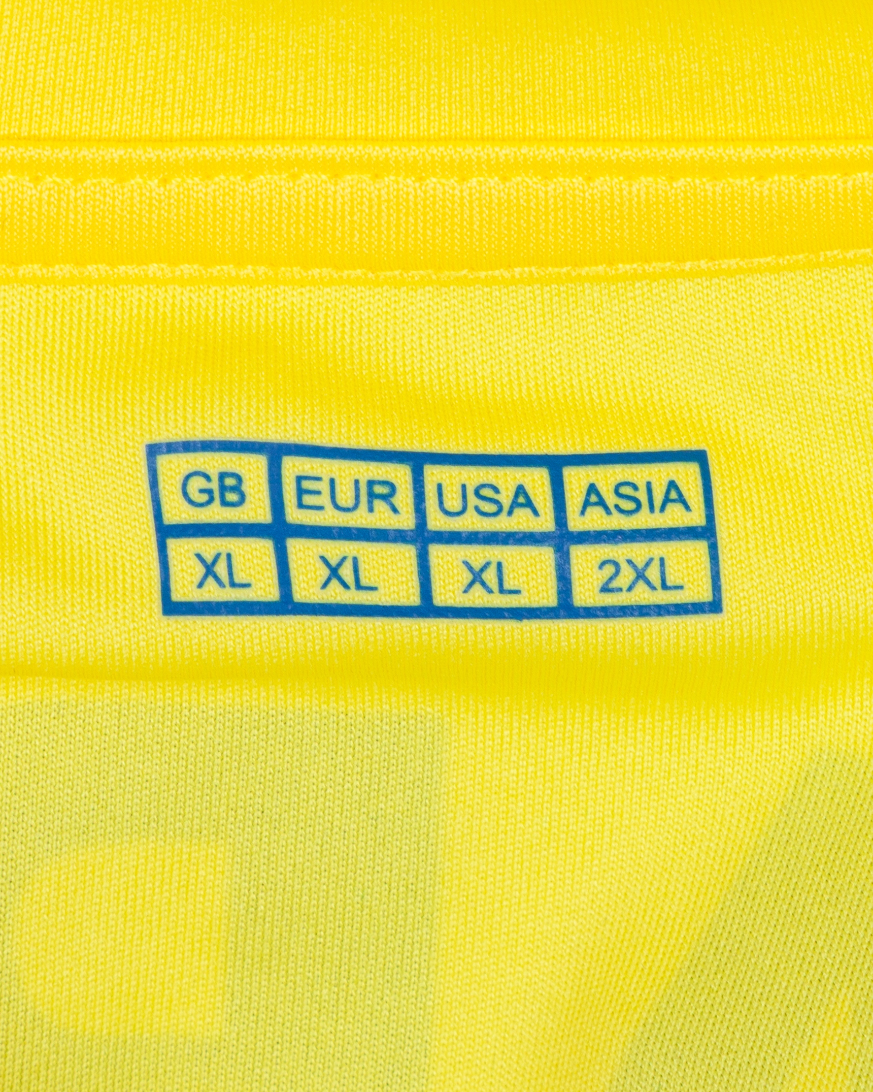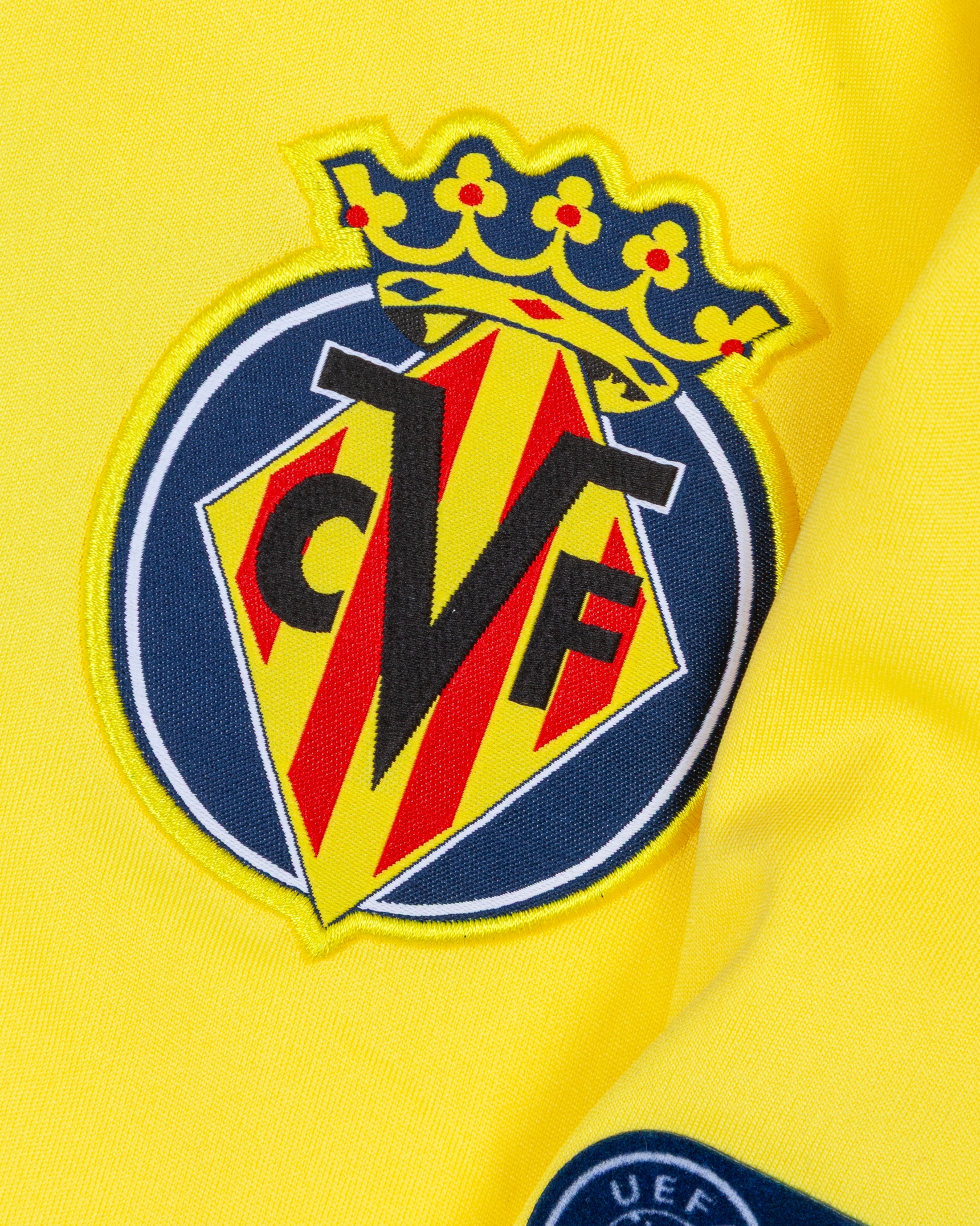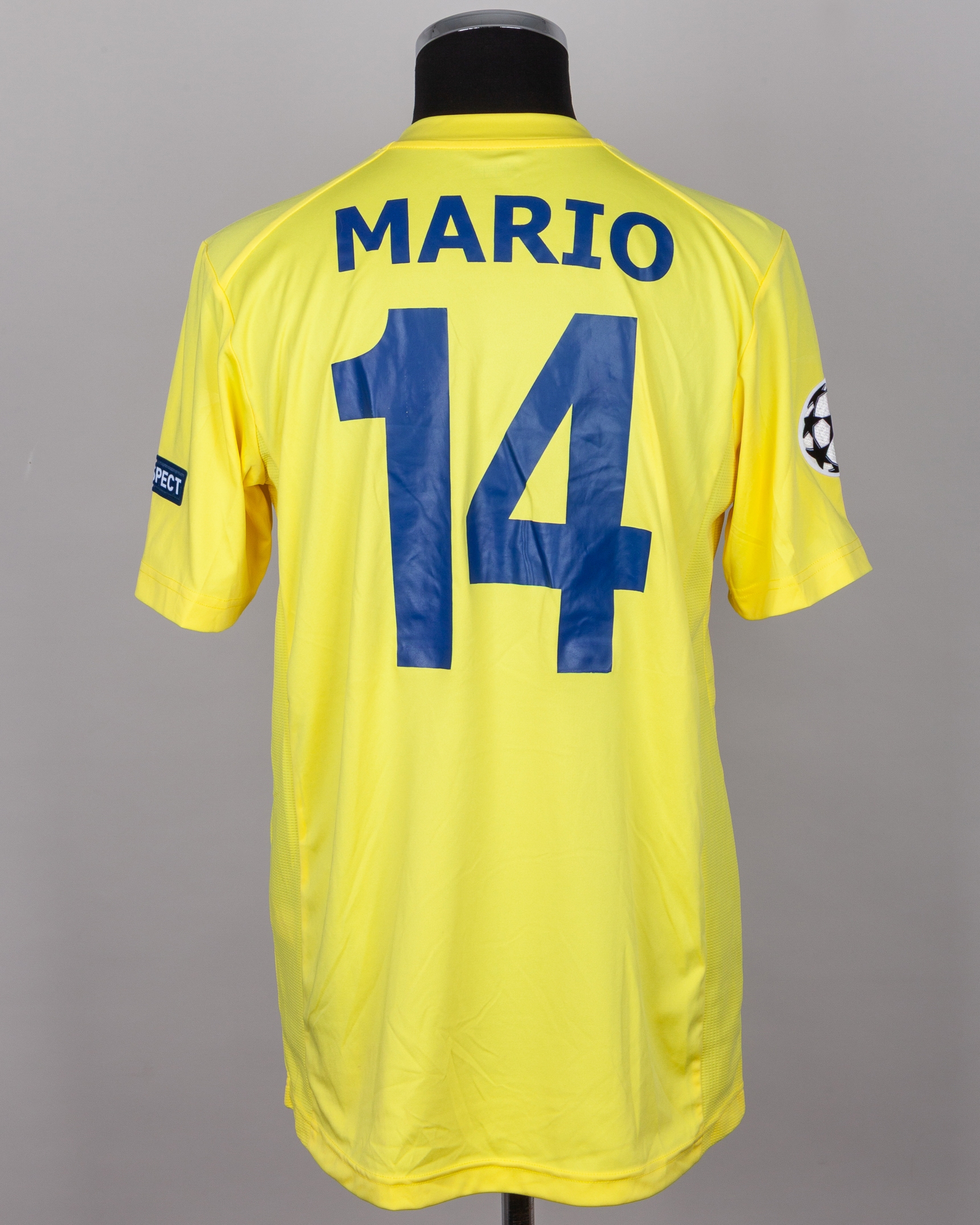 Mario Gaspar yellow No.14 Villarreal v. Manchester City match worn short-sleeved shirt, 2011, Xtep, XL, with v-neck collar and embroidered cloth badge, the reverse lettered MARIO, the right sleeve with Champions League flash and the left with respect flash