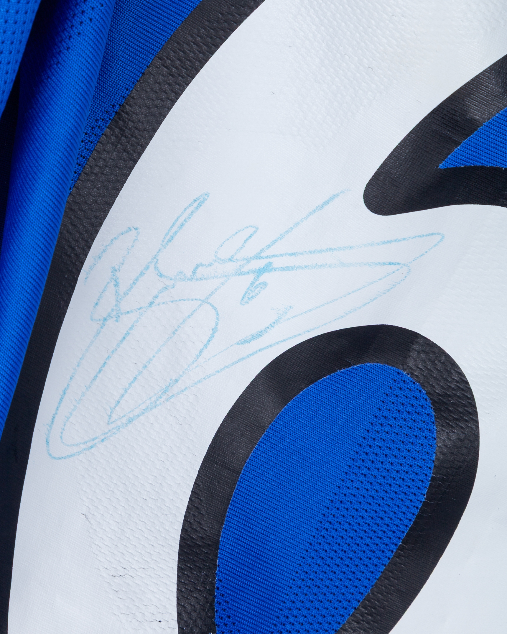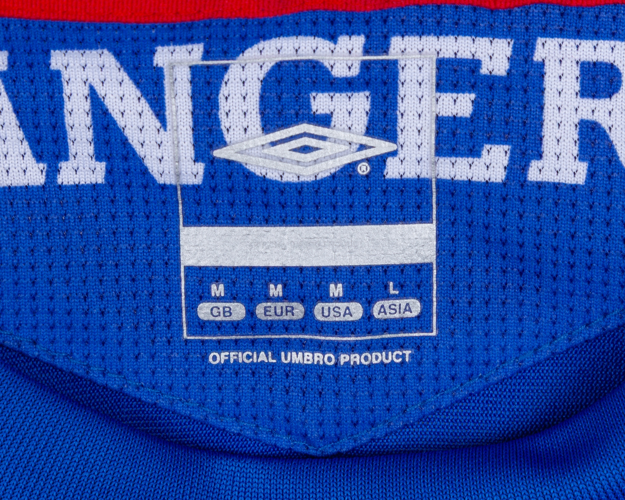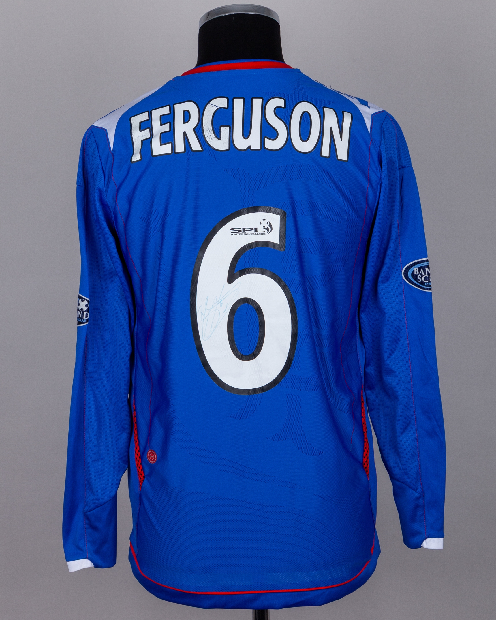 Barry Ferguson blue No.6 Rangers long-sleeved 2006, Umbro, M, with a v-neck collar, and embroidered badge RFC, reverse lettered FERGUSON, autographed on the number, the sleeves with Bank of Scotland Premier League flashes