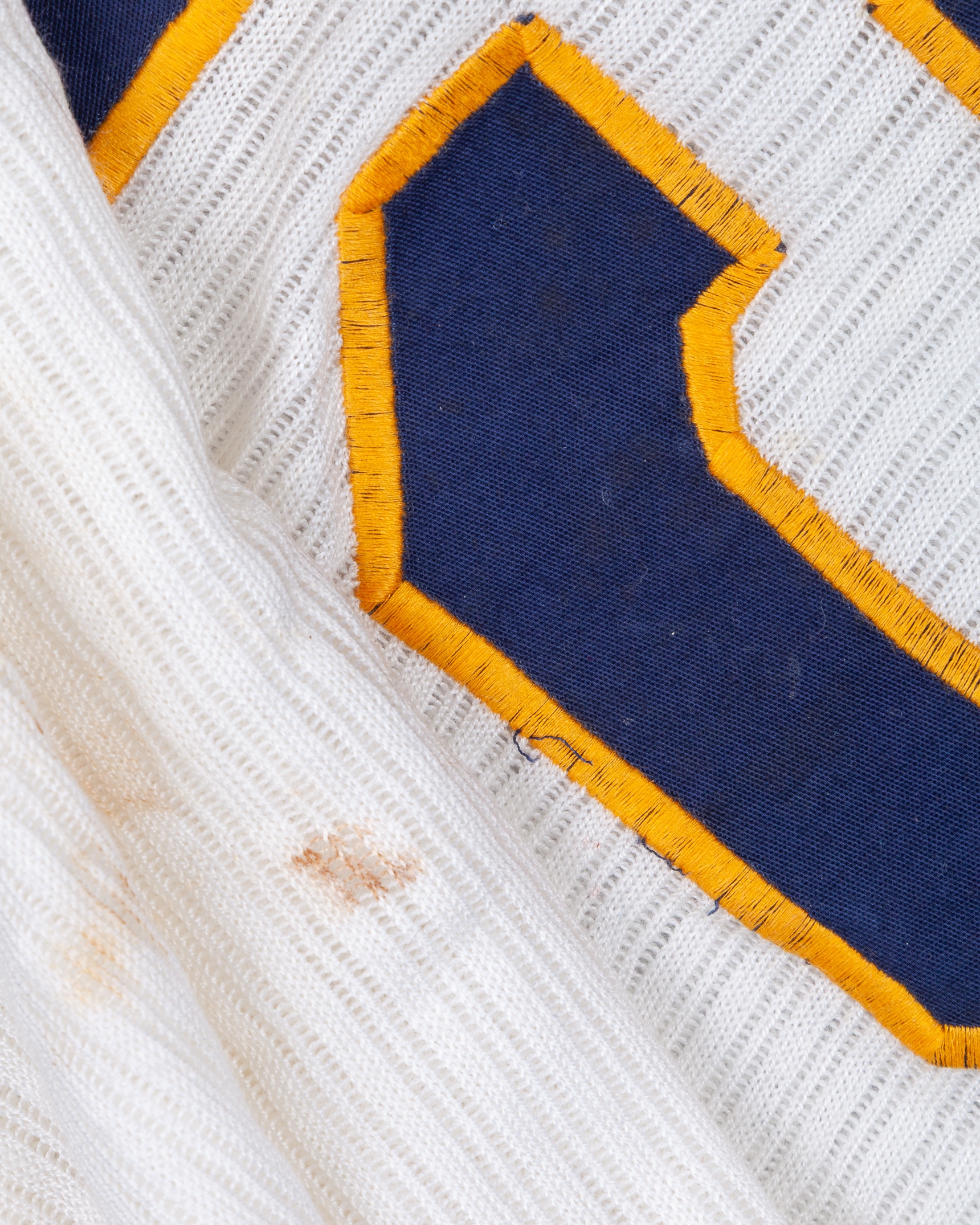 White, blue and yellow No.19 Aliancia Clube short-sleeved shirt, c.1970s, Terres, 48, with v-neck collar and embroidered cloth badge inscribed ALIANCIA CLUBE, with staining