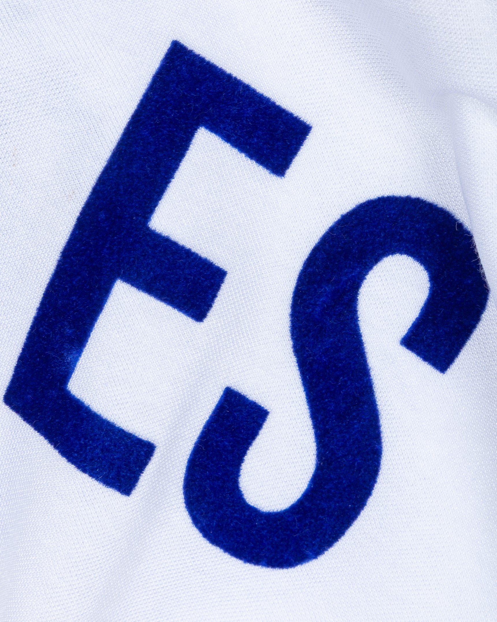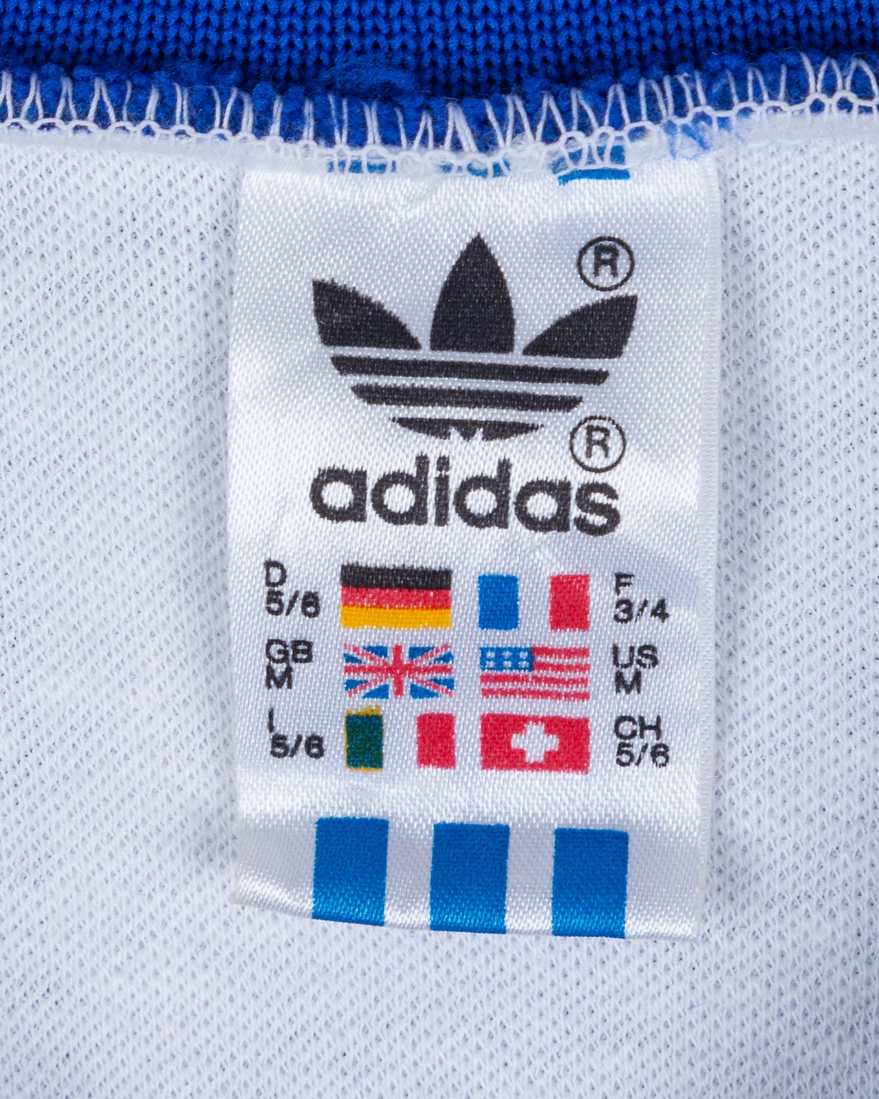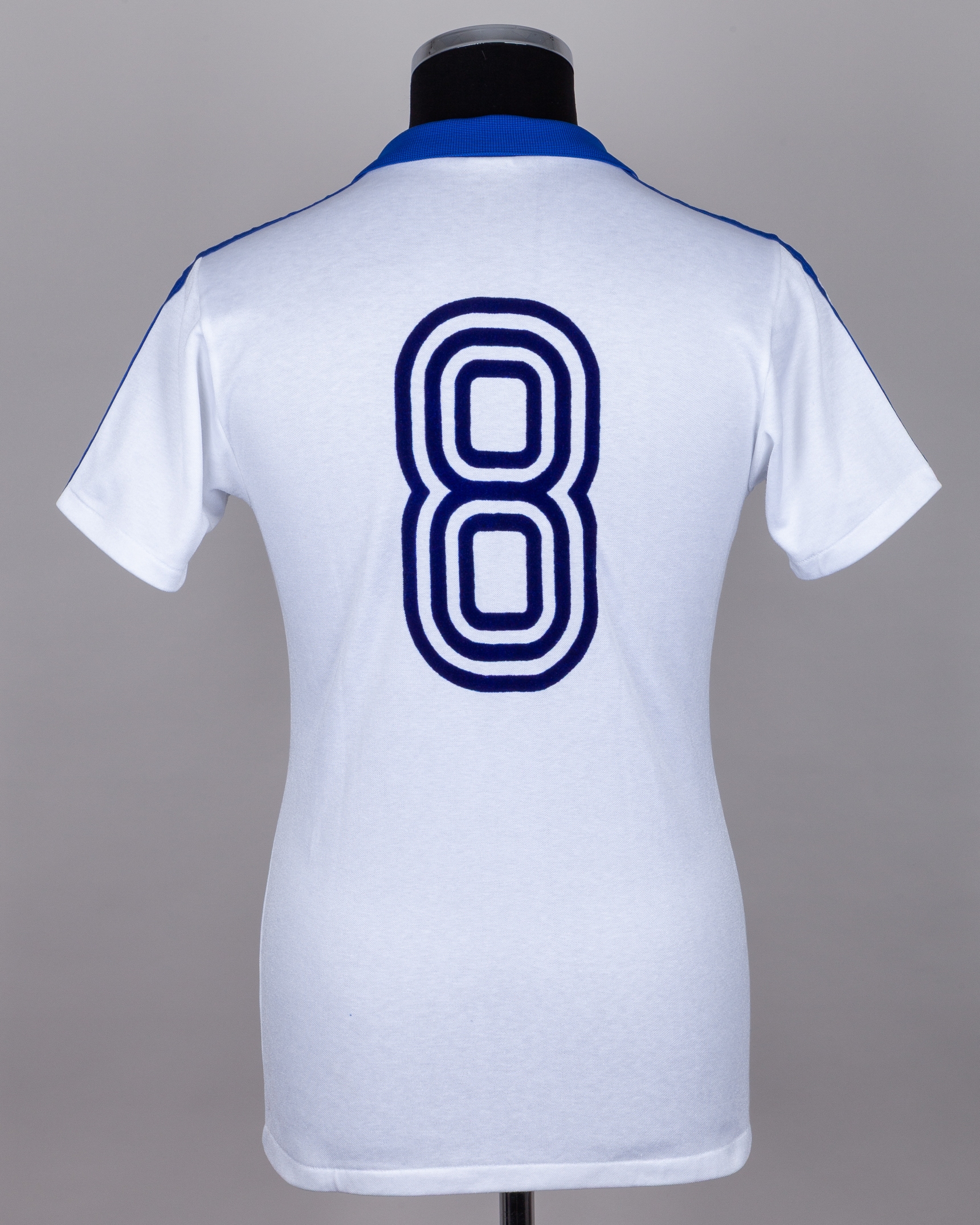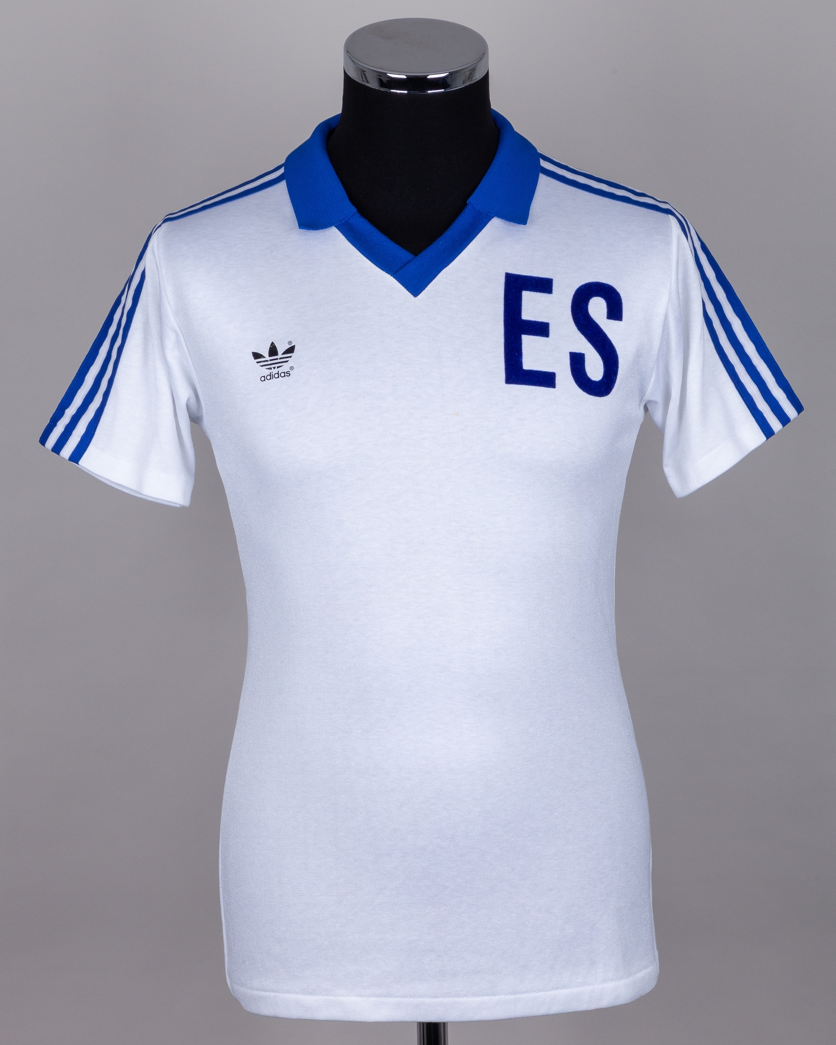 Jose Luis Rugamas white and blue No.8 El Salvador v. Hungary match worn short-sleeved shirt, 1982, Adidas, M, with v-neck collar and felt badge