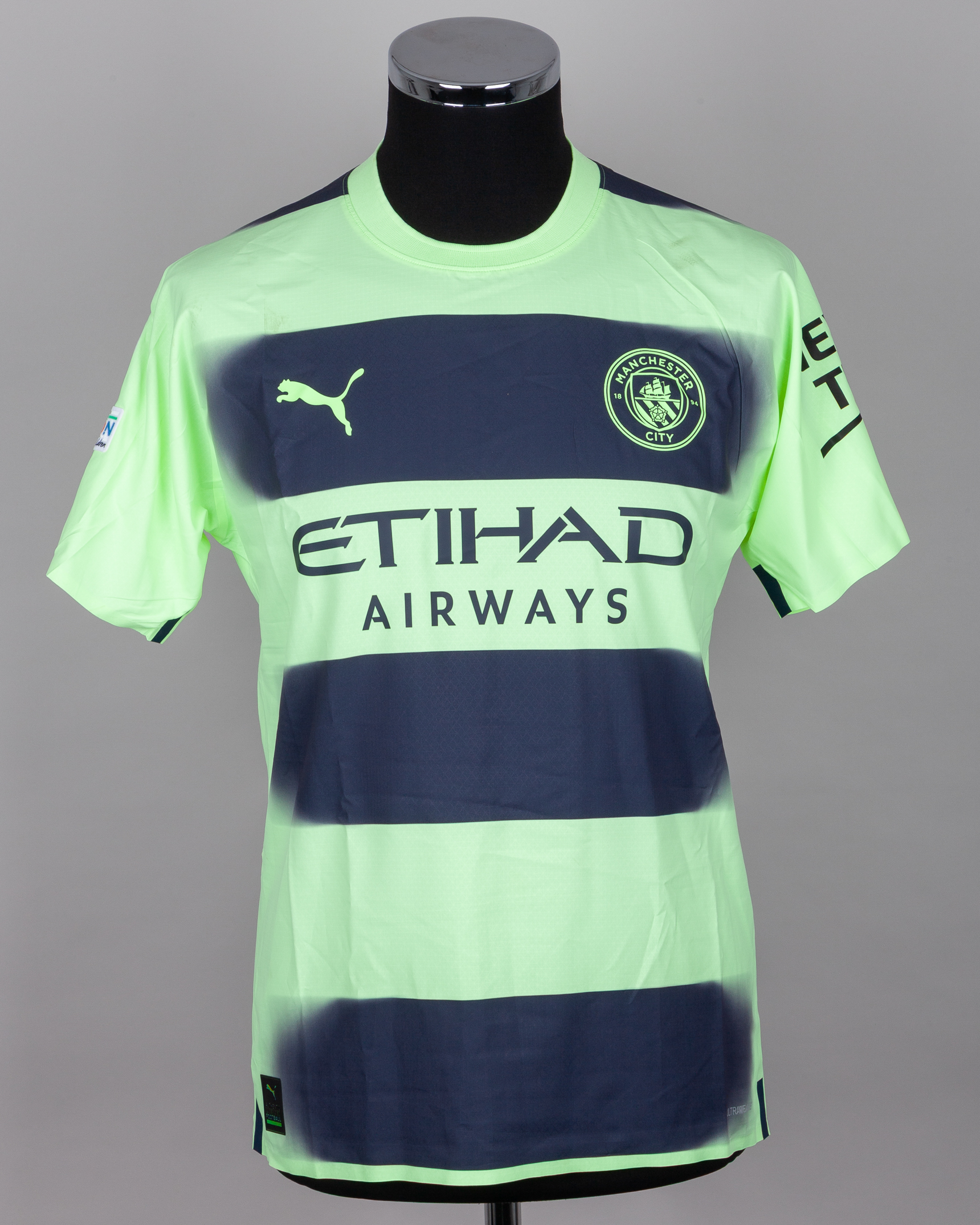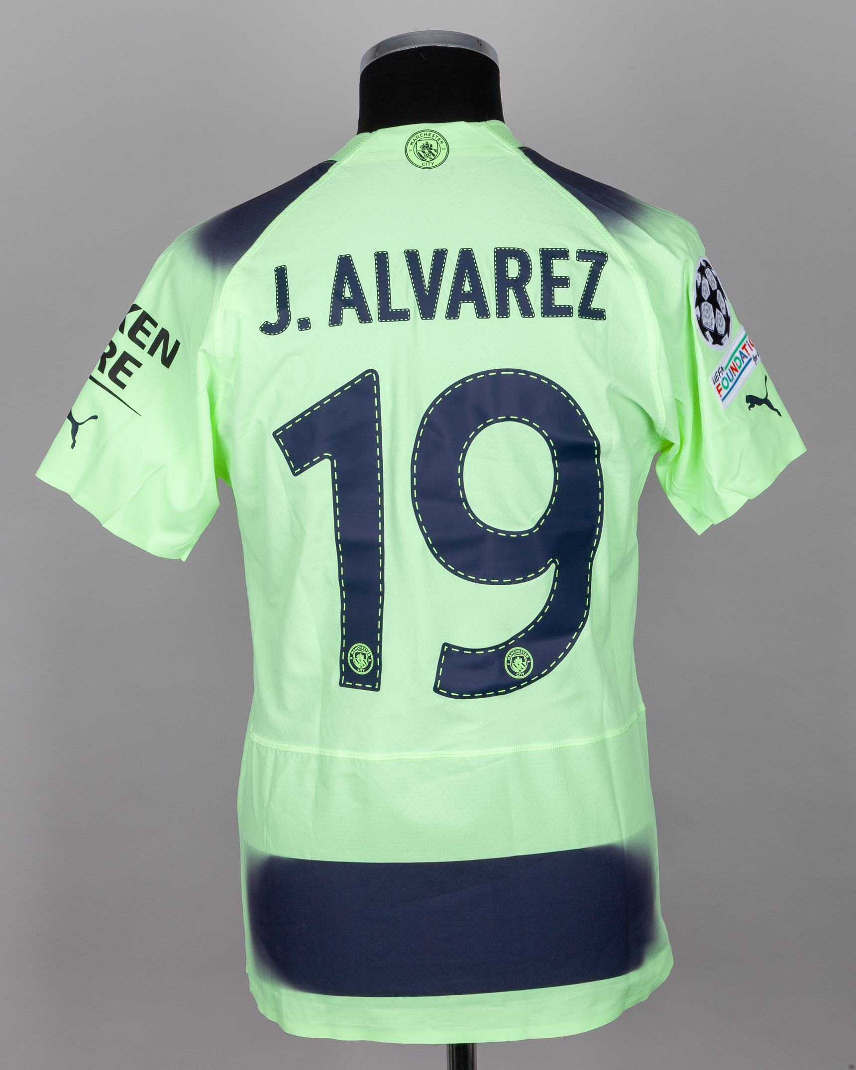 Julian Alvarez yellow and black N0.19 Manchester City v. Bayern Munich short-sleeved shirt, 2023, Puma, S, with crew-neck collar and printed badge, the reverse lettered J.ALVAREZ, the right sleeve with Champions League and UEFA foundation flashes, with some staining