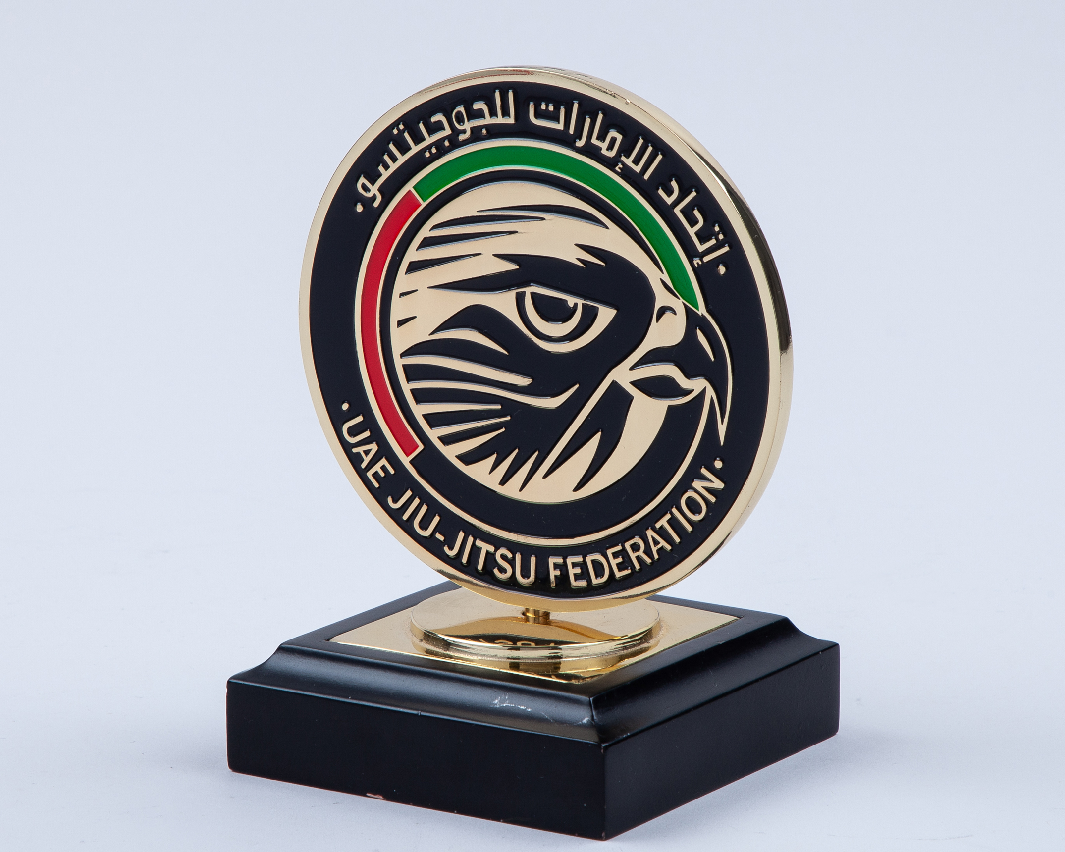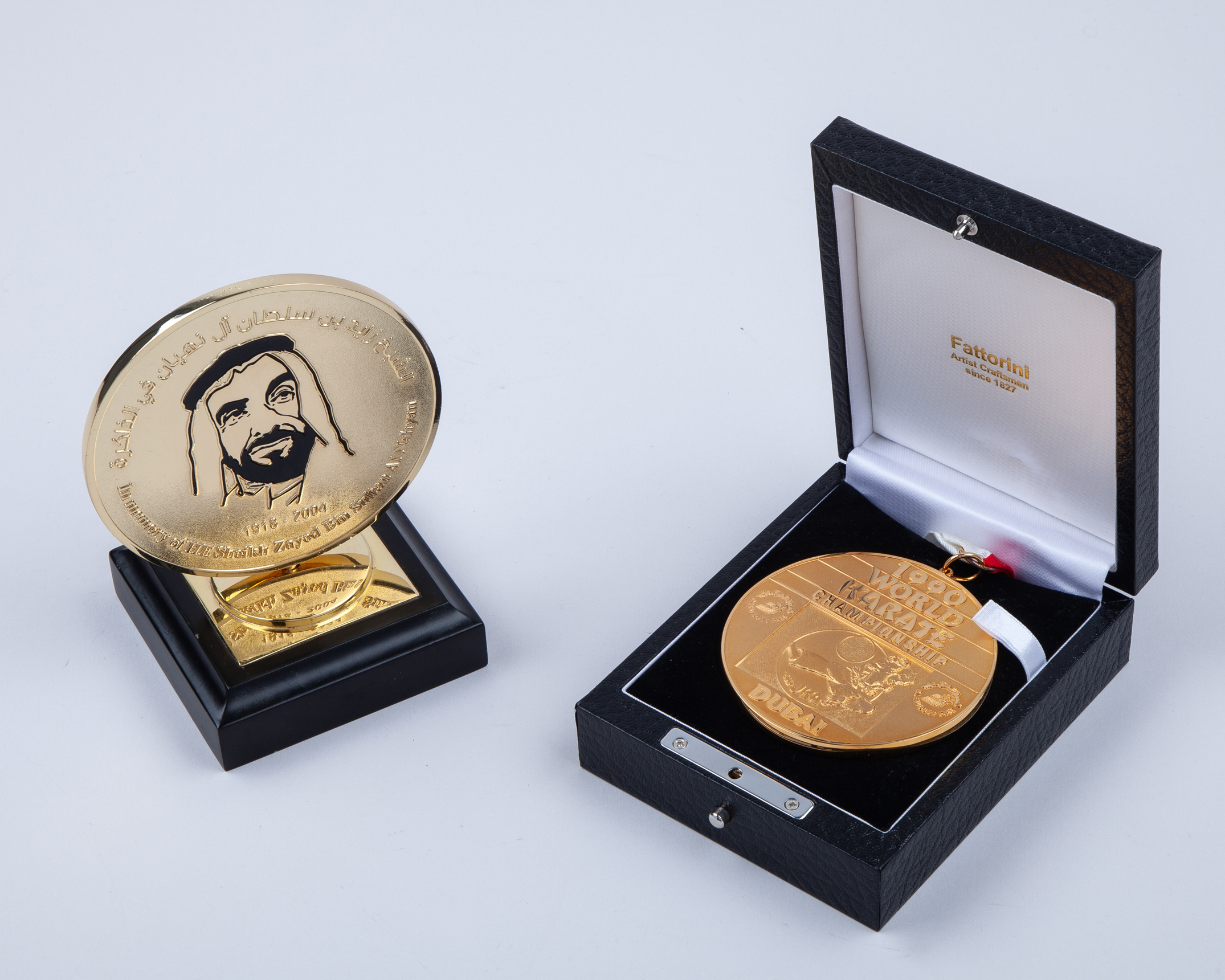 Large yellow-metal 1990 World Karate Championship medal, by Fattorini, the obverse inscribed 1990 WORLD KARATE CHAMPIONSHIP, DUBAI, with ribbon in original box and a Jiu-Jitsu Federation (2)
