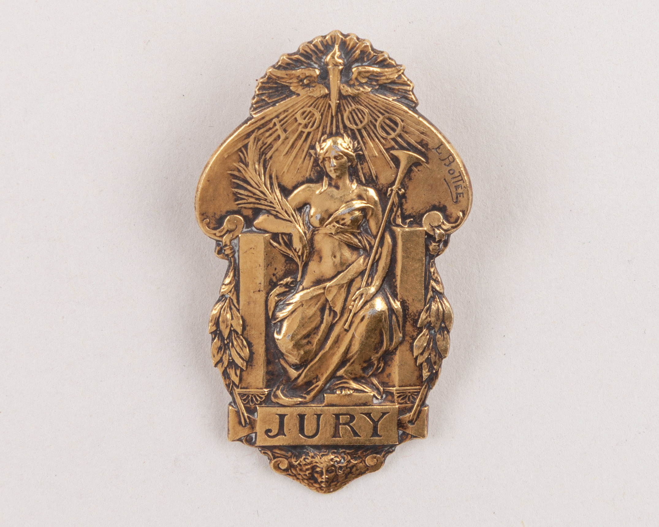 The 1900 Olympic Games, Paris: a rare gilt Olympic juror's identification badge signed L. Bottee, the obverse inscribed 1900, JURY, the stud inscribed Christofle, Orfevres Paris