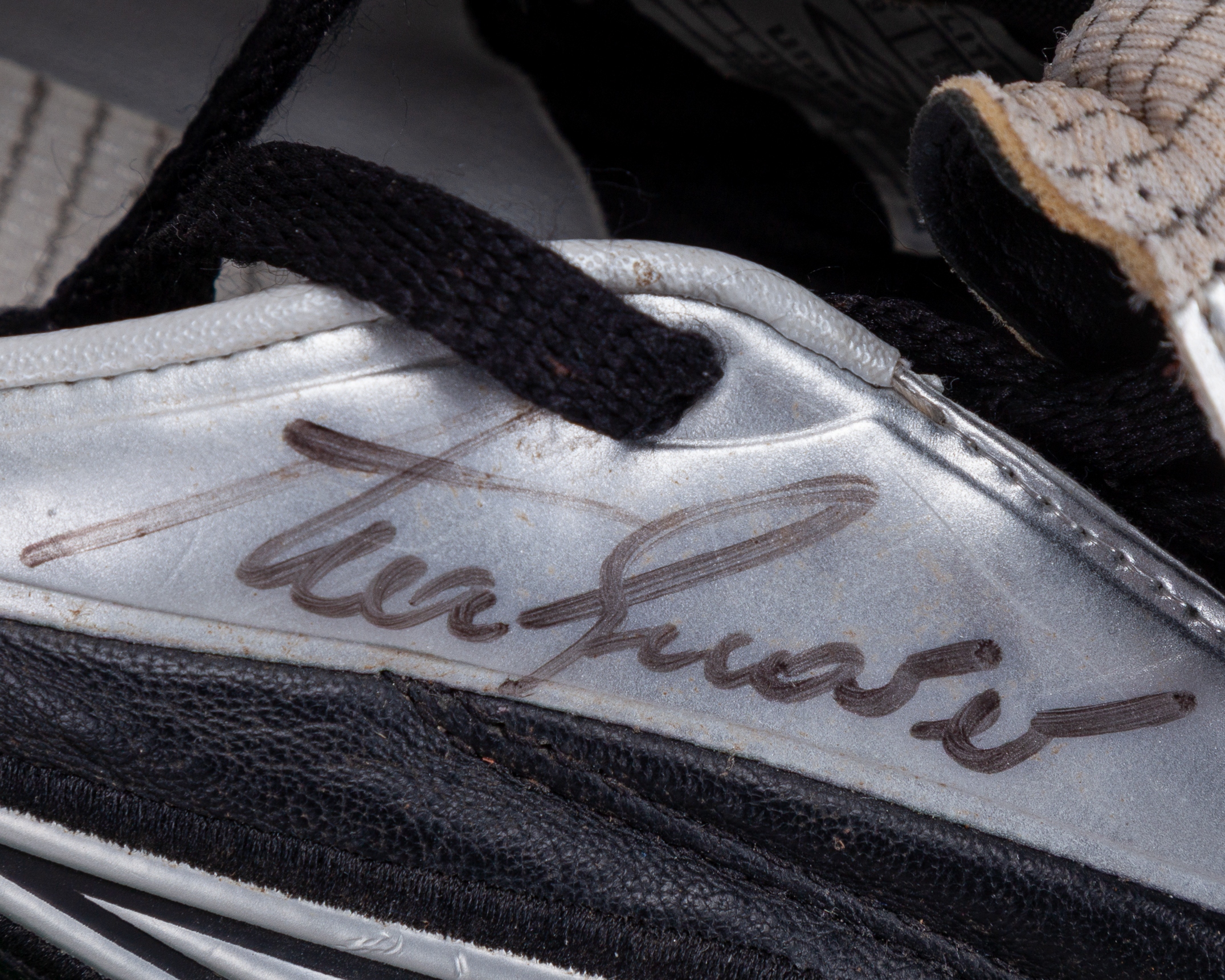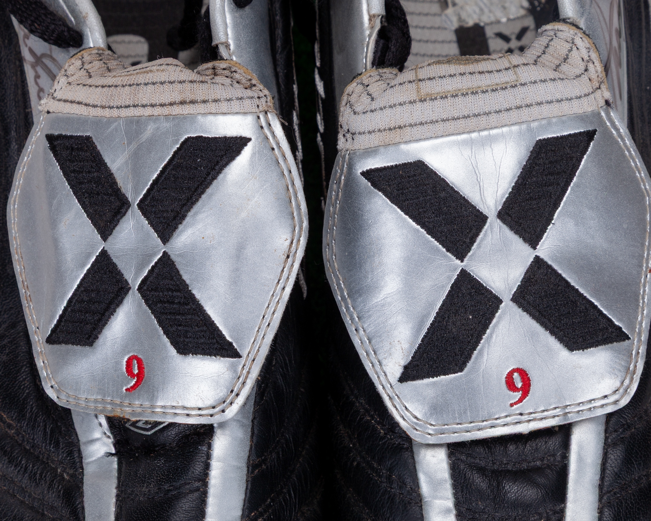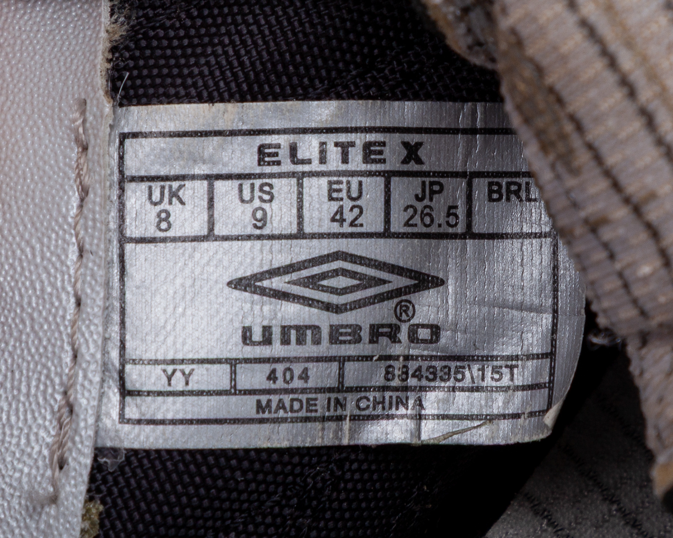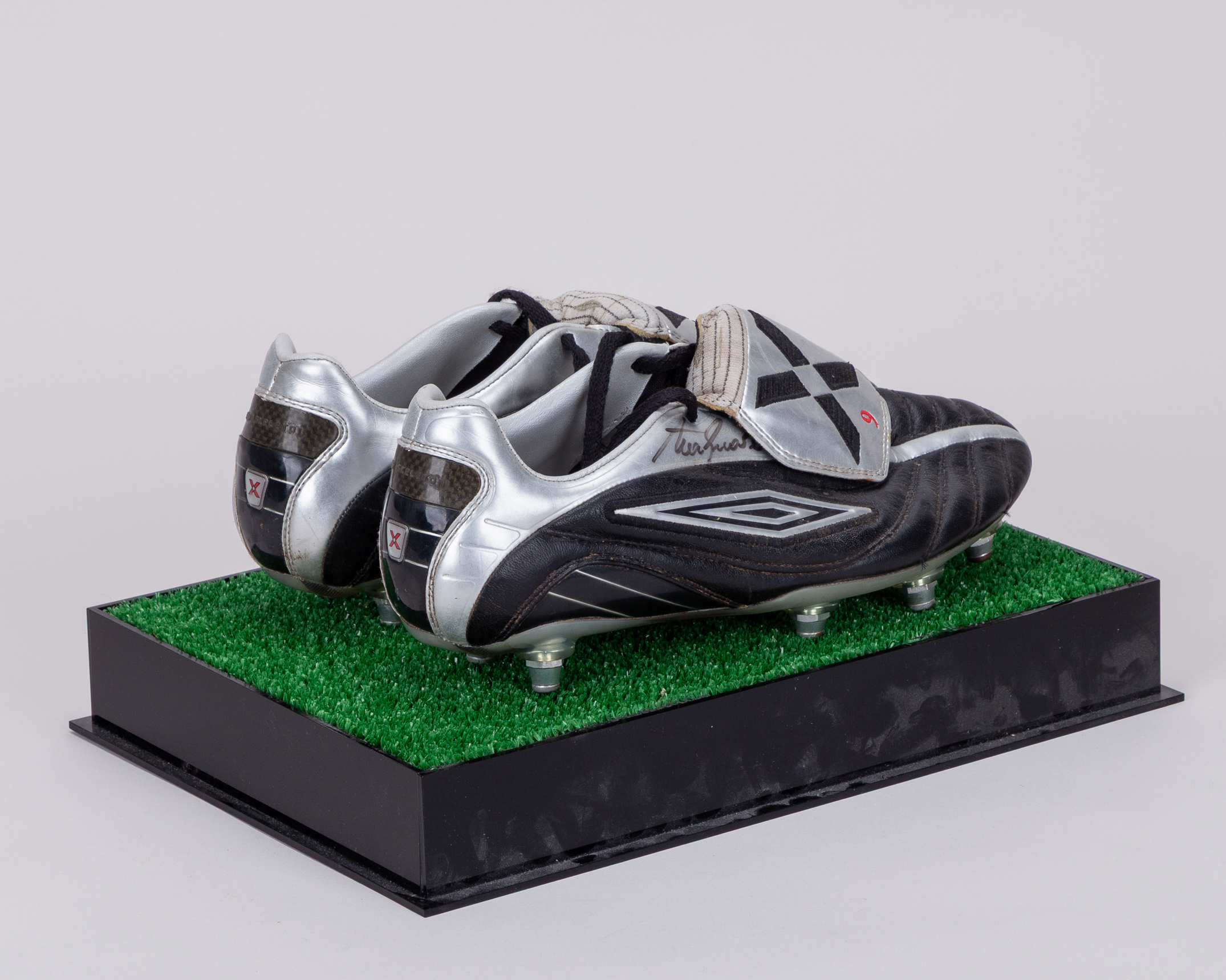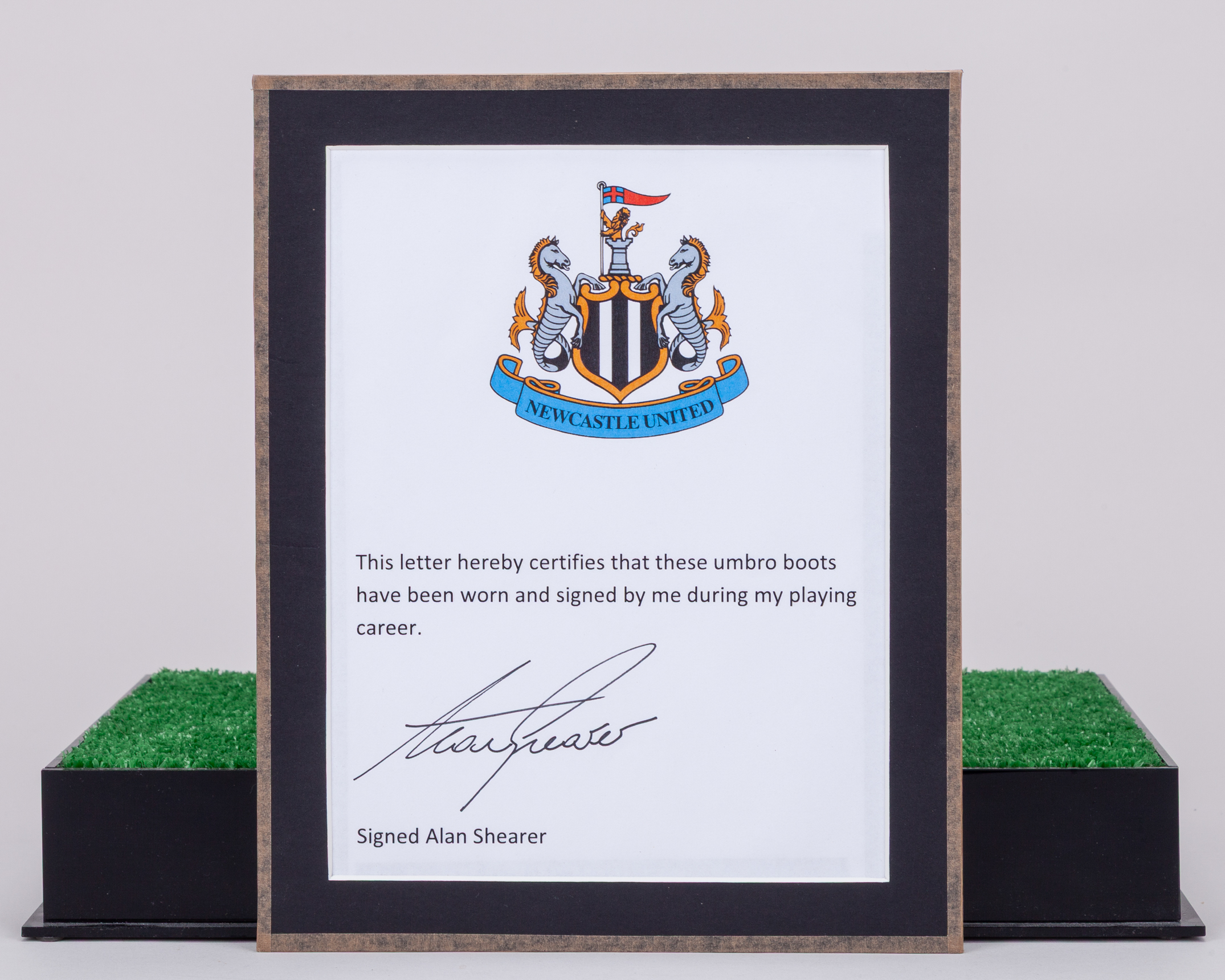 Alan Shearer a pair of Umbro Elite X match worn autographed football boots, 2004, UK Size 8, each boot autographed by Alan Shearer, the tongues inscribed 9, with signed letter of authenticity signed by Alan Shearer stating he wore the boots and photographs of the vendor with Shearer