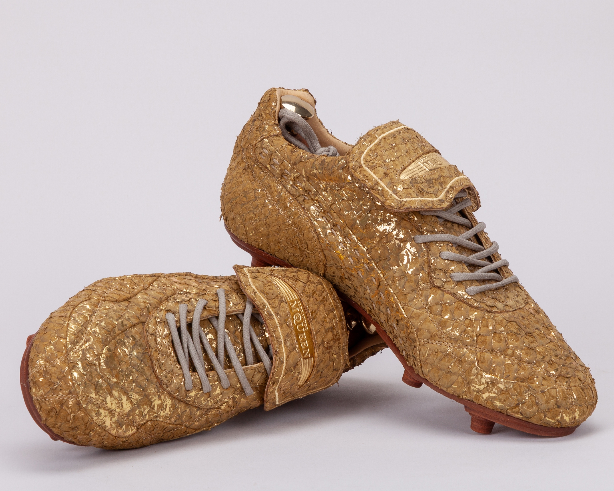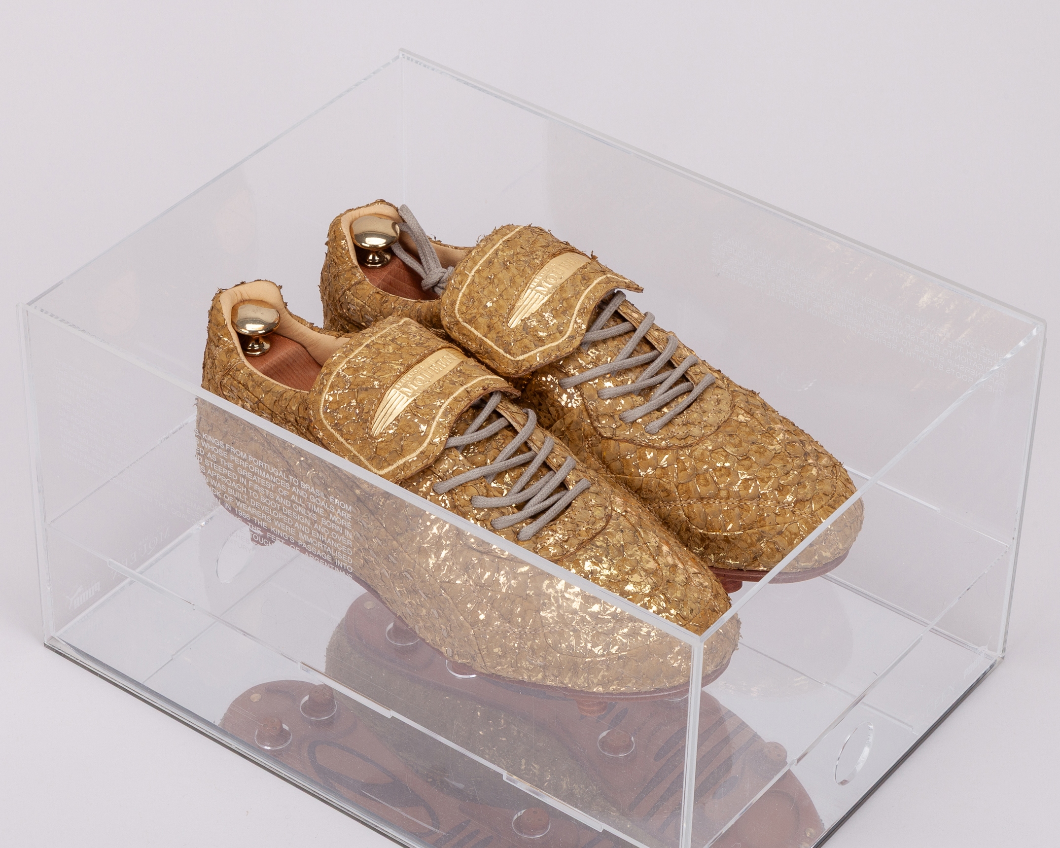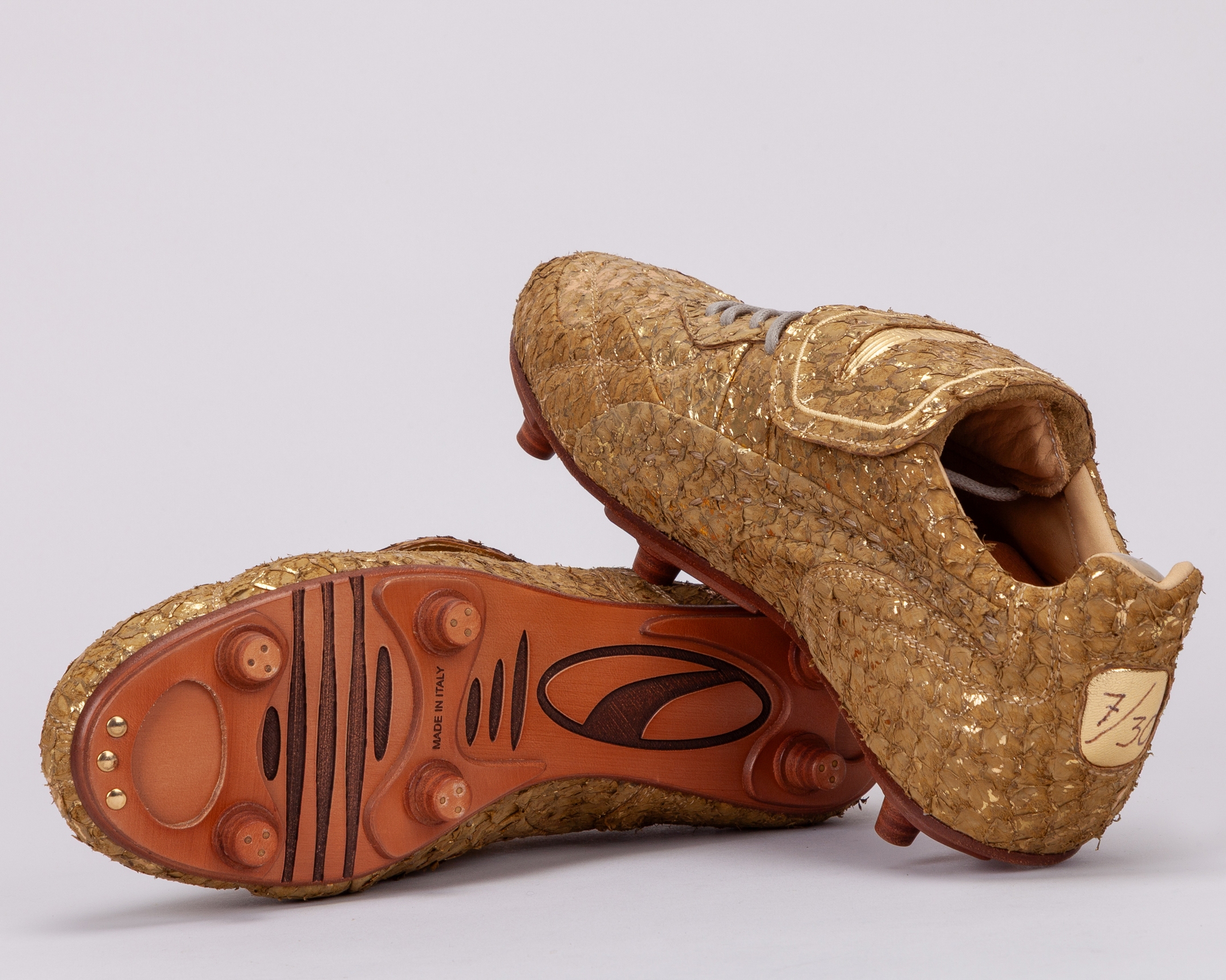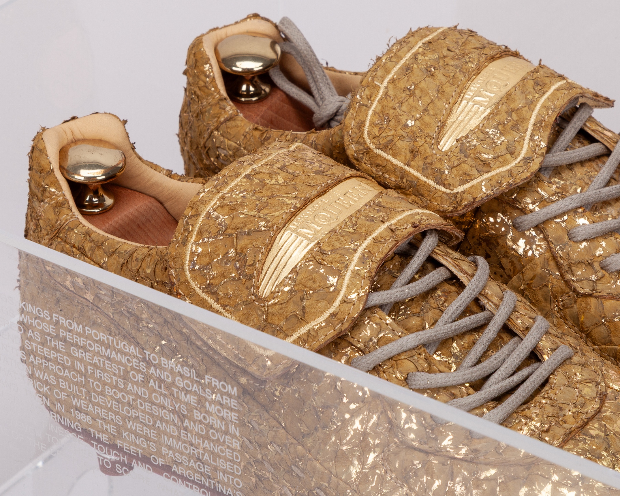 A rare pair of limited edition Alexander McQueen gold-coloured fish skin Puma King football boots, No.7 of edition of 30 only, the boots inscribed Alexander McQueen, the heels numbered 7/30, with reference book and perspex display case