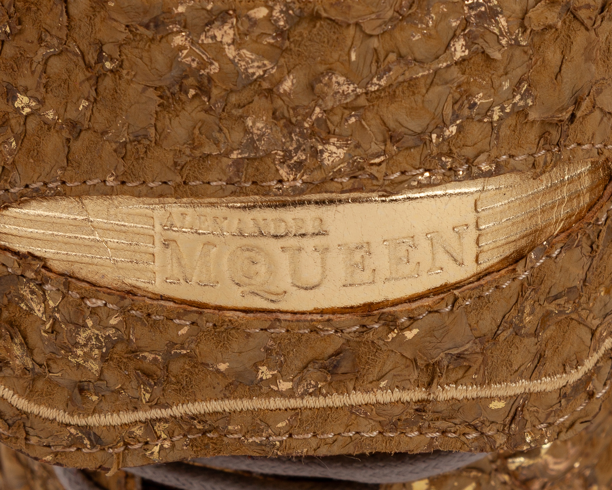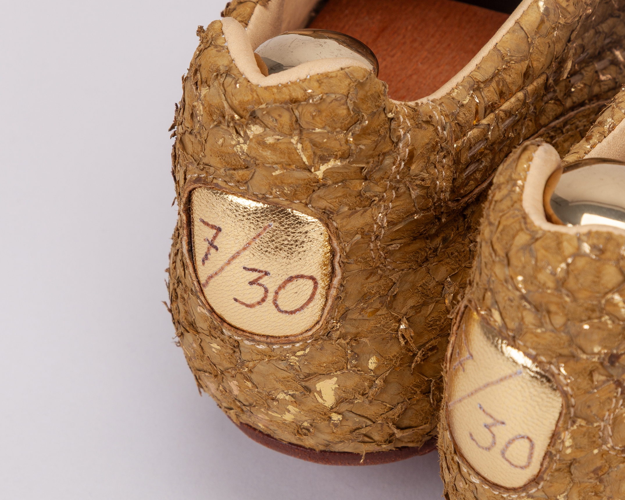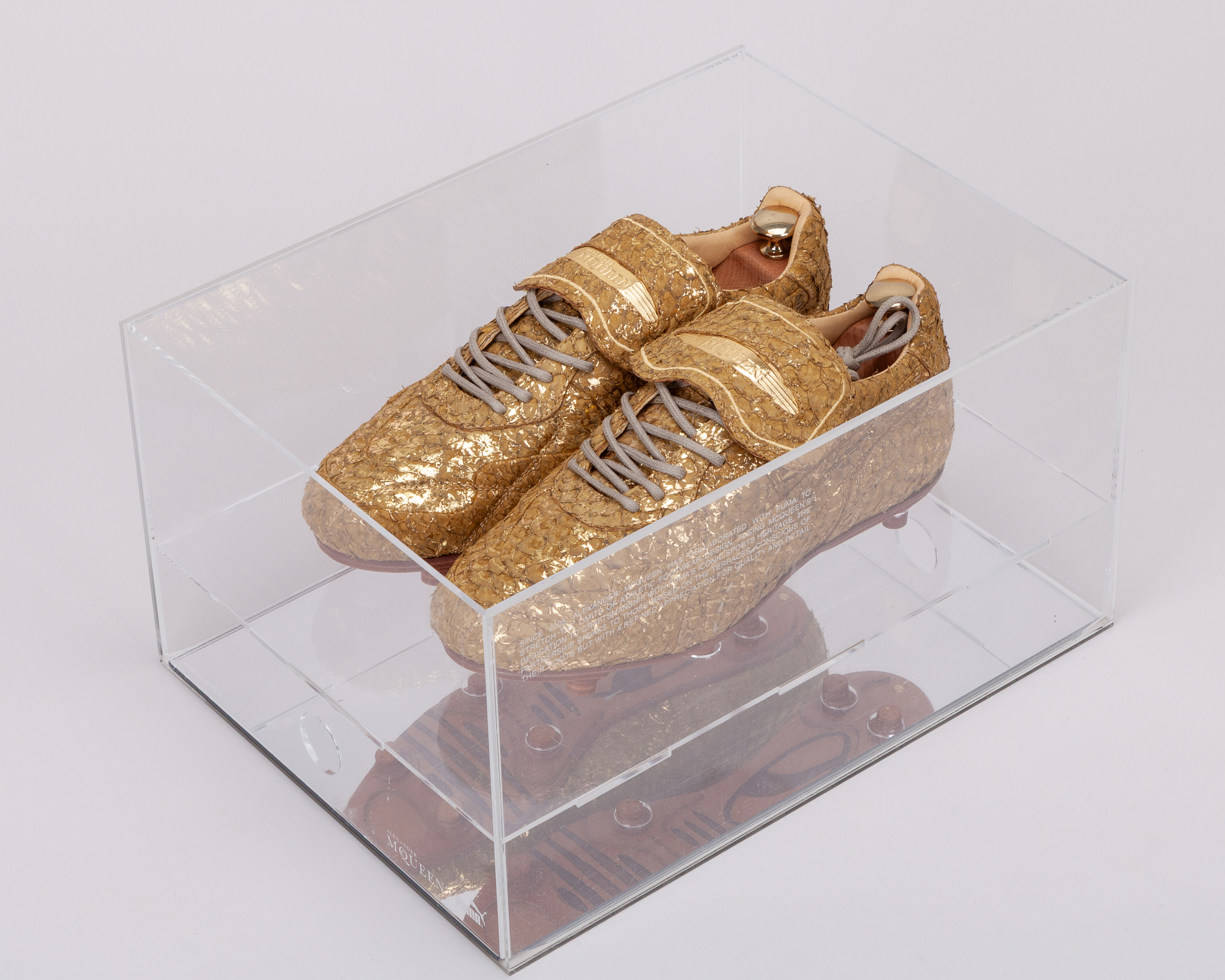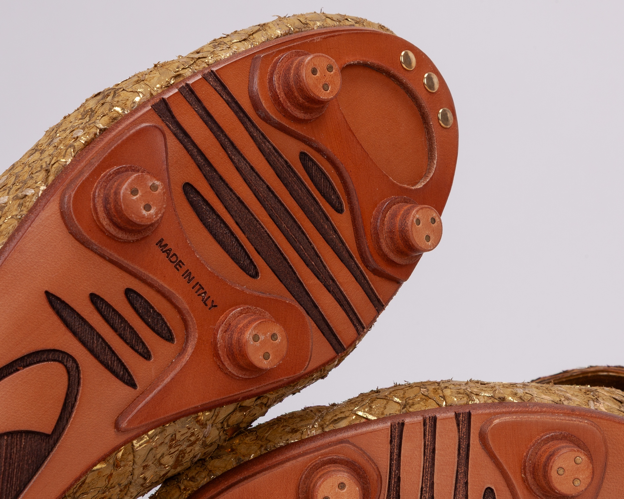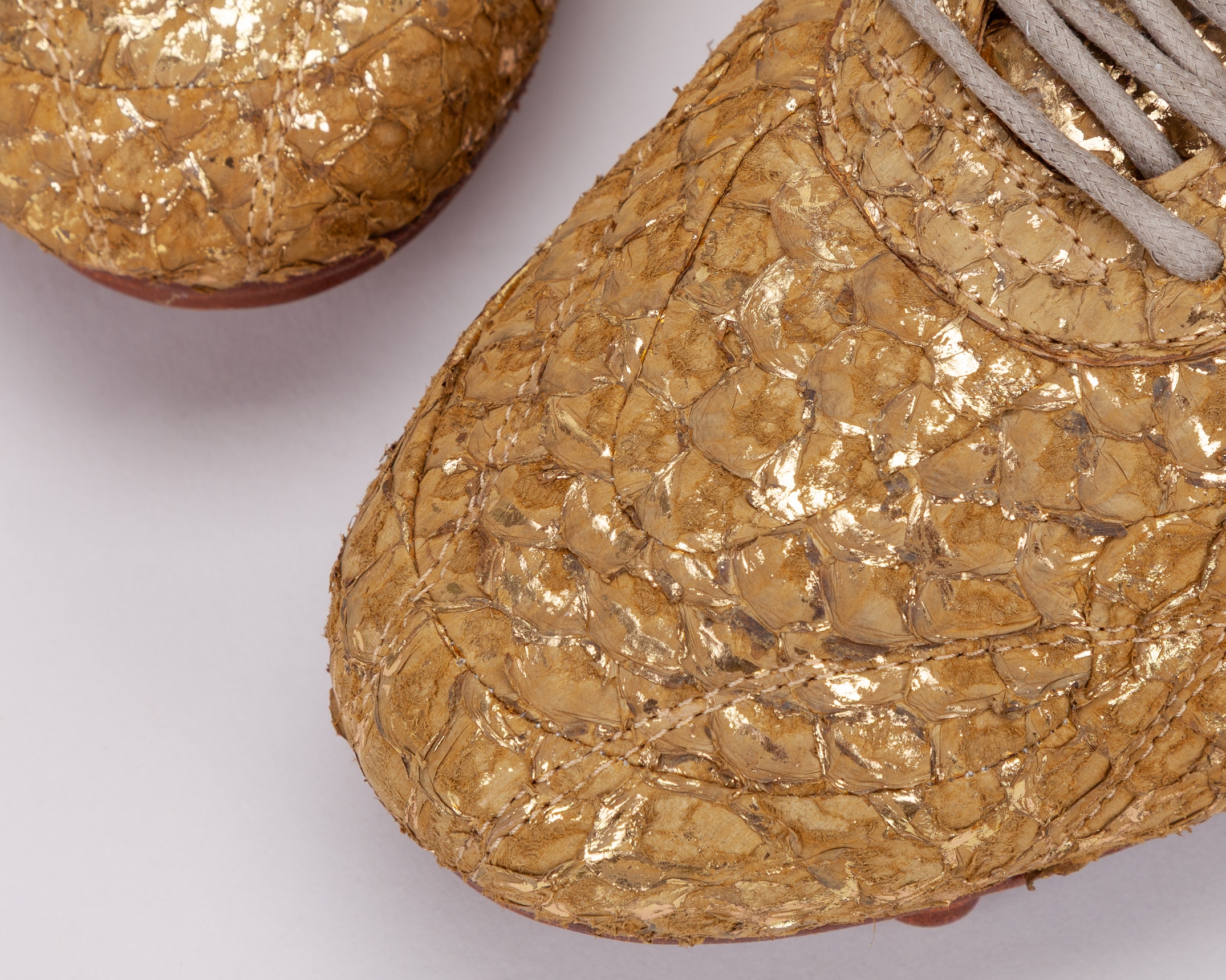 A rare pair of limited edition Alexander McQueen gold-coloured fish skin Puma King football boots, No.7 of edition of 30 only, the boots inscribed Alexander McQueen, the heels numbered 7/30, with reference book and perspex display case