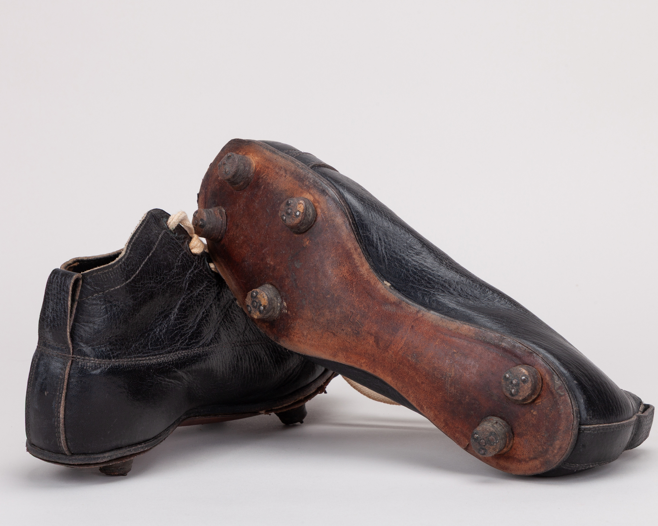 Two pairs of vintage leather football boots comprising, pair of vintage black leather football boots and a pair of brown leather football boots