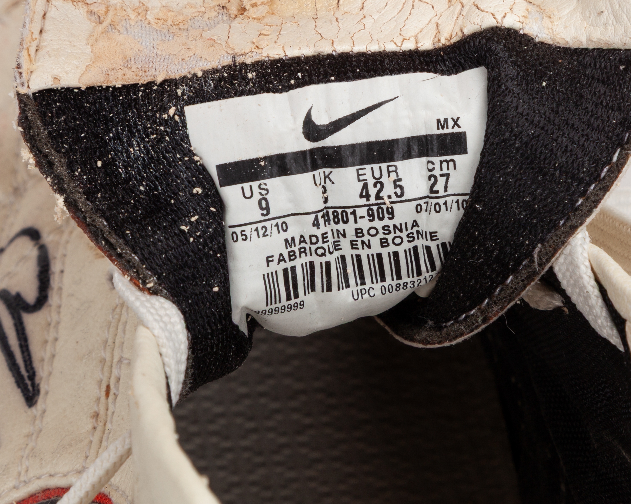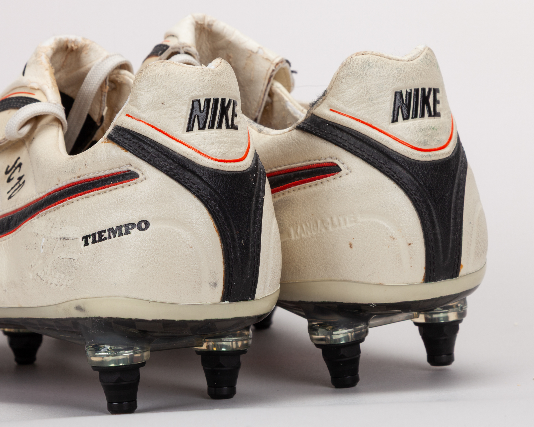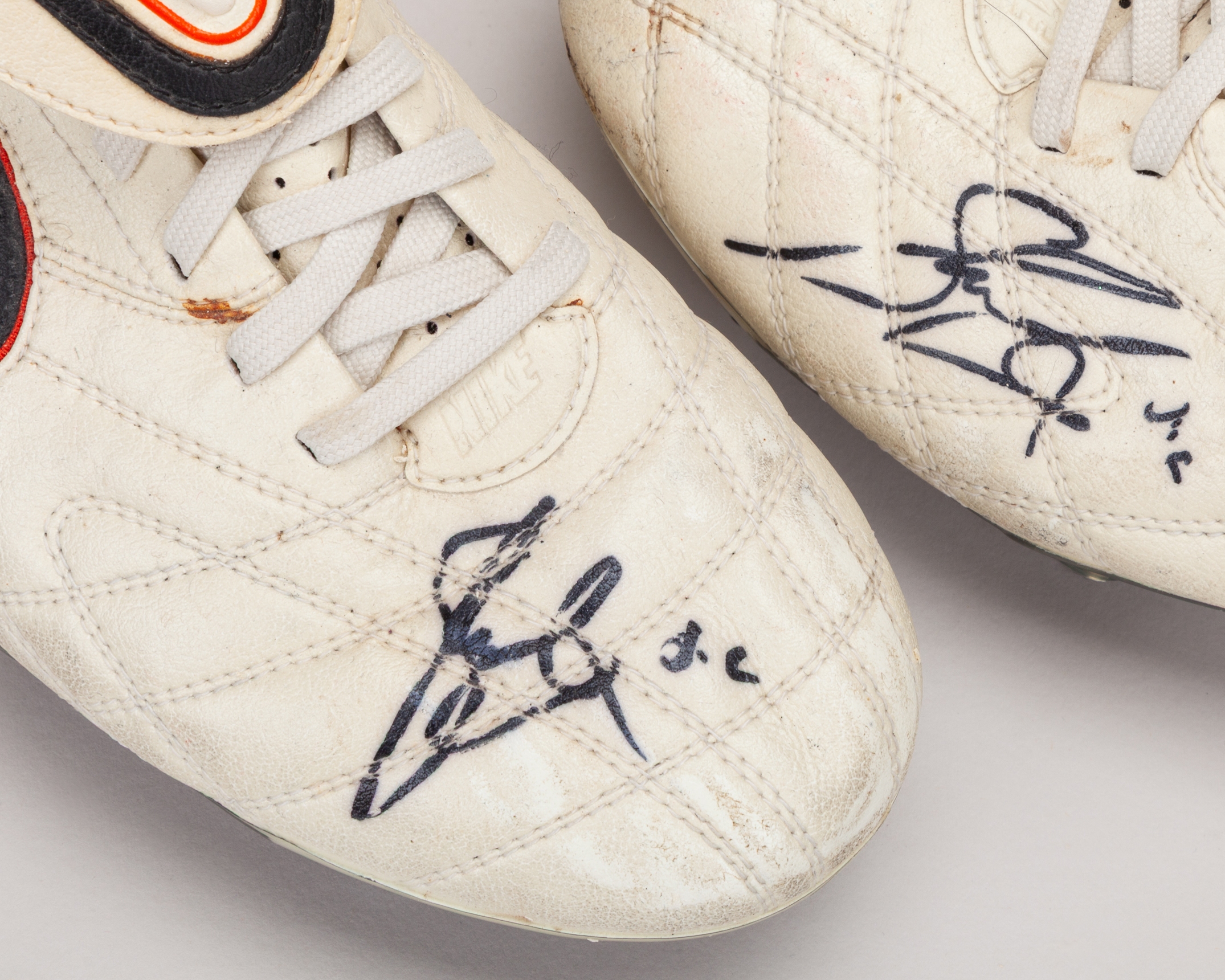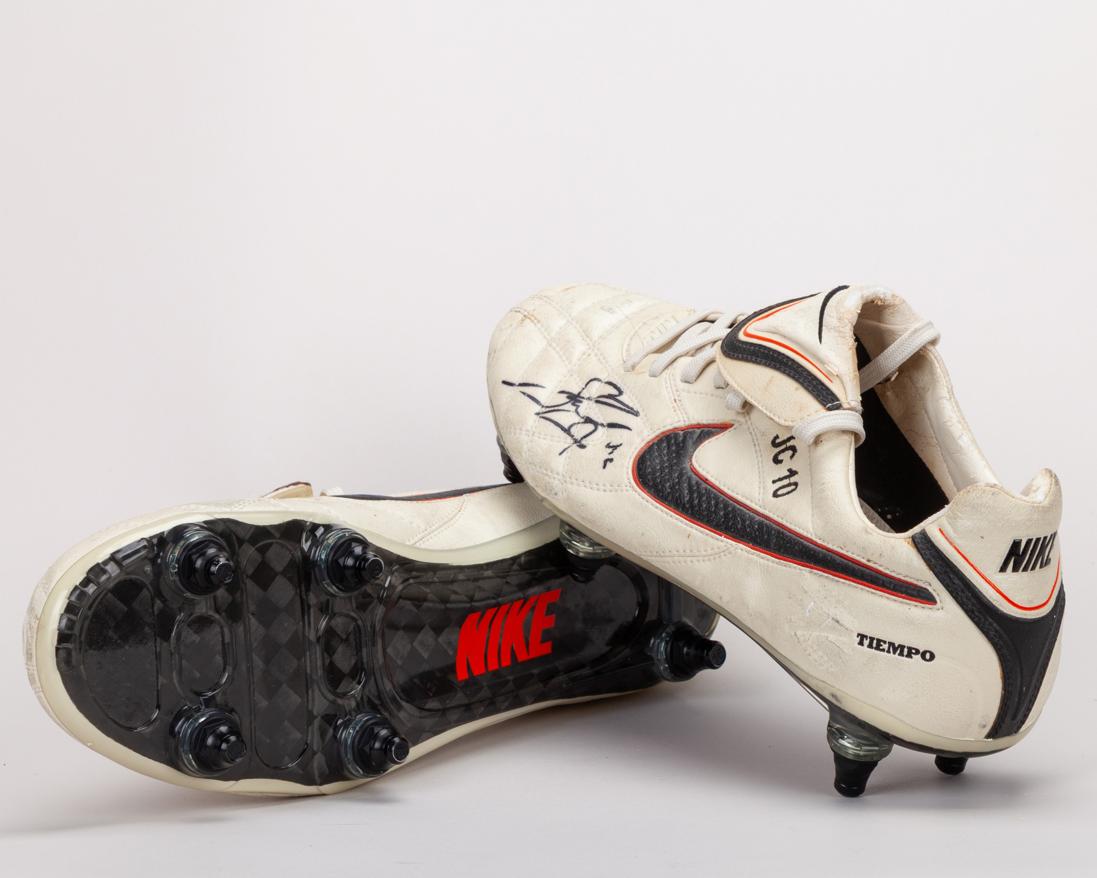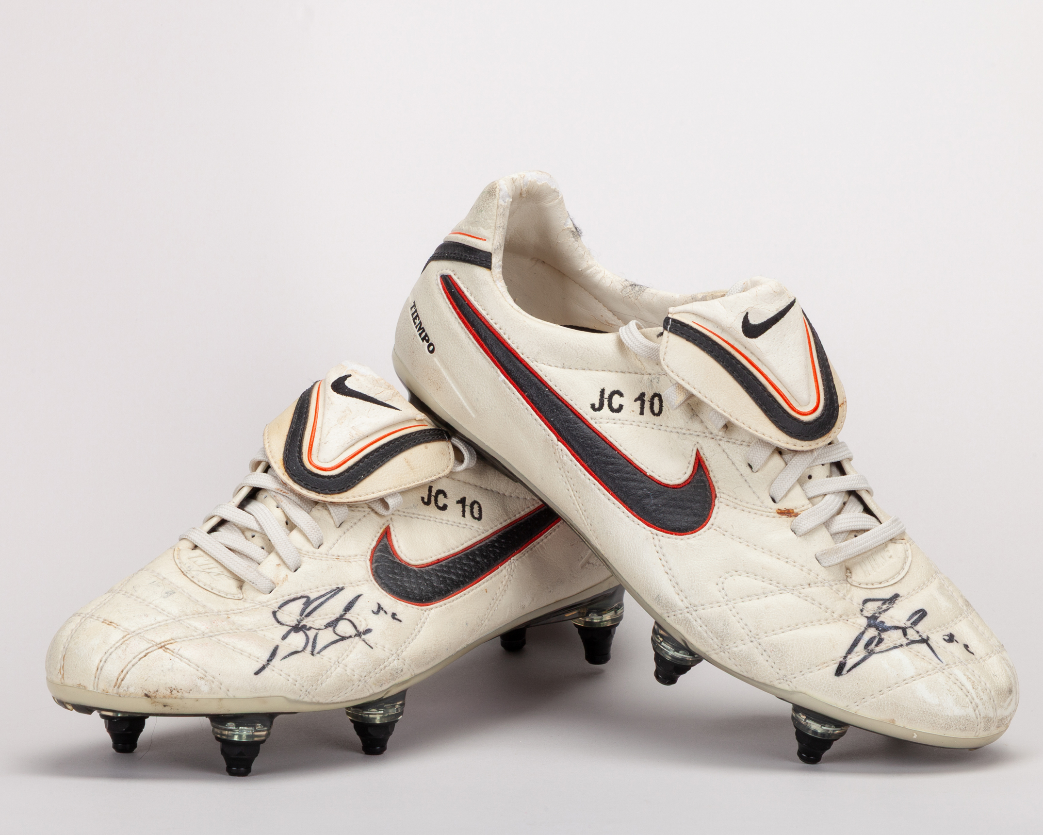 Joe Cole white and black Nike Tiempo autographed football boots, UK8, inscribed JC 10, with both boots autographed on the toe, with signs of wear and discolouration