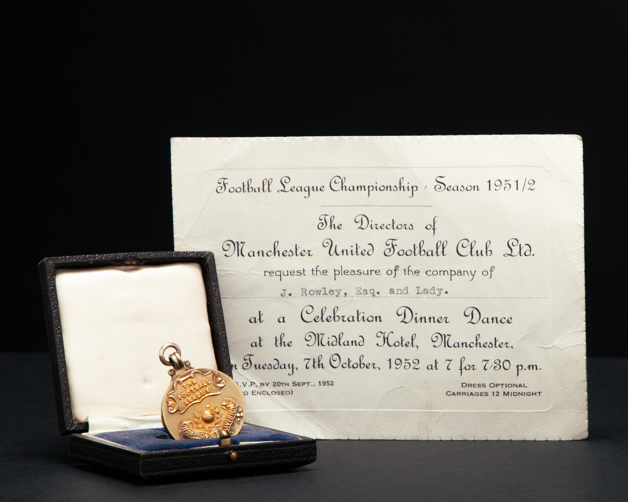 Jack Rowley silver-glit 1952 Division 1 League Champion Winners medal, the obverse inscribed THE FOOTBALL LEAGUE CHAMPIONS DIVISION 1, the reverse inscribed SEASON 1951-52, MANCHESTER UNITED F.C. J. ROWLEY, in original fitted case, with invitation to celebration dinner, (2)