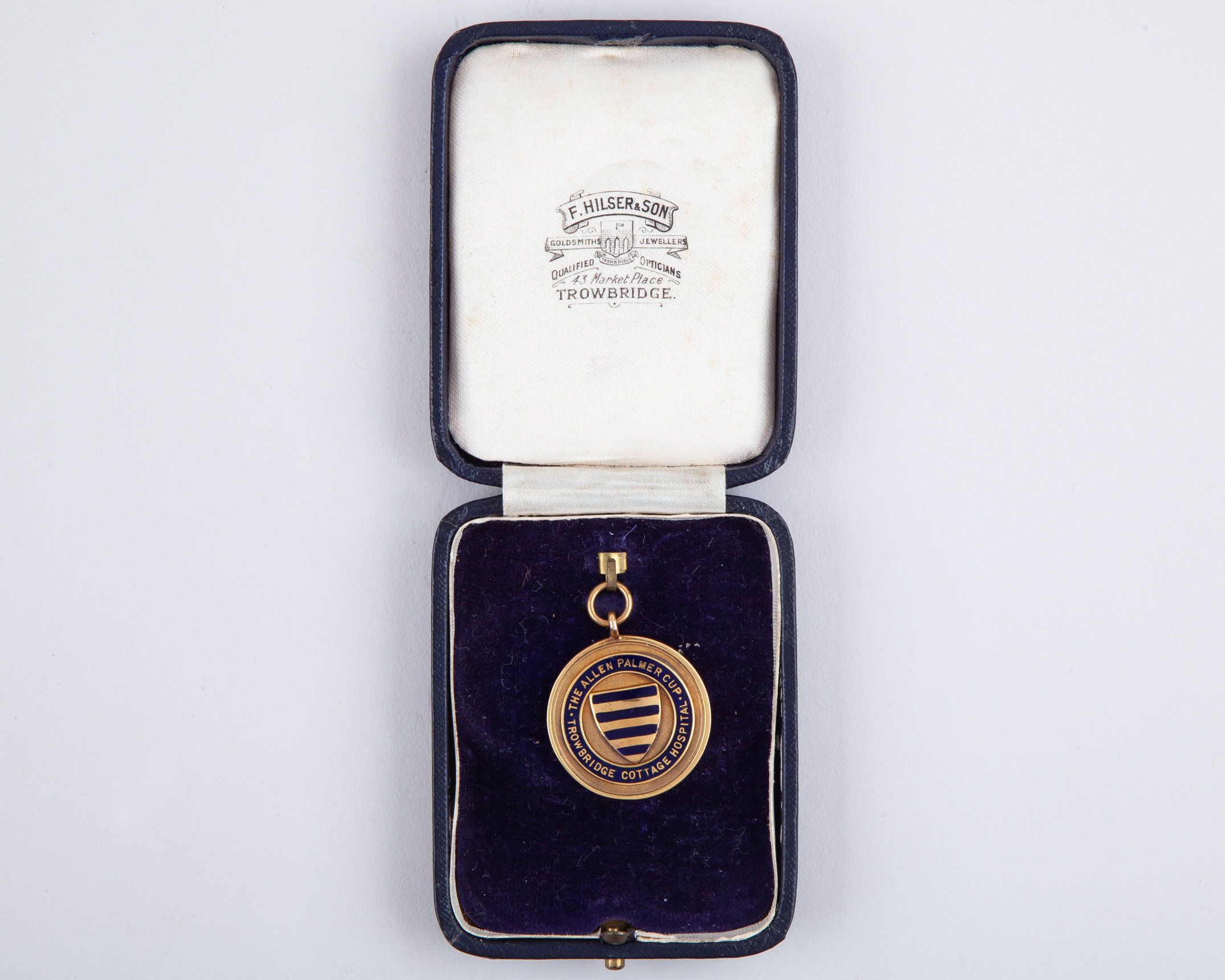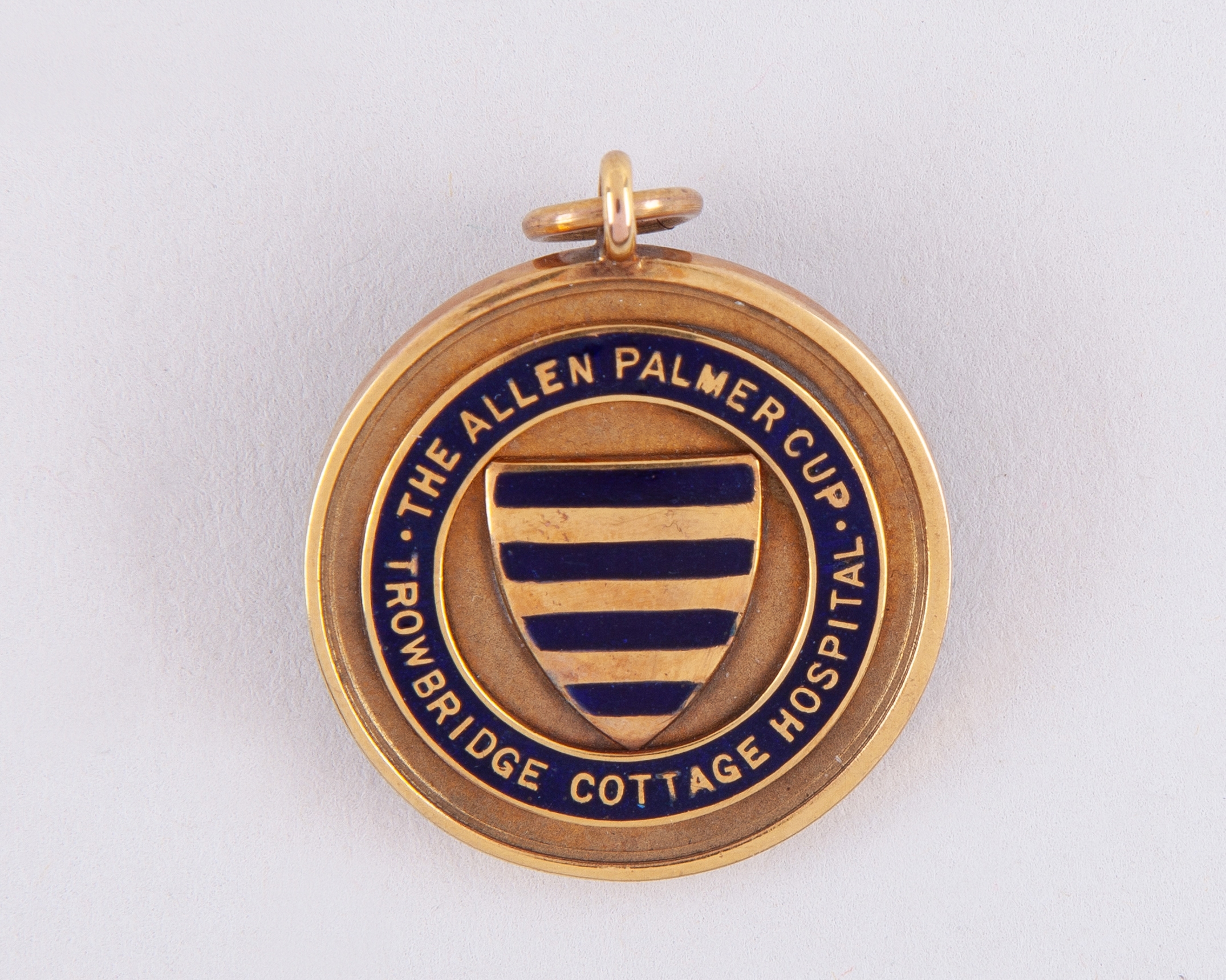 Jack Rowley 9ct gold and enamel Trowbridge Cottage Hospital medal, 1936-37