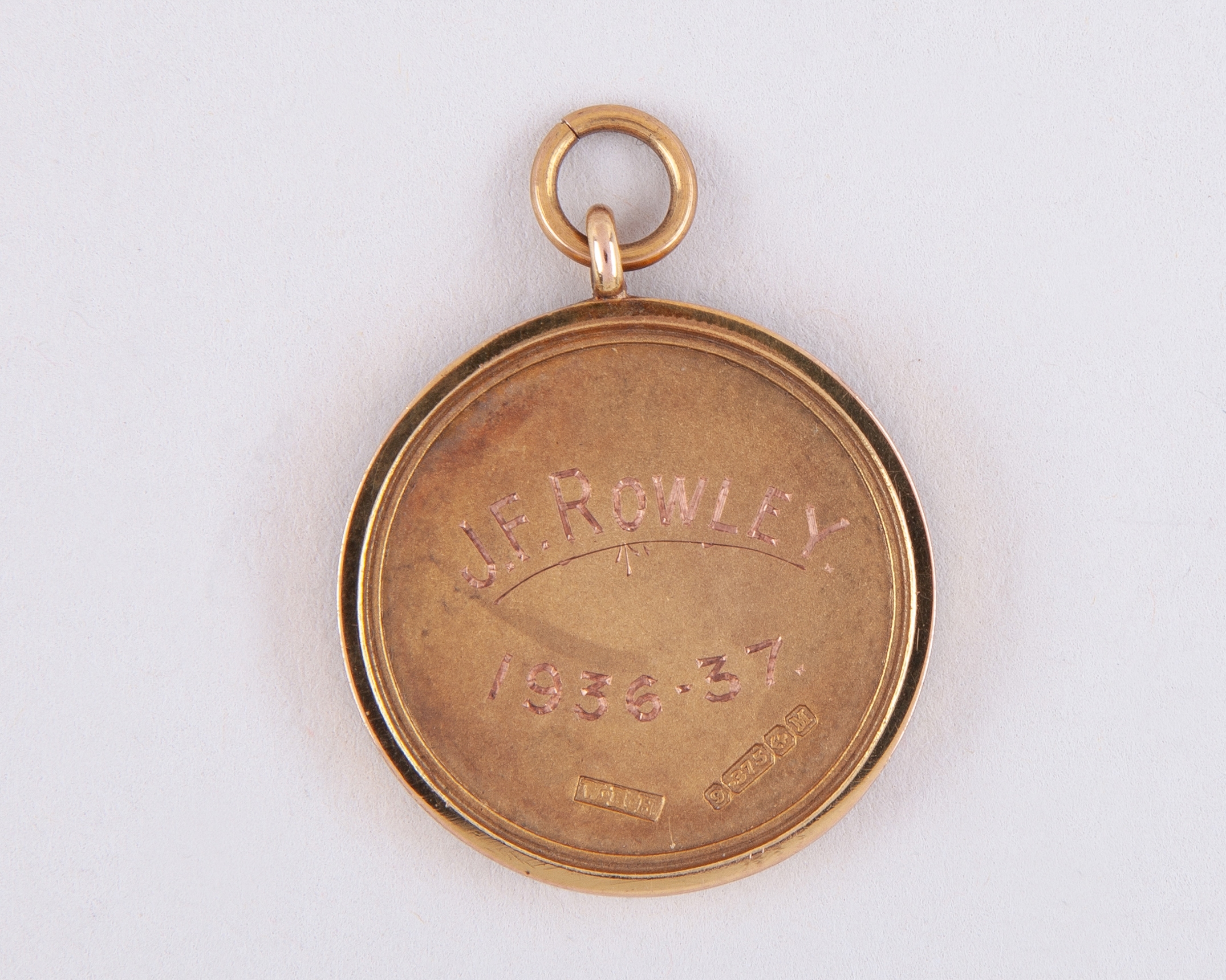 Jack Rowley 9ct gold and enamel Trowbridge Cottage Hospital medal, 1936-37, the obverse inscribed THE ALLEN PALMER CUP TROWBRIDGE COTTAGE HOSPITAL, the reverse inscribed J.F. ROWLEY, in original case