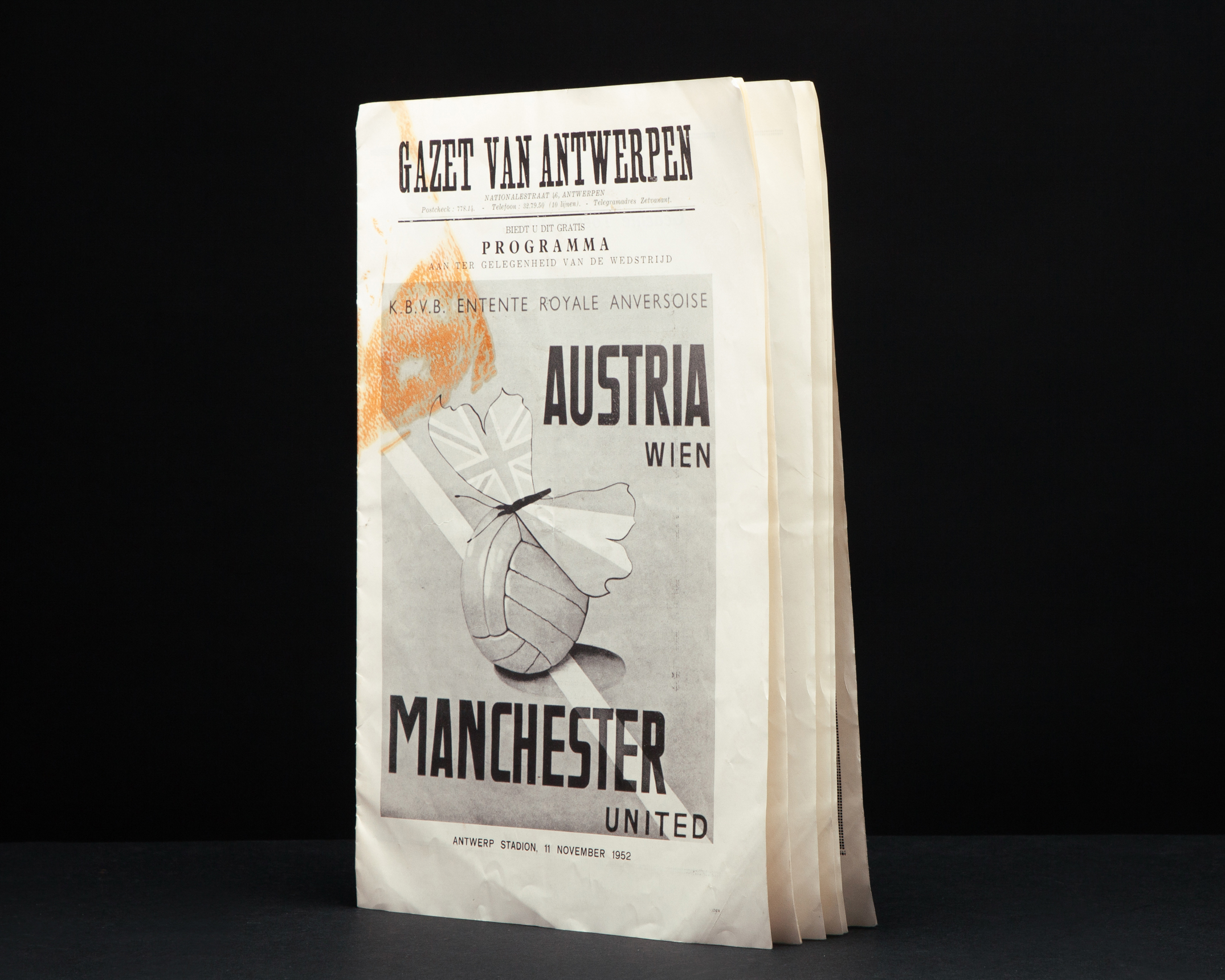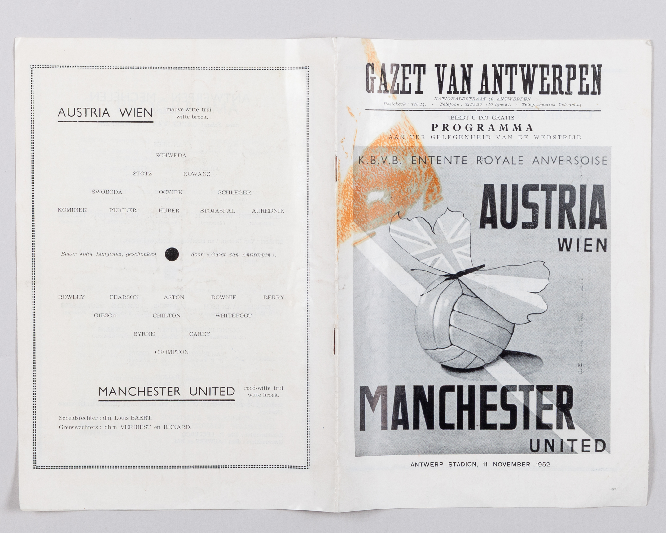 Jack Rowley scarce Austria Wien v. Manchester United match programme, 11th November 1952, match played in Antwerp, Belgium, few copies exist and it very seldom appears in auction, 16 pages, staining to cover and internal pages