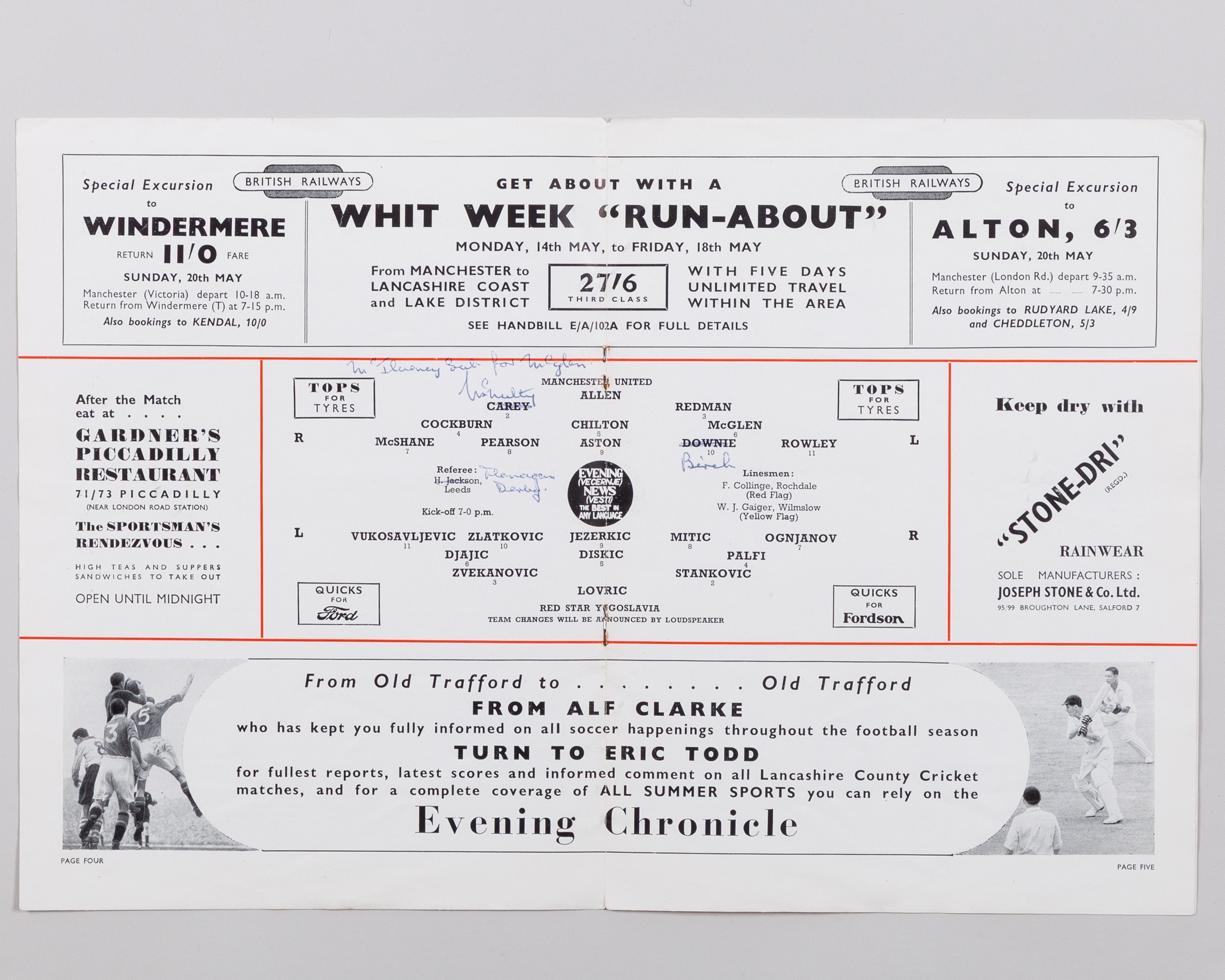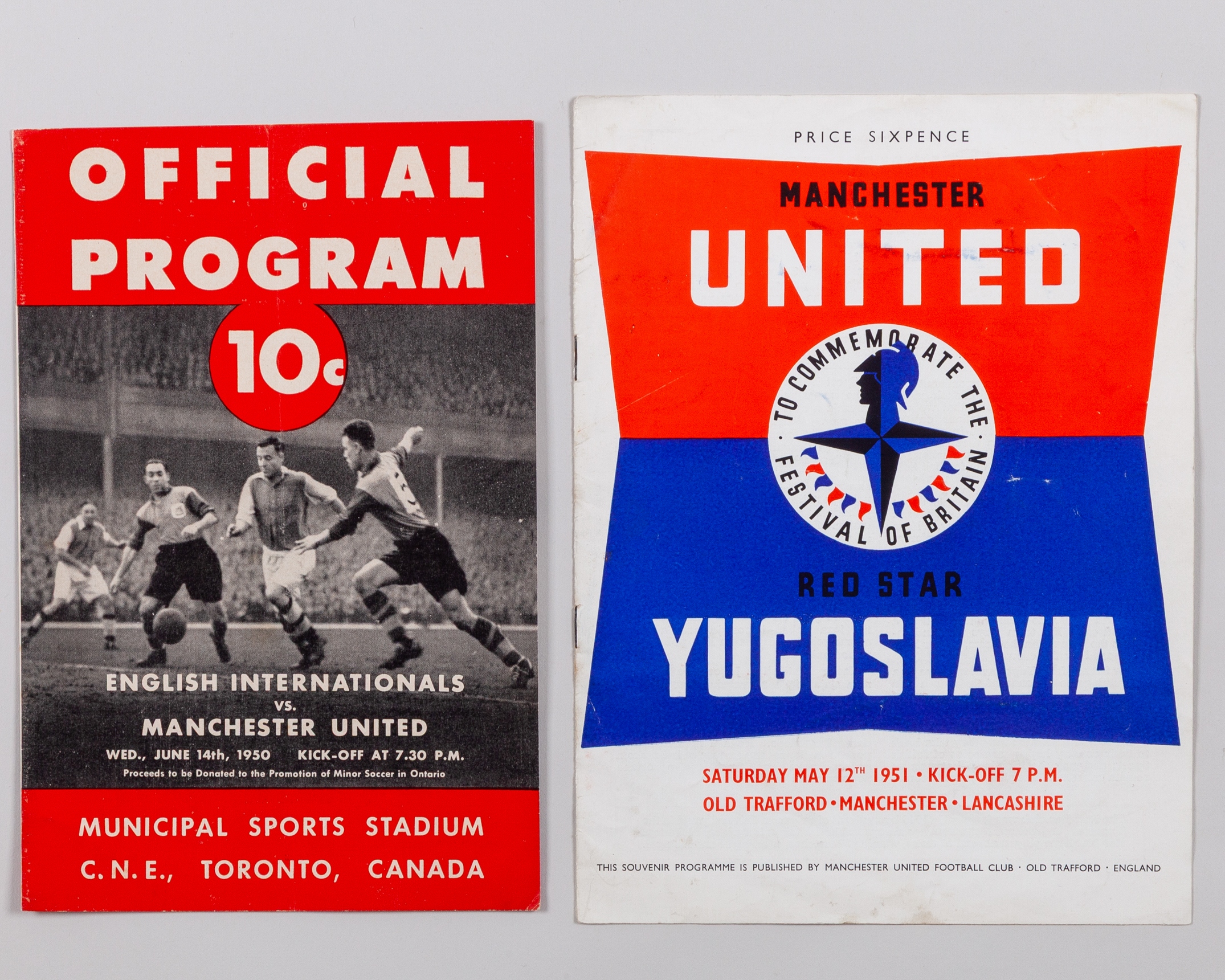Jack Rowley English Internationals v. Manchester United, Tour Match Programme, 14th June 1950 played in Toronto, Canada, fold and tear to back cover and Manchester United v. Red Star Belgrade, Festival of Britain programme, 12th May 1951 (2)