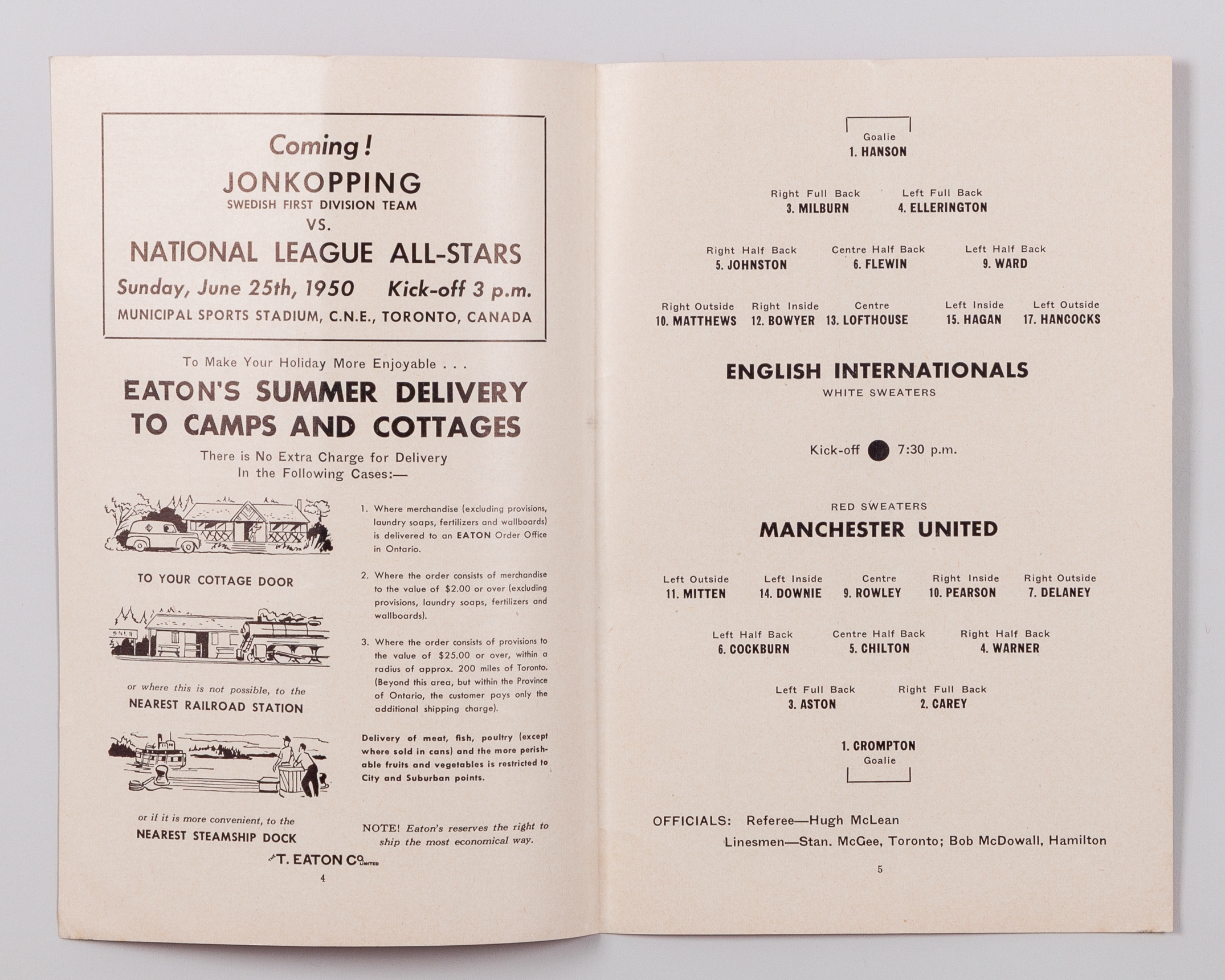 Jack Rowley English Internationals v. Manchester United, Tour Match Programme, 14th June 1950